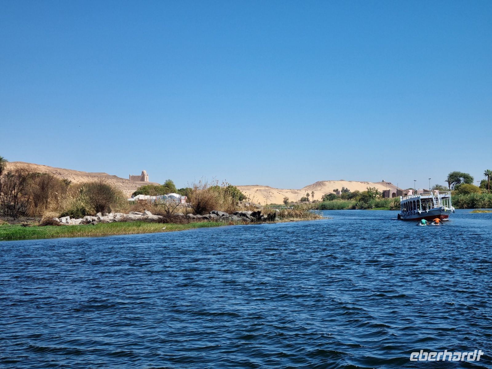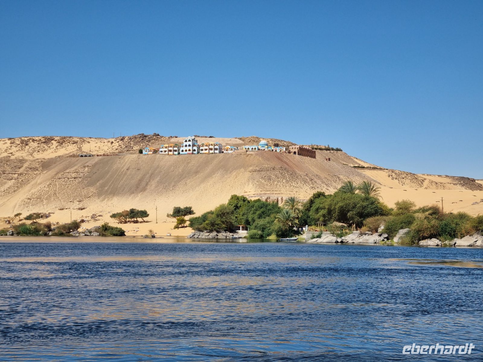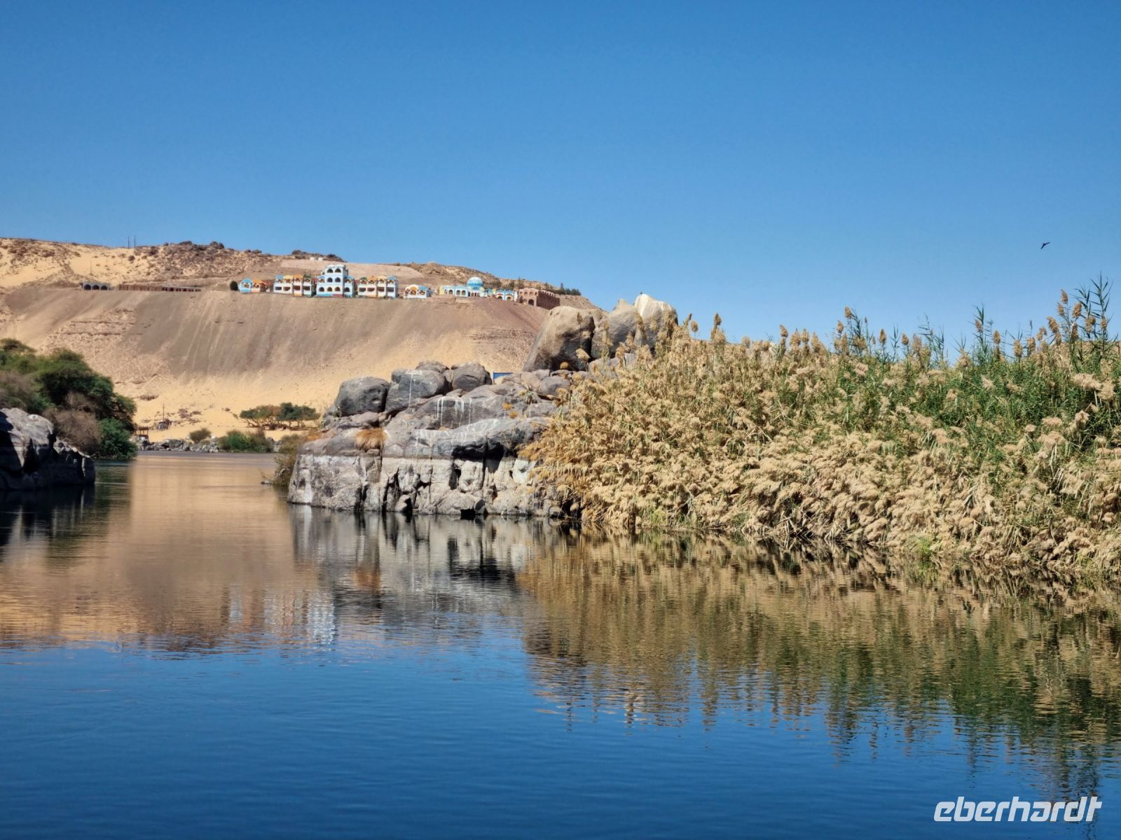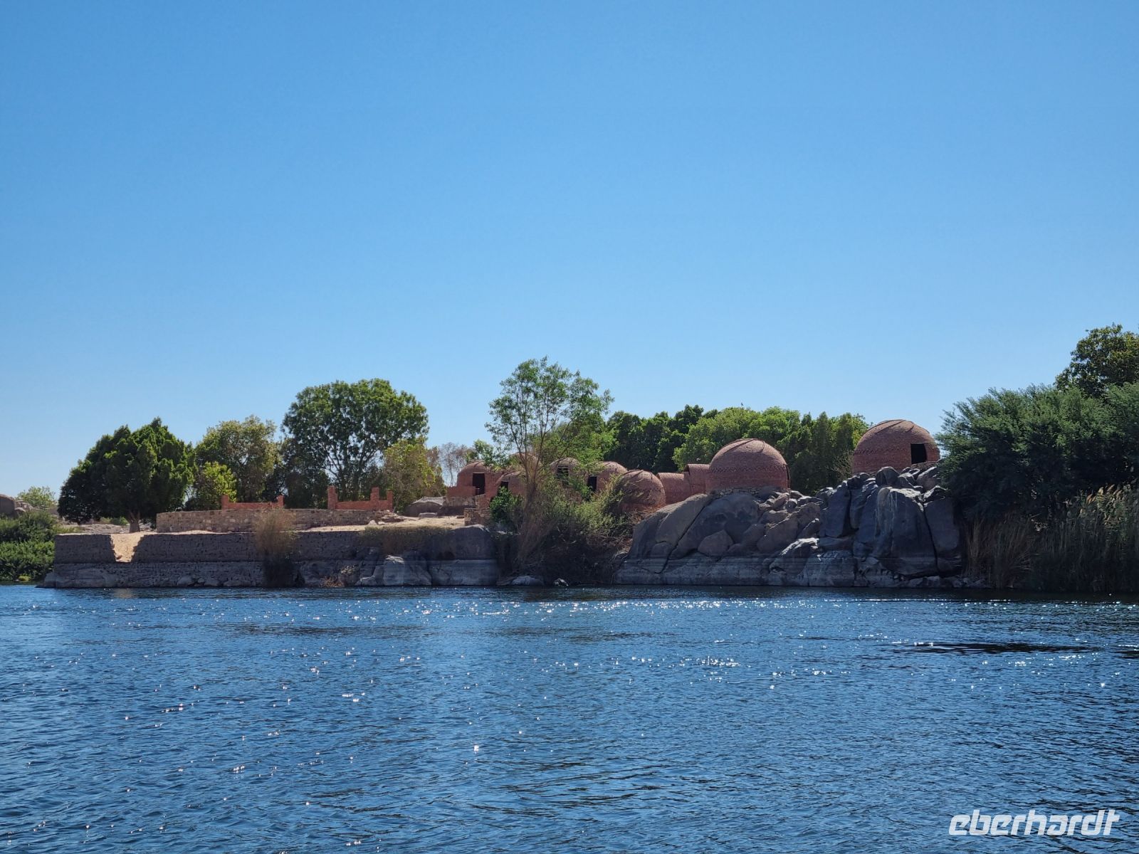 Ausnahmsweise konnten wir heute etwas länger schlafen und später frühstücken, denn unser heutiger Ausflug begann erst um 9 Uhr. Mit einem Motorboot fuhren wir in das Naturschutzgebiet Salouga und Ghazal, in dem wir einige Wasservögel sahen. Unser Ziel war das nubische Dorf mit dem Namen Nagaa Al Mahata. Im Zusammenhang mit dem Bau des Hochdamms mussten viele nubische Familien ihre Heimat verlassen und wurden zum Teil in der Nähe von Assuan neu angesiedelt. Das Dorf machte zunächst einen etwas verschlafenen Eindruck, wir sahen bemalte Häuser und eine Frau kam mit ihren Handarbeiten, die sie an uns verkaufen wollte. Auch einige Kinder begegneten uns, an die wir ein paar Süßigkeiten und Spielzeug verschenkten. Auf der Rückfahrt warfen wir dann einen Blick auf das traditionsreiche Hotel "Old Cataract", in dem unter anderem Agatha Christie logierte und an ihrem Kriminalroman "Tod auf dem Nil" schrieb. Auch ein Nilometer kam in unser "Schussfeld", die Priester des alten Ägypten maßen damit die Höhe der zu erwartenden Nilflut und die Überschwemmung mit Nilschlamm. dies erlaubte die Vorhersage der möglichen Ernten und damit auch die Berechnung der zu entrichtenden Steuern.