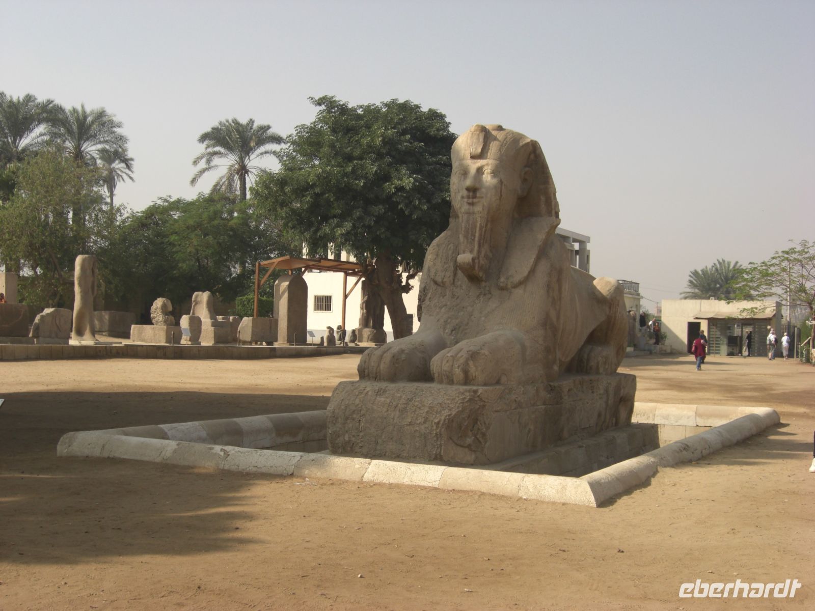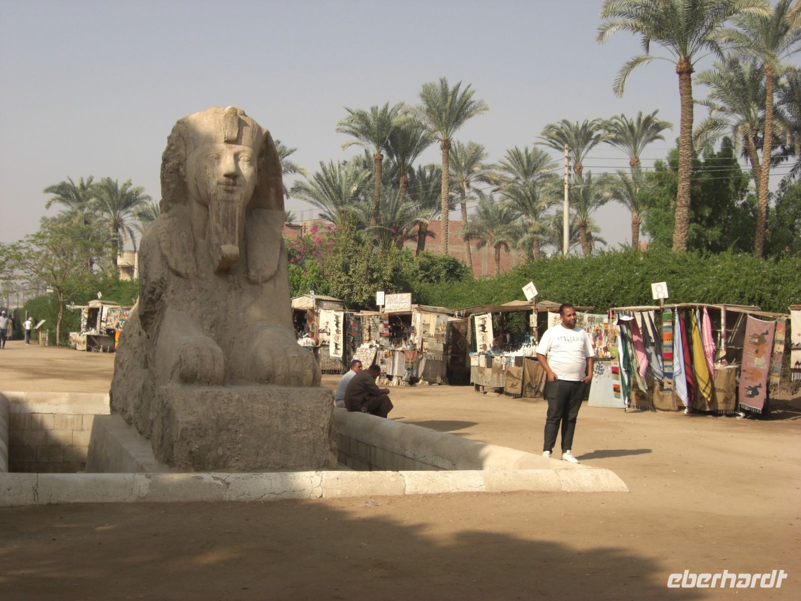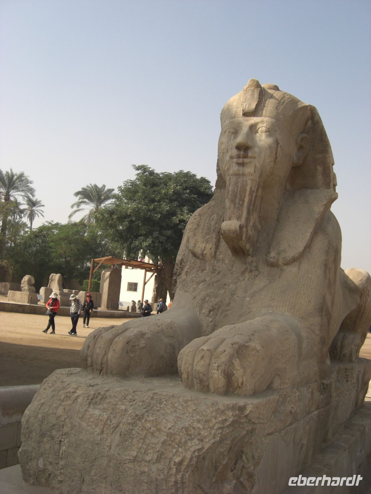 Wir fahren als erstes zur Stufenpyramide Sakkara, der Totenstätte der einstigen Residenzstadt Memphis. Die Stufenpyramide ist die 1. Pyramide der Welt, 2700 v. Christi gebaut. Sie ist die Grabstätte des Königs Djoser aus der 3. Dynastie des alten Reiches. Sie besteht aus 6 übereinander gebauten sogenannten Mastabas, die bis zum Himmel reichen sollen. Auch das dazu gehörige Mastaba Grab von 2223 v. Christi besichtigen wir. Es sind die besterhaltendsten Wandreliefs Ägyptens, die Essam uns erläutert. Schwer nachzuvollziehen, dass sie so wenig geschützt sind. Wir fahren weiter nach Memphis der 1. Hauptstadt Ägyptens, die 300 v. Christi gegründet wurde. Einer der bedeutendsten Propheten des alten Testaments, Jeremia, hat den Untergang von Memphis vorausgesagt, was auch eintrat. Heute ist Memphis bedeutungslos, ein kleines Dorf. Von alten Zeiten zeugen die Sphinx und die 13m lange Figur von Ramses dem II. Ramses hatte 100 Kinder und nun wissen wir auch endlich, was „Ramses machen“ heißt. Tatsächlich, es gibt "die" und "der" Sphinx, je nachdem ob sie ein weibliches oder männliches Gesicht haben.