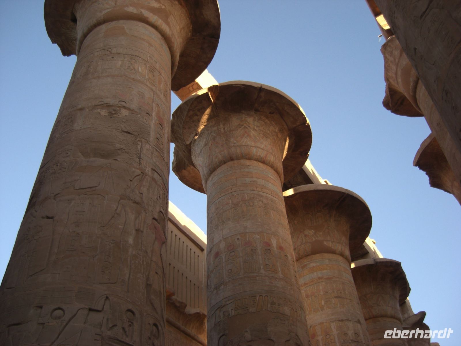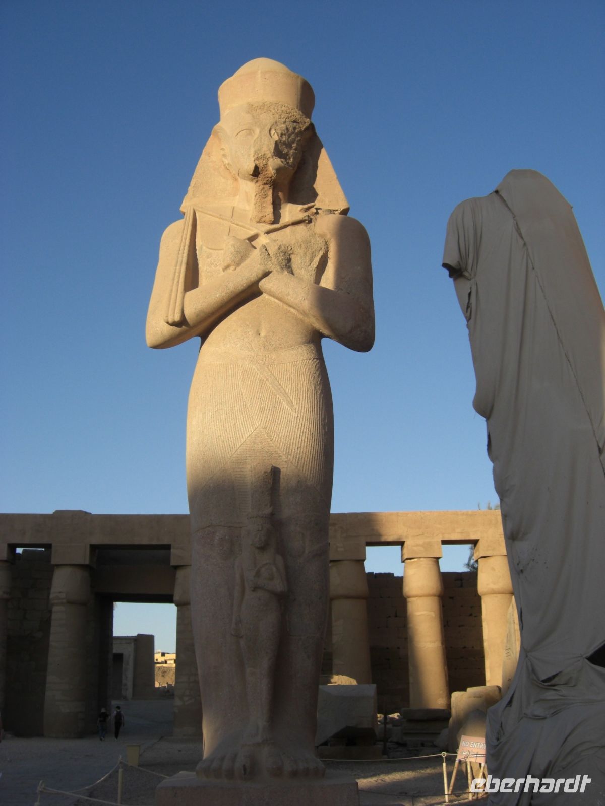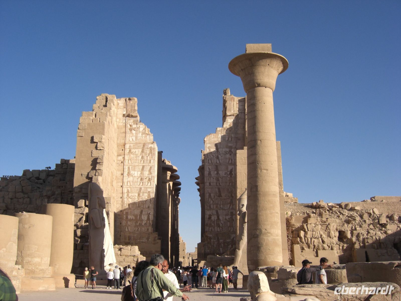 Auch der Karnak Tempel, die bedeutendste und größte Tempelanlage Ägyptens ist für viele ein Highlight der Reise. Karnak ist das einstige religiöse Zentrum der Pharaonen. Beindruckend ist der riesige Eingangspylon. Der Bau des Tempels begann im mittleren Reich als Amun Re zum Reichsgott ernannt wurde und zog sich über 1700 Jahre bis ins Neue Reich hin, wo er als Tempelkomplex erweitert wurde. Auch Amuns Gattin, der Göttin Muth und ihrem Sohn Chon wurde mit dem Tempelbau gehuldigt, denn diese bildeten die Triade von Theben.