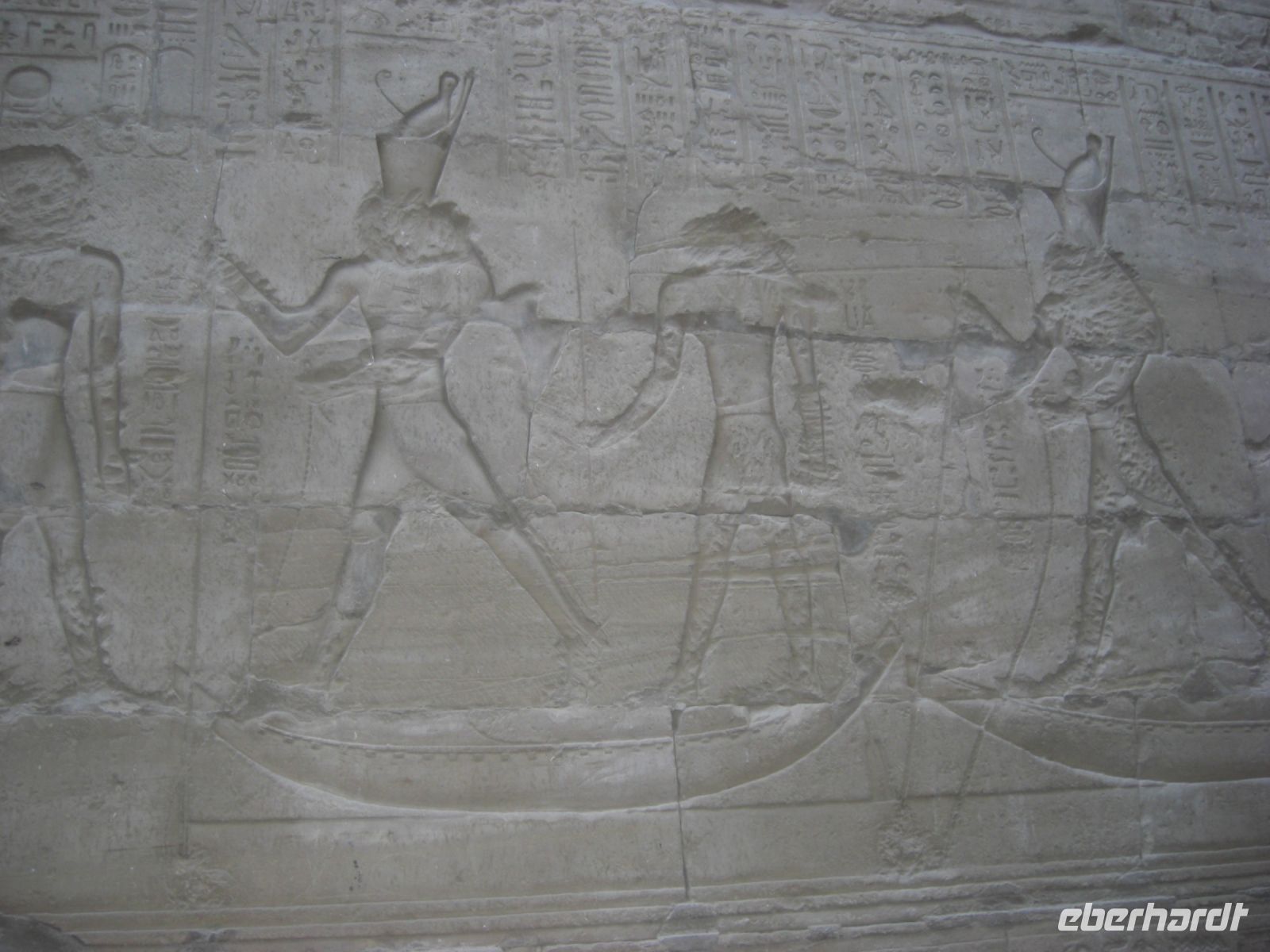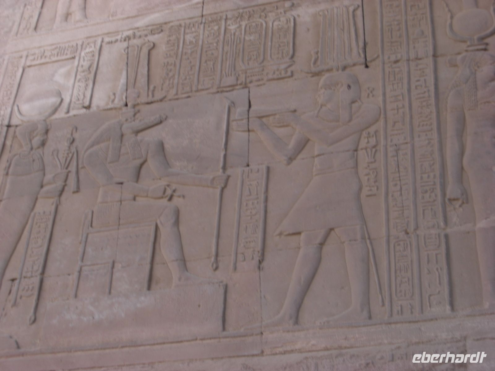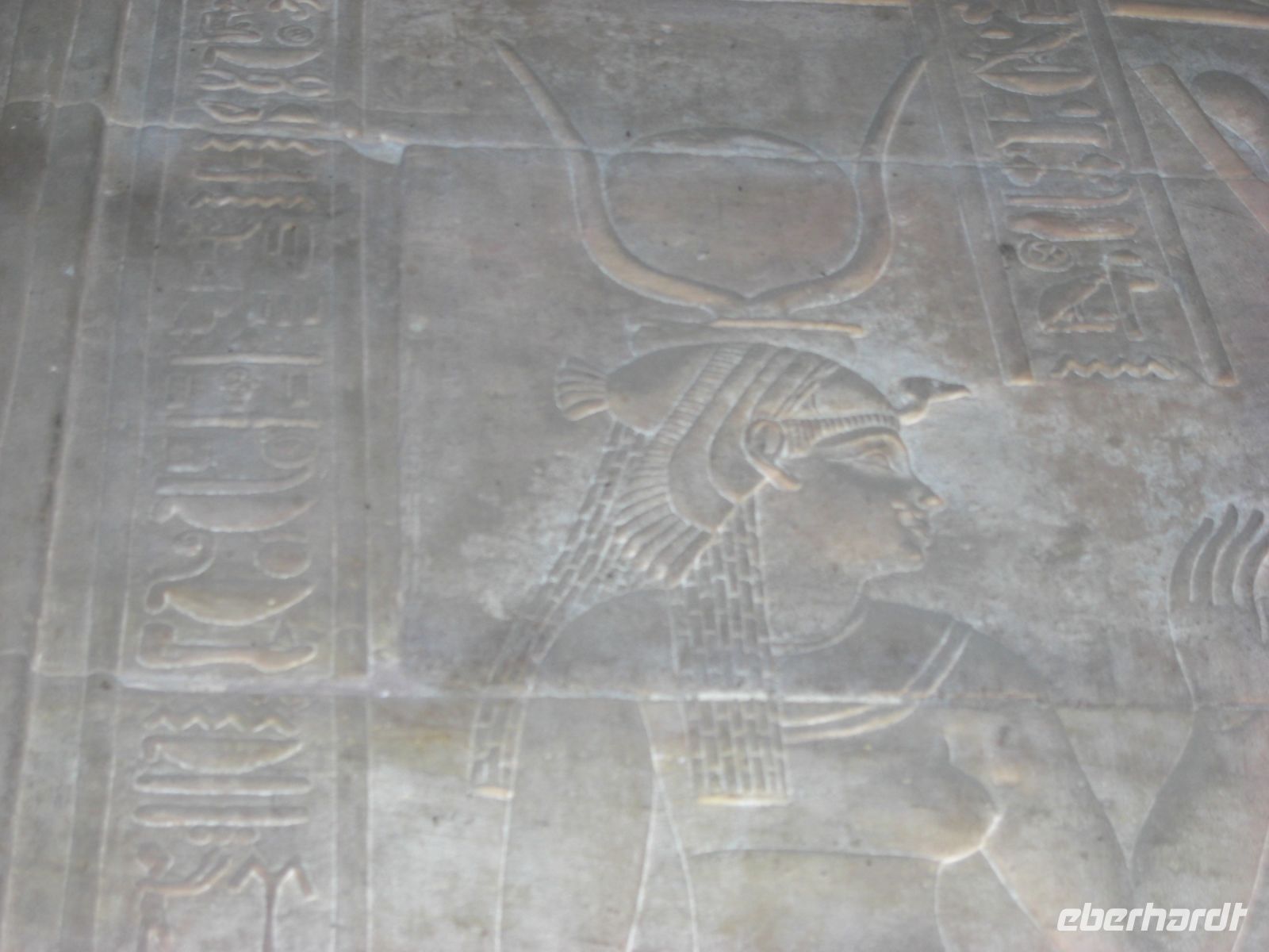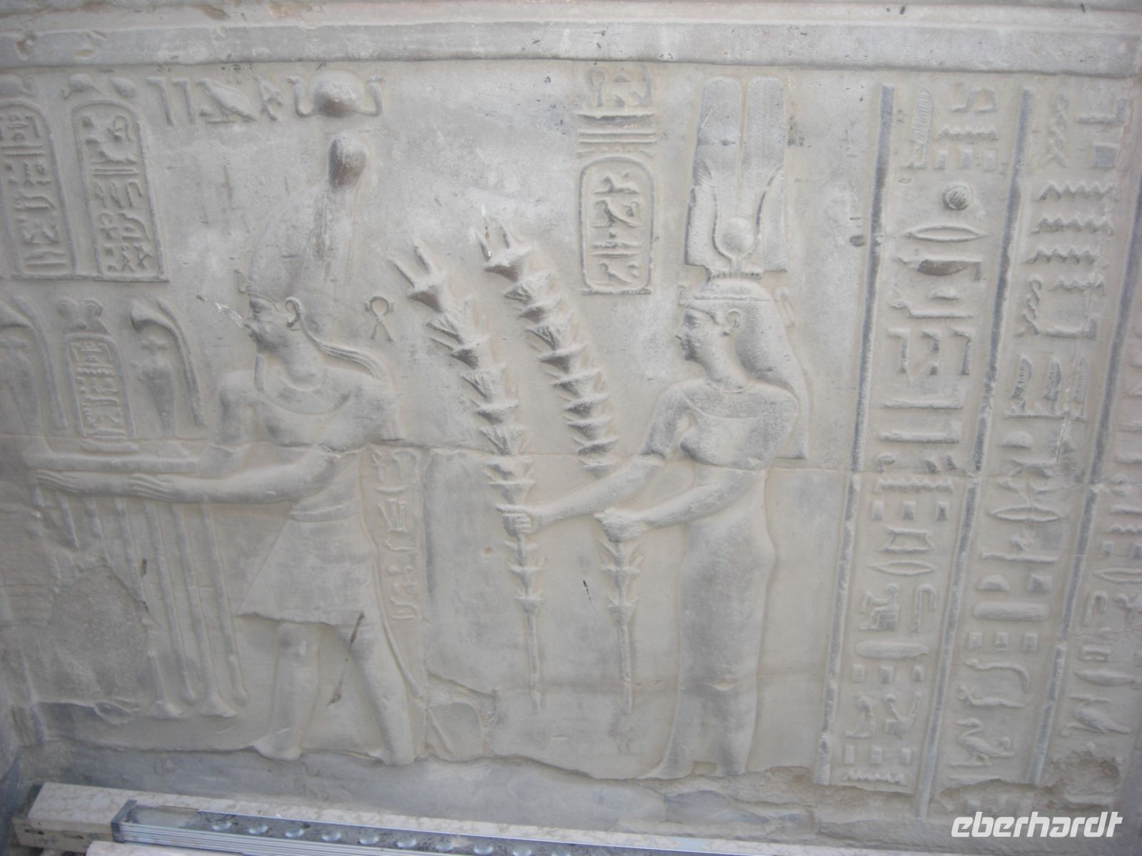 Reiseleiter Essam erklärt uns sehr eindrucksvoll die Wandreliefs. So haben die Griechen sich den Glauben der Götter zunutze gemacht, indem sie diese Reliefs erhielten und die Götter nicht ausradierten. Ein kluger Gedanke, der den Griechen 300 Jahre Herrschaft sicherte. Interessant, Essams Bezug zum Irak-Krieg.