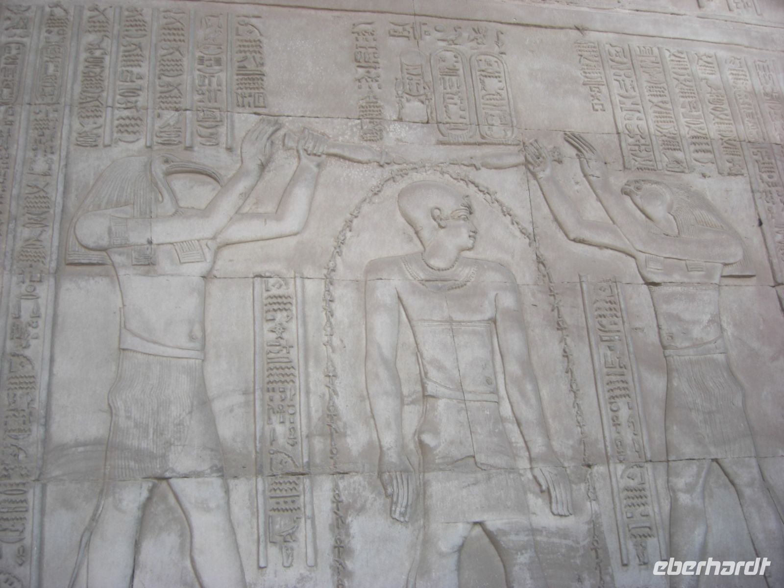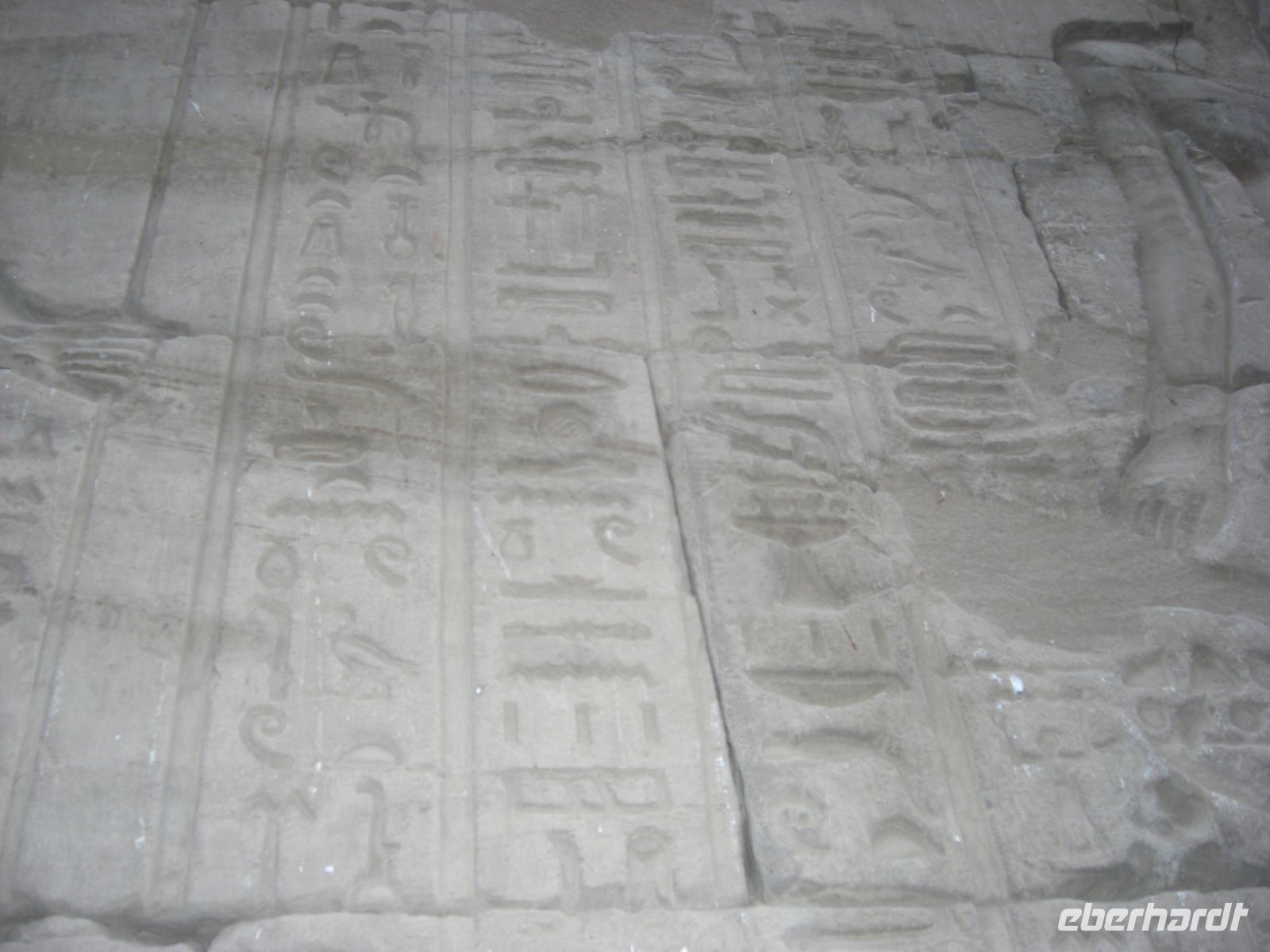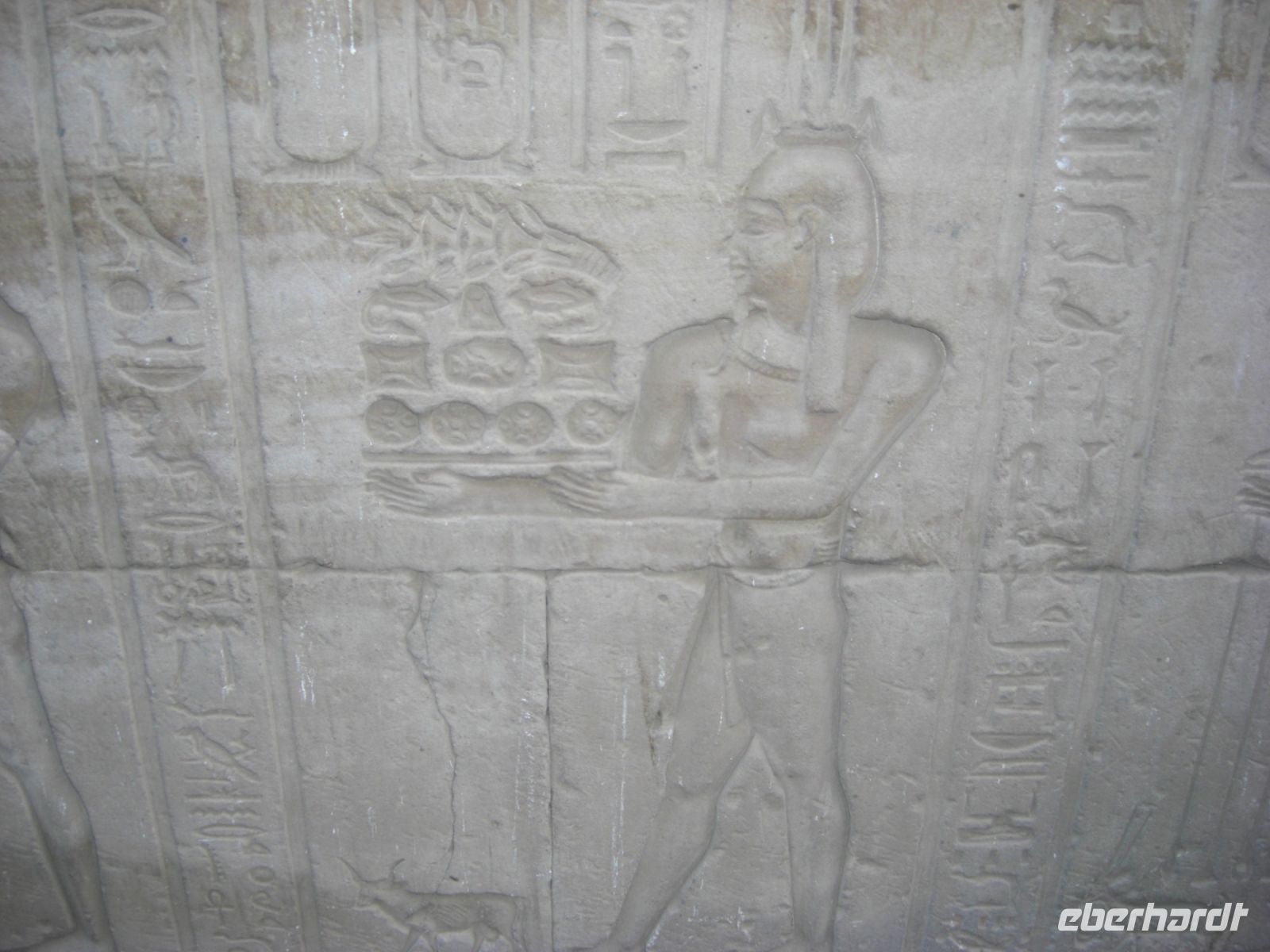 Reiseleiter Essam erklärt uns sehr eindrucksvoll die Wandreliefs. So haben die Griechen sich den Glauben der Götter zunutze gemacht, indem sie diese Reliefs erhielten und die Götter nicht ausradierten. Ein kluger Gedanke, der den Griechen 300 Jahre Herrschaft sicherte. Interessant, Essams Bezug zum Irak-Krieg.
