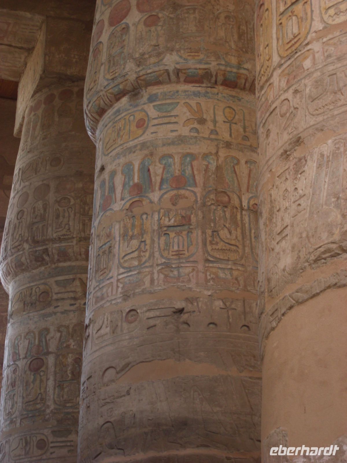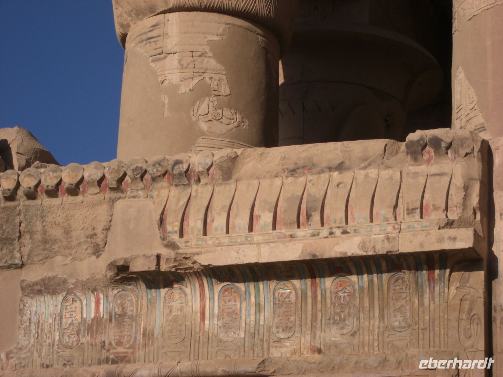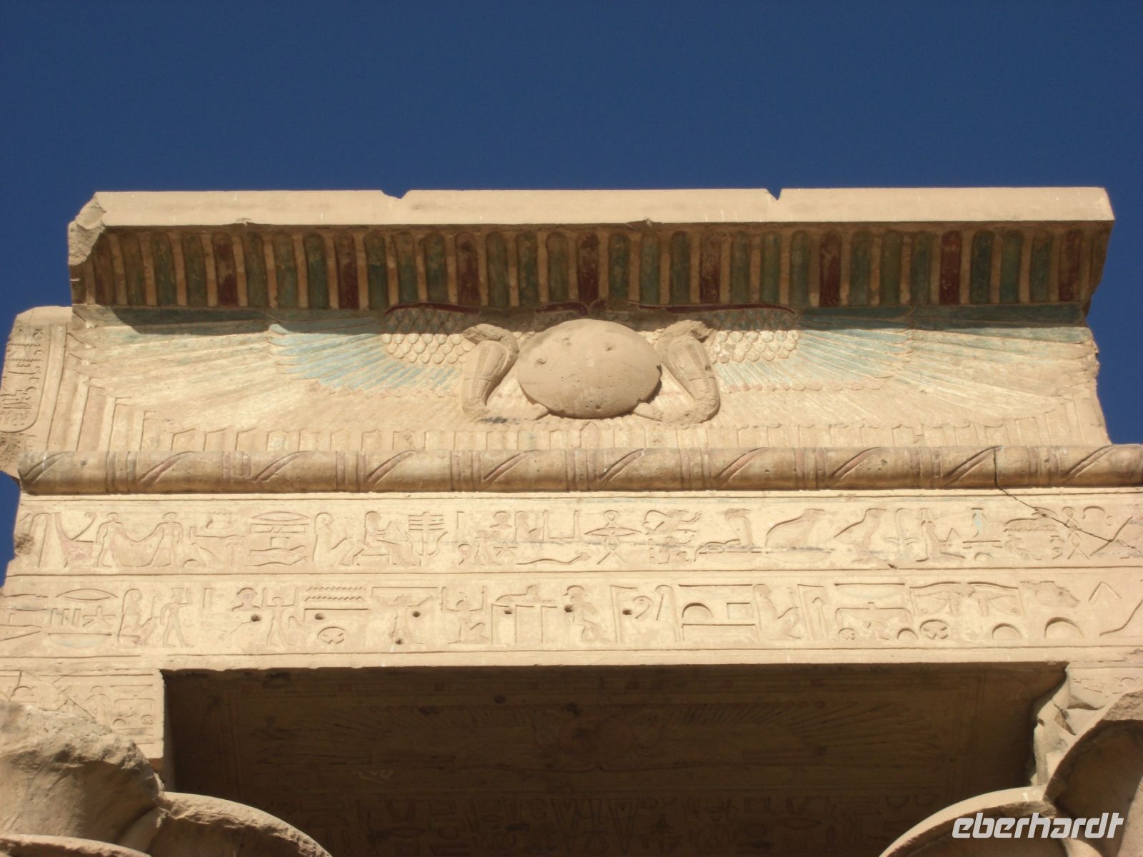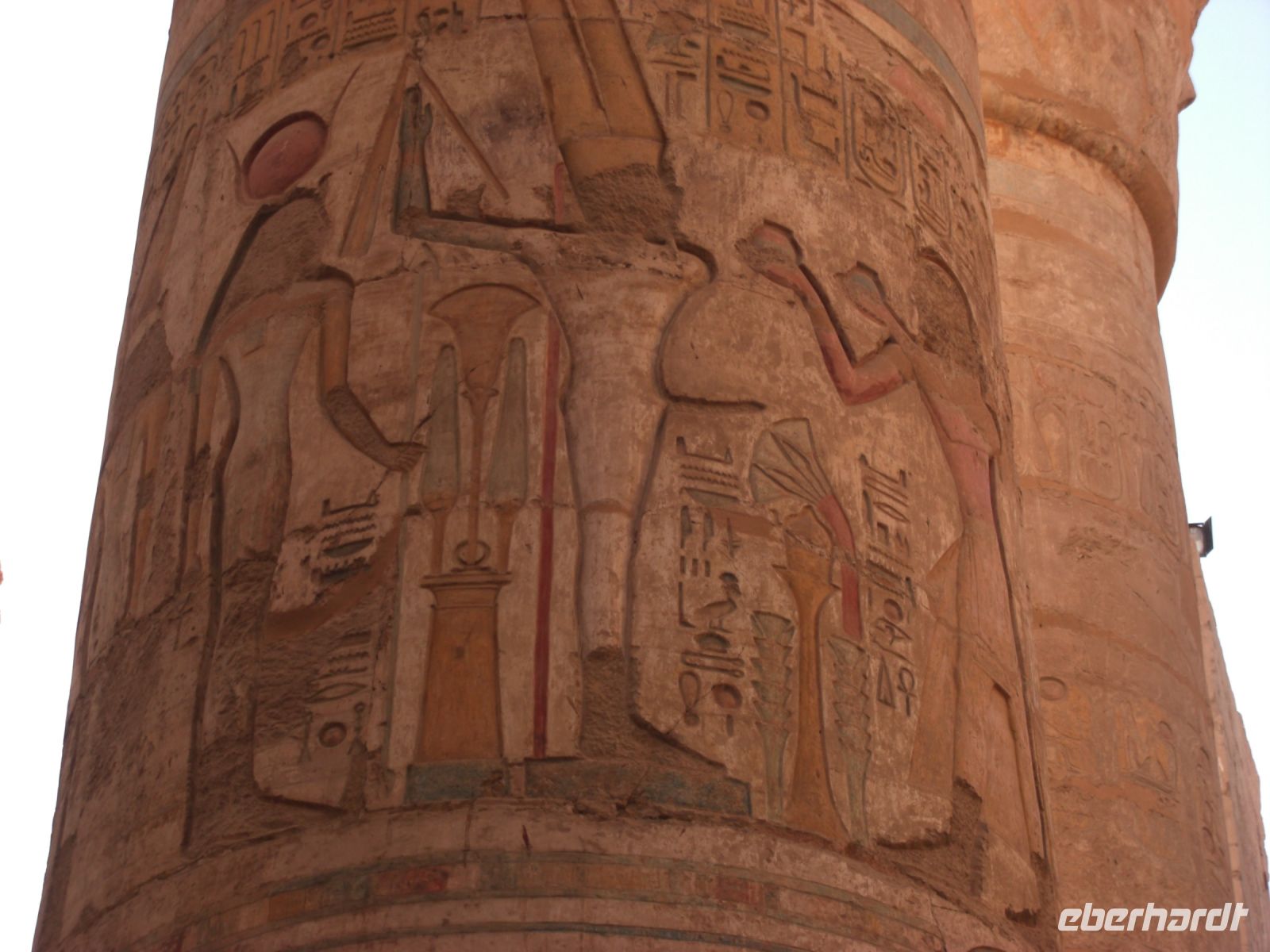 Reiseleiter Essam erklärt uns sehr eindrucksvoll die Wandreliefs. So haben die Griechen sich den Glauben der Götter zunutze gemacht, indem sie diese Reliefs erhielten und die Götter nicht ausradierten. Ein kluger Gedanke, der den Griechen 300 Jahre Herrschaft sicherte. Interessant, Essams Bezug zum Irak-Krieg.