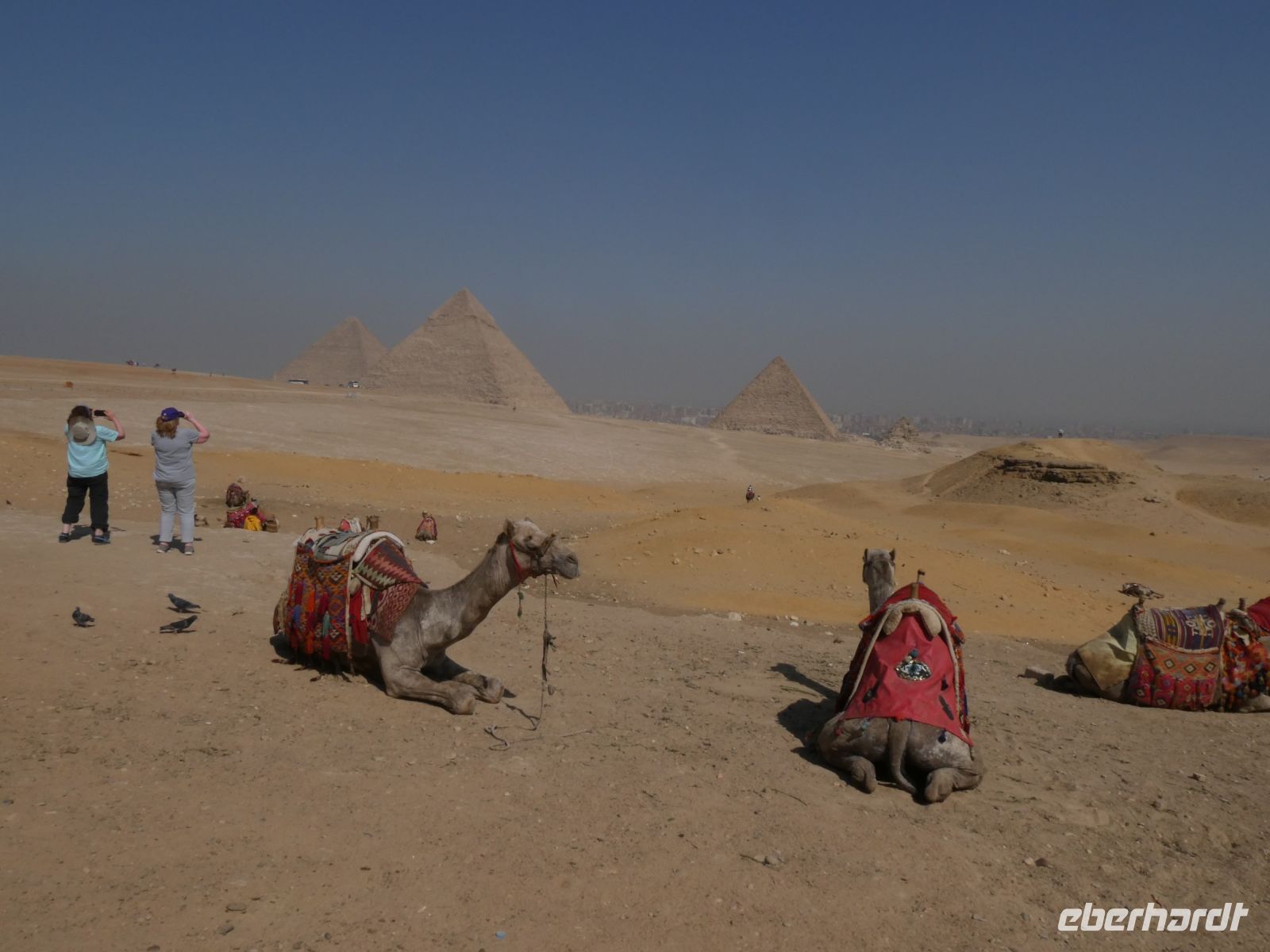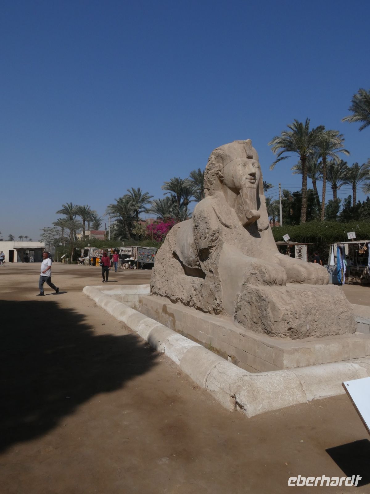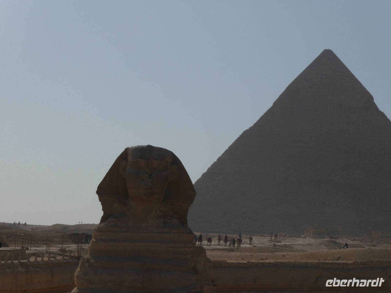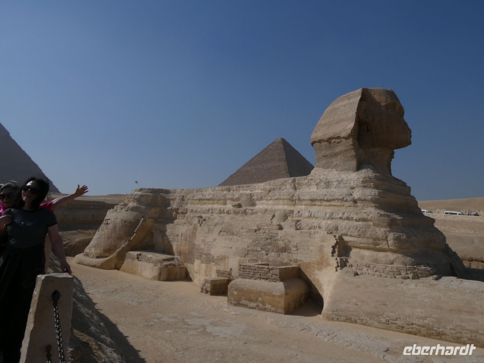 Zur Mittagspause besuchen wir eine ägyptische Restaurant-Anlage, die von Bauern geführt wird. Wir sehen wie zwei Frauen im Steinofen das für Ägypten typische Fladenbrot backen und genießen ein typisches Mittagessen mit Falafel, Tischgrill, Gemüse und Reis. Gut gestärkt fahren wir nun zu den Pyramiden in Gizeh. Die Sonne brennt vom Himmel, und zum Glück weht fast überall ein leichter Wind im Wüstengebiet. Die Szenerie der drei Pyramiden, um die viele Kamele zu sehen sind, ist einzigartig. Wir gehen einmal um die Cheops-Pyramide herum und bestaunen die riesigen Felsblöcke aus denen die Pyramide gebaut wurde. Sie wurden auf 0,2 geschlagen, gerade nur eine Rasierklinge passt dazwischen. Einzeln sollen sie 3 bis 6 Tonnen schwer sein. Überall ergeben sich neue Ausblicke. Anschließend fahren wir mit dem Bus zur Panoramastelle, von wo aus wir Fotos von allen drei Pyramiden machen können, die die Grabstätten von Cheops, Chephren und Mykerinos sind. Im Hintergrund liegt die Stadt Kairo. Unsere letzte Etappe gilt dem Sphinx. Wir erreichen ihn in wenigen Minuten mit unserem Reisebus. Unser Reiseleiter erklärt uns, dass die Griechen den Namen Sphinx vergeben haben, womit sie selbst eine Göttin bezeichnen. In Ägypten ist der Kopf des Mischwesens mit dem Körper eines Löwen allerdings männlich, ein Pharao, weshalb der korrekte Artikel DER Sphinx in Ägypten lautet. Sein Ausmaß ist faszinierend. Der Sphinx bewacht den Eingang zu den Grabstätten, zu denen eine Straße führte.