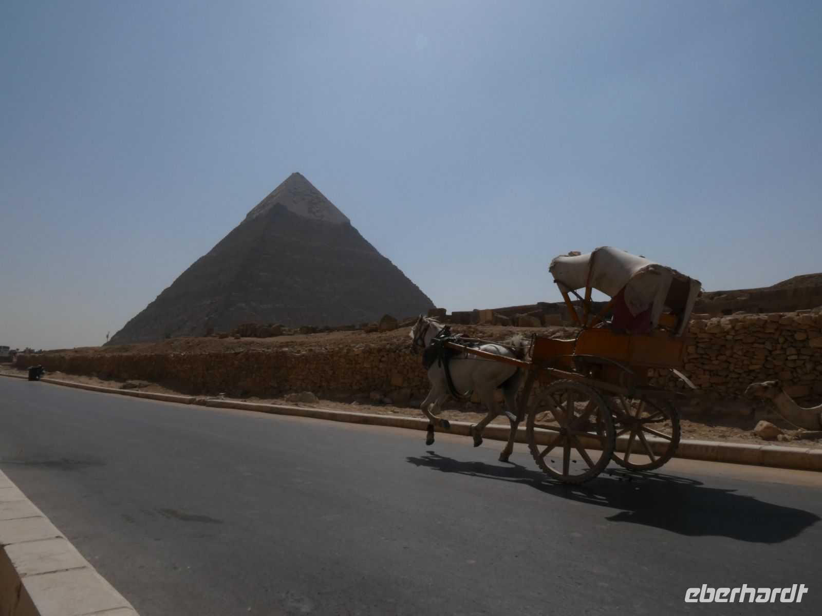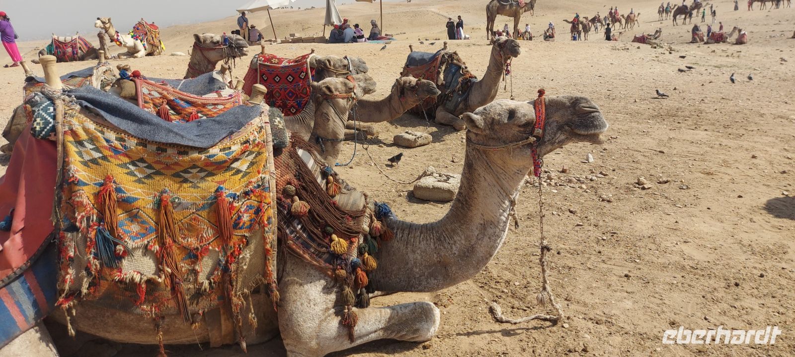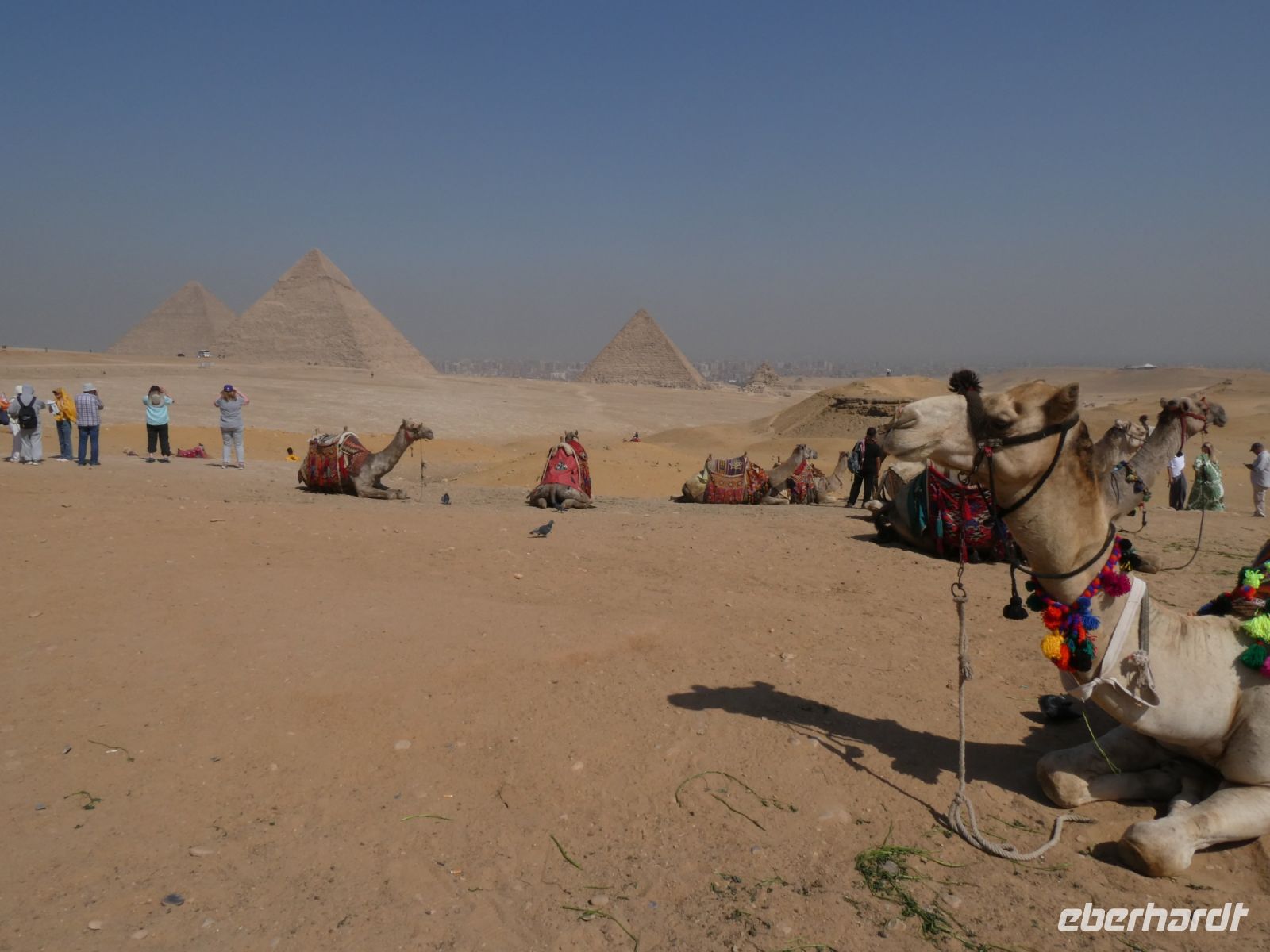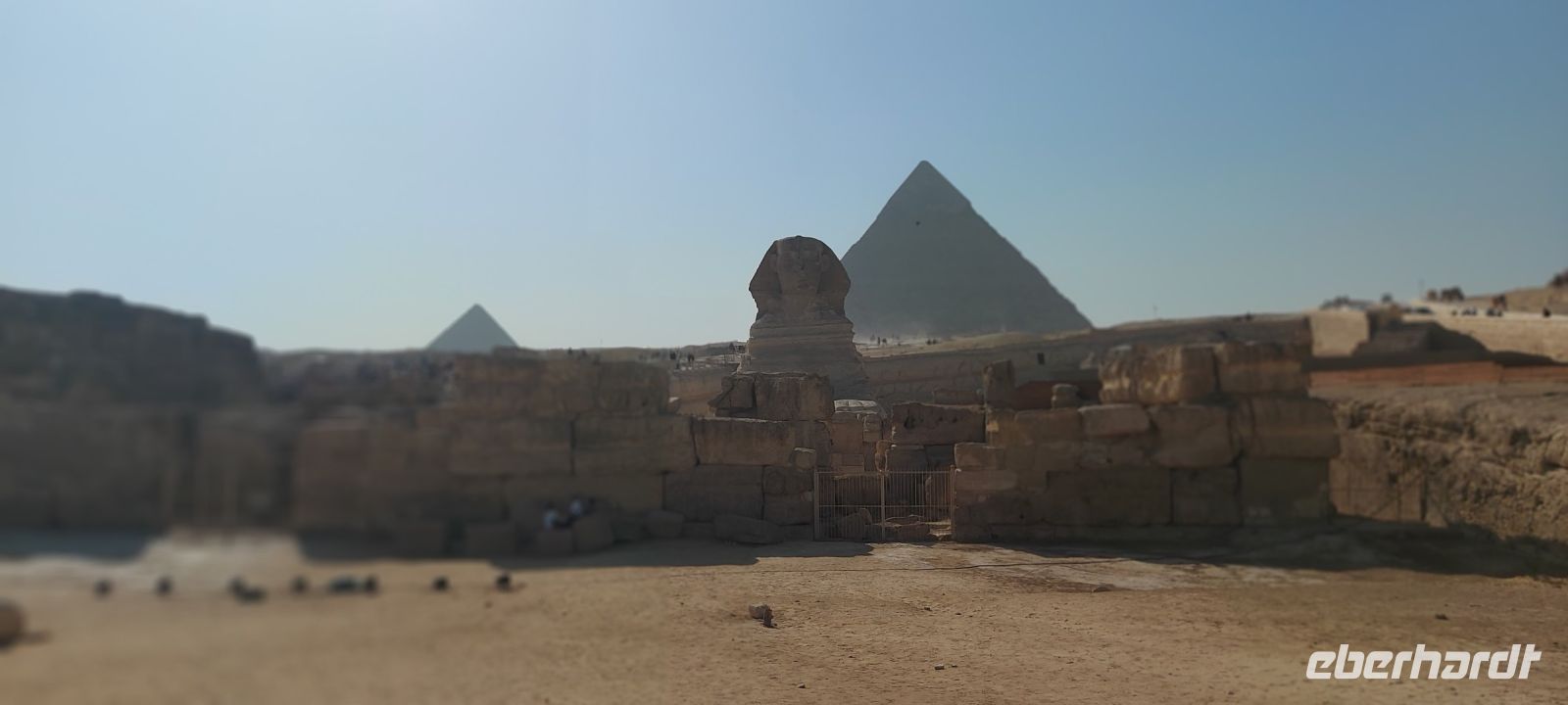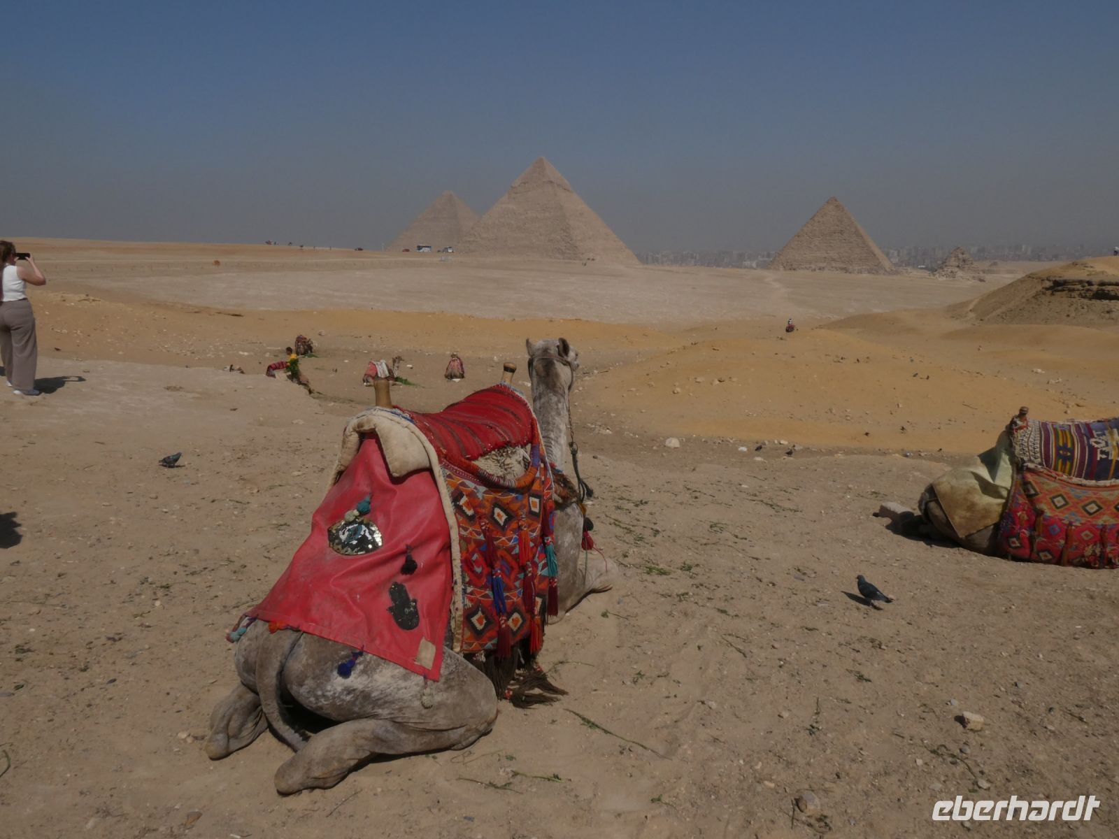 Zur Mittagspause besuchen wir eine ägyptische Restaurant-Anlage, die von Bauern geführt wird. Wir sehen wie zwei Frauen im Steinofen das für Ägypten typische Fladenbrot backen und genießen ein typisches Mittagessen mit Falafel, Tischgrill, Gemüse und Reis. Gut gestärkt fahren wir nun zu den Pyramiden in Gizeh. Die Sonne brennt vom Himmel, und zum Glück weht fast überall ein leichter Wind im Wüstengebiet. Die Szenerie der drei Pyramiden, um die viele Kamele zu sehen sind, ist einzigartig. Wir gehen einmal um die Cheops-Pyramide herum und bestaunen die riesigen Felsblöcke aus denen die Pyramide gebaut wurde. Sie wurden auf 0,2 geschlagen, gerade nur eine Rasierklinge passt dazwischen. Einzeln sollen sie 3 bis 6 Tonnen schwer sein. Überall ergeben sich neue Ausblicke. Anschließend fahren wir mit dem Bus zur Panoramastelle, von wo aus wir Fotos von allen drei Pyramiden machen können, die die Grabstätten von Cheops, Chephren und Mykerinos sind. Im Hintergrund liegt die Stadt Kairo. Unsere letzte Etappe gilt dem Sphinx. Wir erreichen ihn in wenigen Minuten mit unserem Reisebus. Unser Reiseleiter erklärt uns, dass die Griechen den Namen Sphinx vergeben haben, womit sie selbst eine Göttin bezeichnen. In Ägypten ist der Kopf des Mischwesens mit dem Körper eines Löwen allerdings männlich, ein Pharao, weshalb der korrekte Artikel DER Sphinx in Ägypten lautet. Sein Ausmaß ist faszinierend. Der Sphinx bewacht den Eingang zu den Grabstätten, zu denen eine Straße führte.