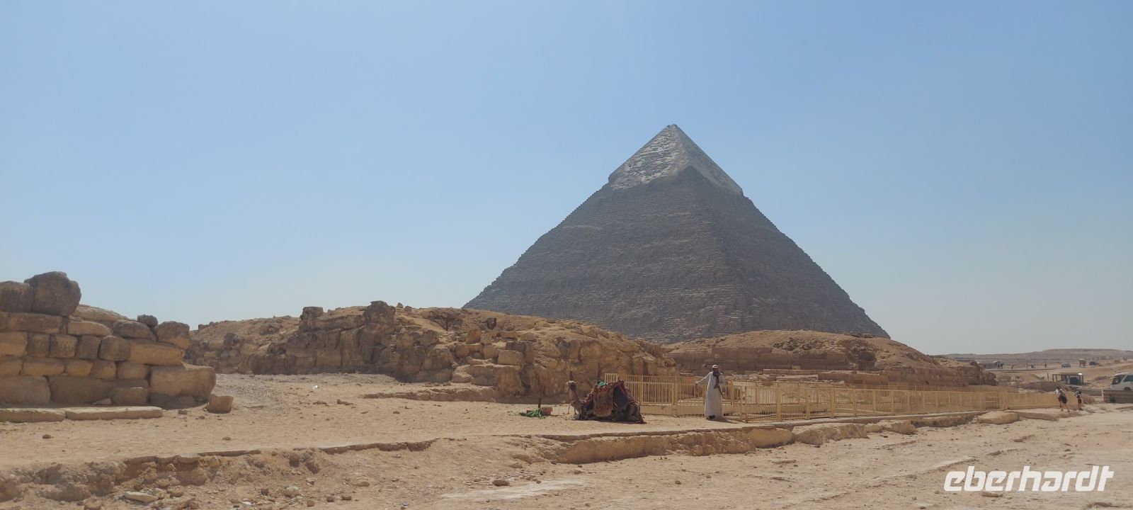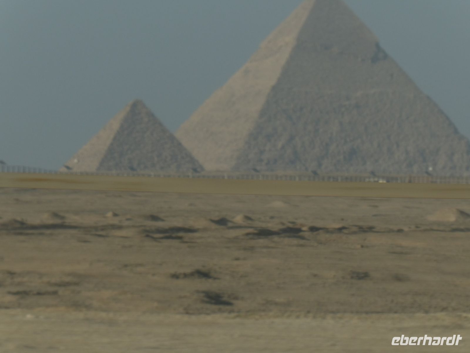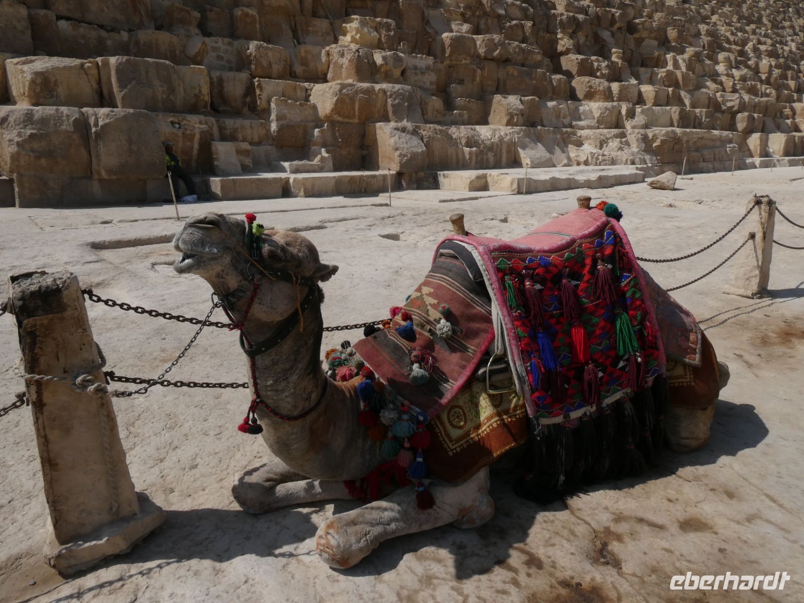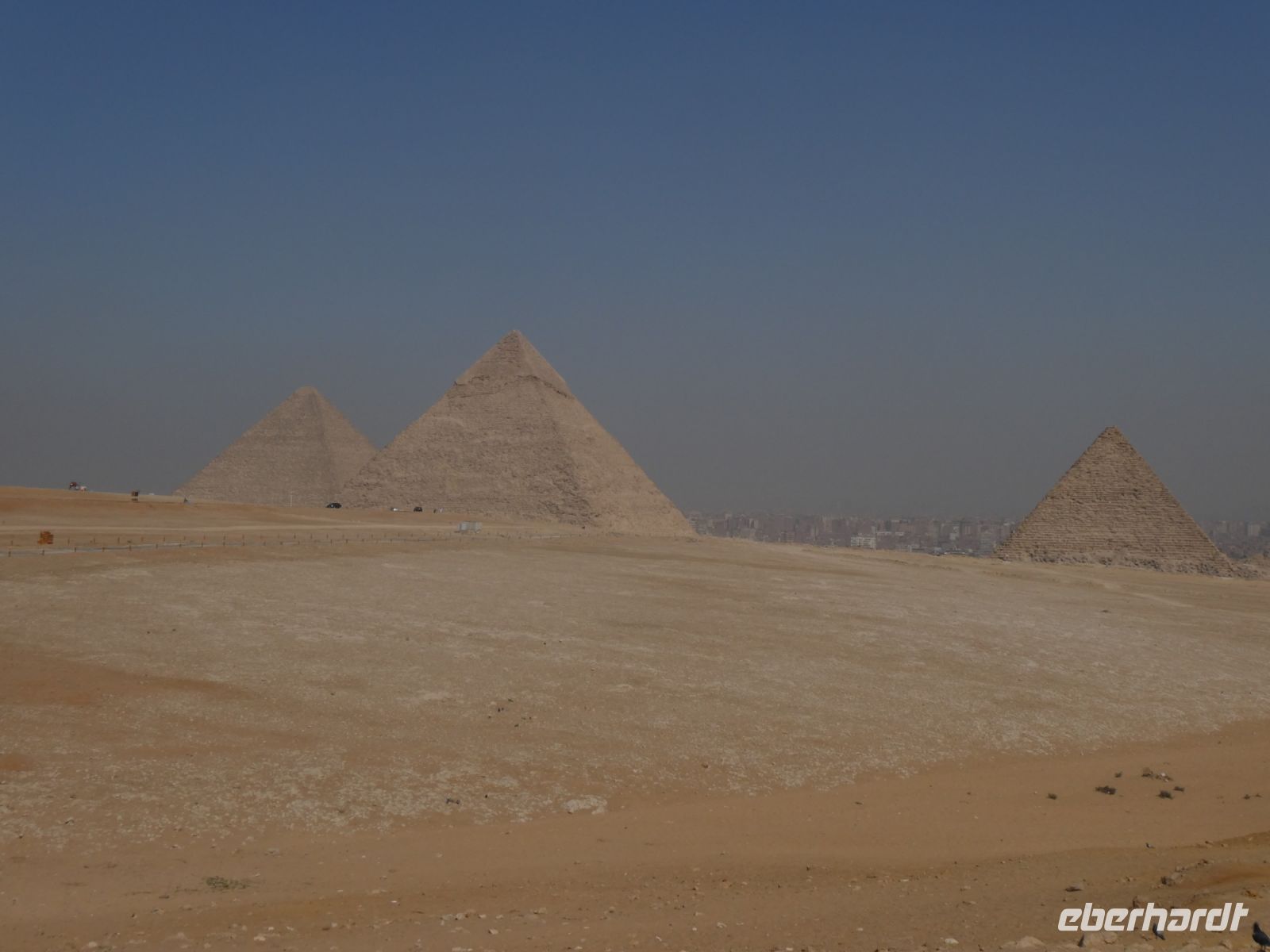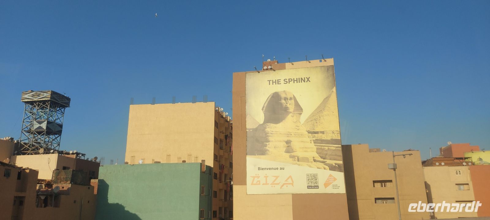 Zur Mittagspause besuchen wir eine ägyptische Restaurant-Anlage, die von Bauern geführt wird. Wir sehen wie zwei Frauen im Steinofen das für Ägypten typische Fladenbrot backen und genießen ein typisches Mittagessen mit Falafel, Tischgrill, Gemüse und Reis. Gut gestärkt fahren wir nun zu den Pyramiden in Gizeh. Die Sonne brennt vom Himmel, und zum Glück weht fast überall ein leichter Wind im Wüstengebiet. Die Szenerie der drei Pyramiden, um die viele Kamele zu sehen sind, ist einzigartig. Wir gehen einmal um die Cheops-Pyramide herum und bestaunen die riesigen Felsblöcke aus denen die Pyramide gebaut wurde. Sie wurden auf 0,2 geschlagen, gerade nur eine Rasierklinge passt dazwischen. Einzeln sollen sie 3 bis 6 Tonnen schwer sein. Überall ergeben sich neue Ausblicke. Anschließend fahren wir mit dem Bus zur Panoramastelle, von wo aus wir Fotos von allen drei Pyramiden machen können, die die Grabstätten von Cheops, Chephren und Mykerinos sind. Im Hintergrund liegt die Stadt Kairo. Unsere letzte Etappe gilt dem Sphinx. Wir erreichen ihn in wenigen Minuten mit unserem Reisebus. Unser Reiseleiter erklärt uns, dass die Griechen den Namen Sphinx vergeben haben, womit sie selbst eine Göttin bezeichnen. In Ägypten ist der Kopf des Mischwesens mit dem Körper eines Löwen allerdings männlich, ein Pharao, weshalb der korrekte Artikel DER Sphinx in Ägypten lautet. Sein Ausmaß ist faszinierend. Der Sphinx bewacht den Eingang zu den Grabstätten, zu denen eine Straße führte.