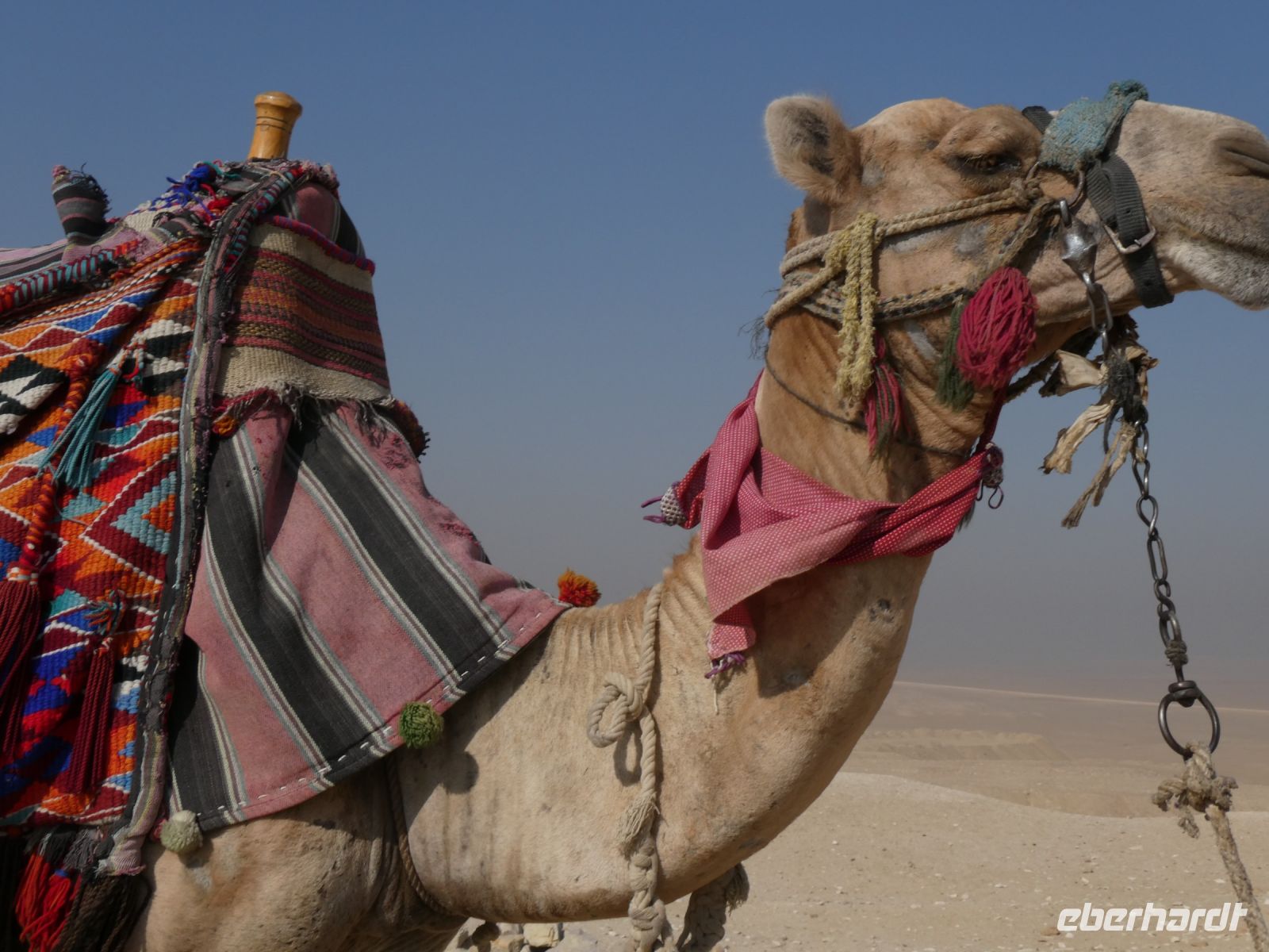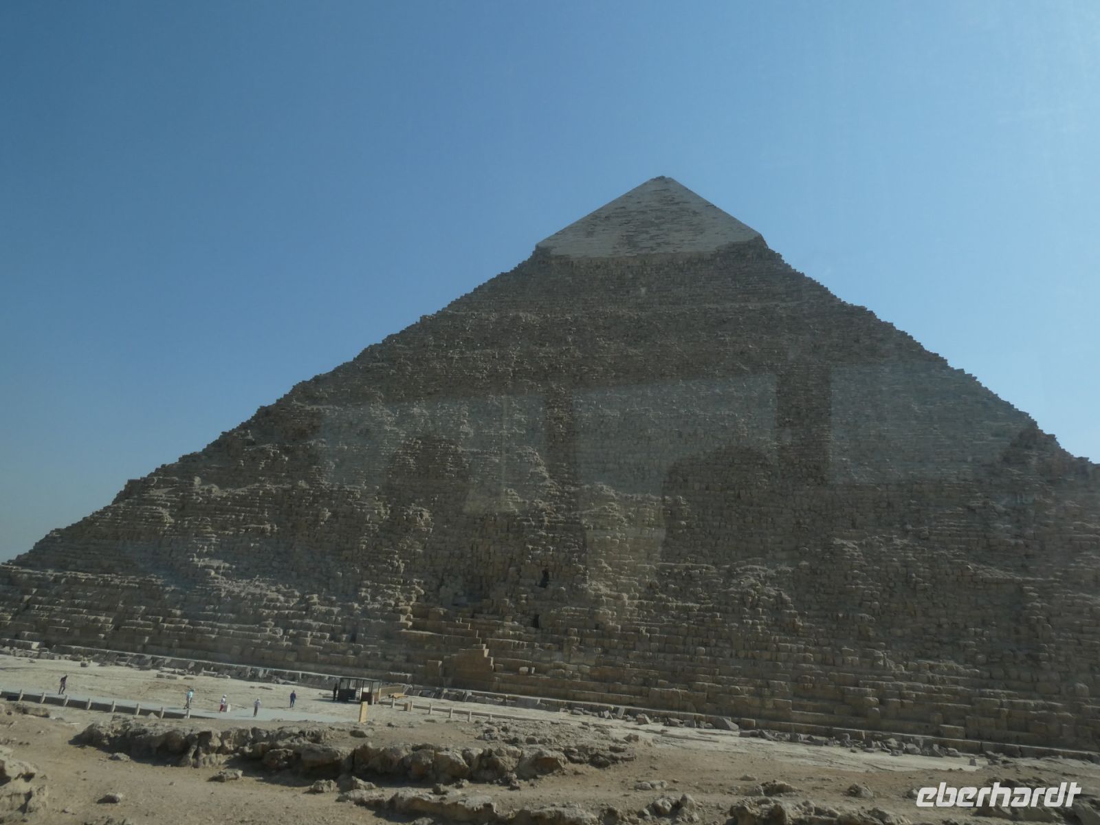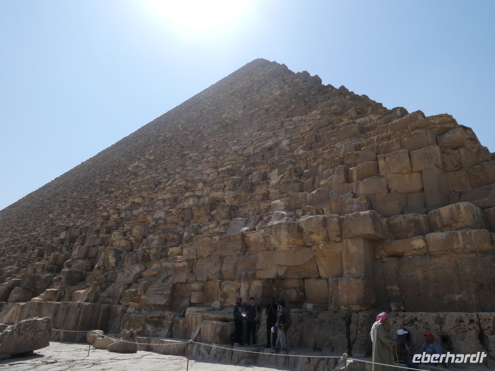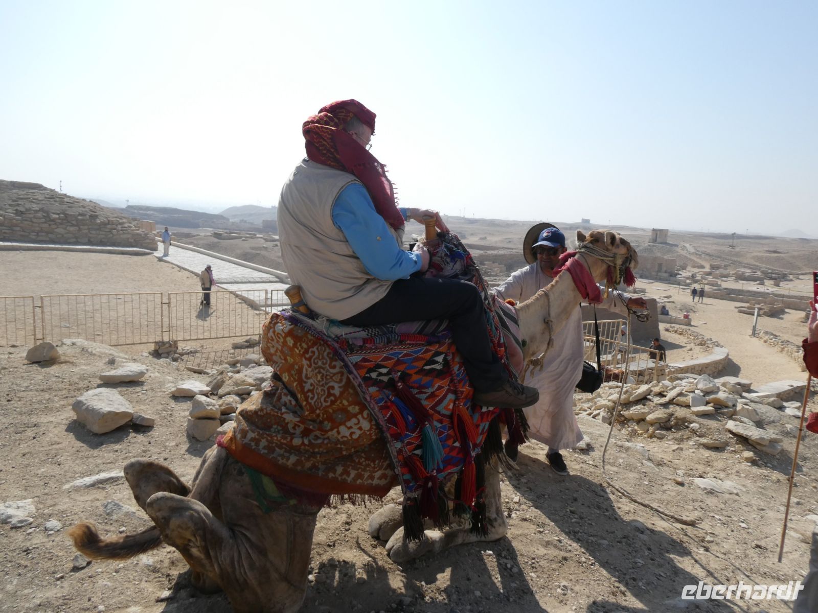 Zur Mittagspause besuchen wir eine ägyptische Restaurant-Anlage, die von Bauern geführt wird. Wir sehen wie zwei Frauen im Steinofen das für Ägypten typische Fladenbrot backen und genießen ein typisches Mittagessen mit Falafel, Tischgrill, Gemüse und Reis. Gut gestärkt fahren wir nun zu den Pyramiden in Gizeh. Die Sonne brennt vom Himmel, und zum Glück weht fast überall ein leichter Wind im Wüstengebiet. Die Szenerie der drei Pyramiden, um die viele Kamele zu sehen sind, ist einzigartig. Wir gehen einmal um die Cheops-Pyramide herum und bestaunen die riesigen Felsblöcke aus denen die Pyramide gebaut wurde. Sie wurden auf 0,2 geschlagen, gerade nur eine Rasierklinge passt dazwischen. Einzeln sollen sie 3 bis 6 Tonnen schwer sein. Überall ergeben sich neue Ausblicke. Anschließend fahren wir mit dem Bus zur Panoramastelle, von wo aus wir Fotos von allen drei Pyramiden machen können, die die Grabstätten von Cheops, Chephren und Mykerinos sind. Im Hintergrund liegt die Stadt Kairo. Unsere letzte Etappe gilt dem Sphinx. Wir erreichen ihn in wenigen Minuten mit unserem Reisebus. Unser Reiseleiter erklärt uns, dass die Griechen den Namen Sphinx vergeben haben, womit sie selbst eine Göttin bezeichnen. In Ägypten ist der Kopf des Mischwesens mit dem Körper eines Löwen allerdings männlich, ein Pharao, weshalb der korrekte Artikel DER Sphinx in Ägypten lautet. Sein Ausmaß ist faszinierend. Der Sphinx bewacht den Eingang zu den Grabstätten, zu denen eine Straße führte.