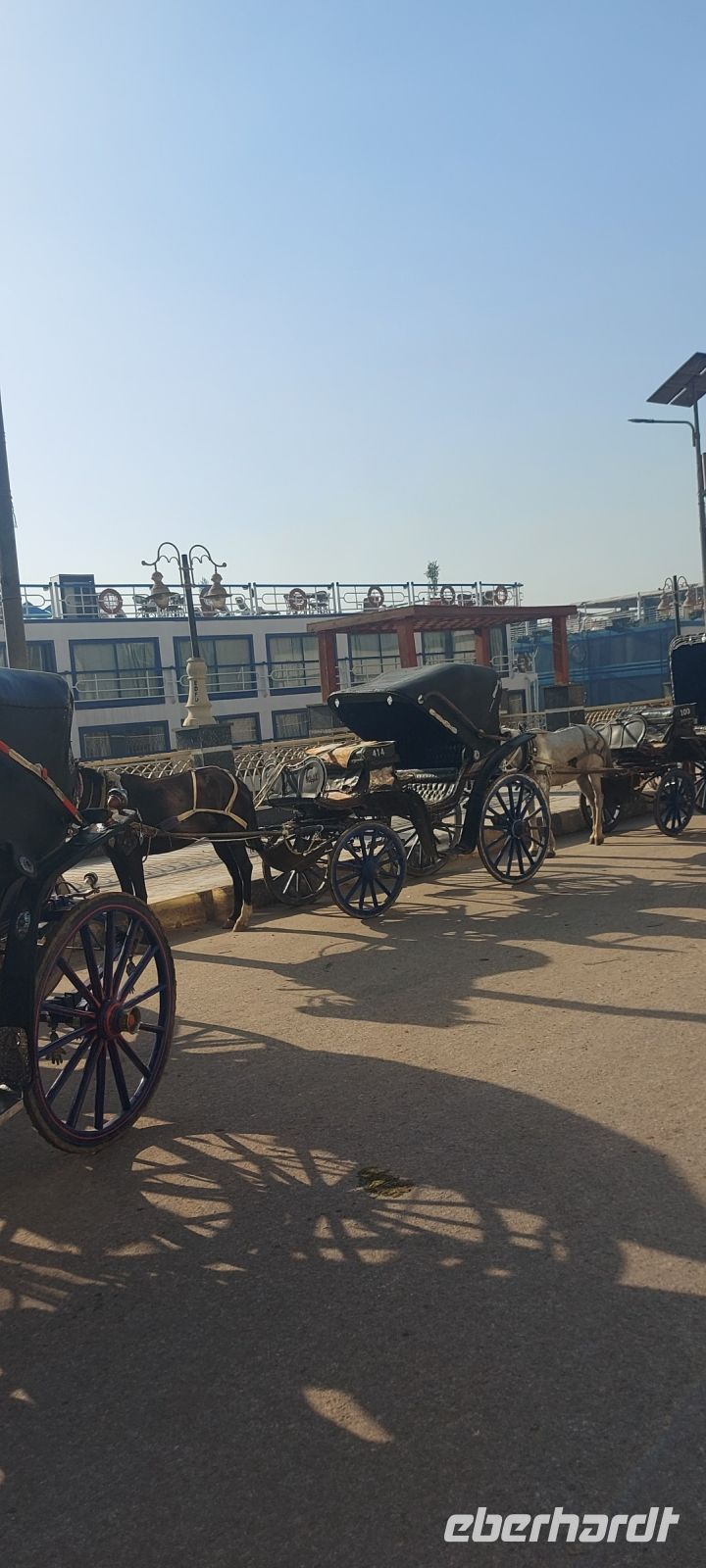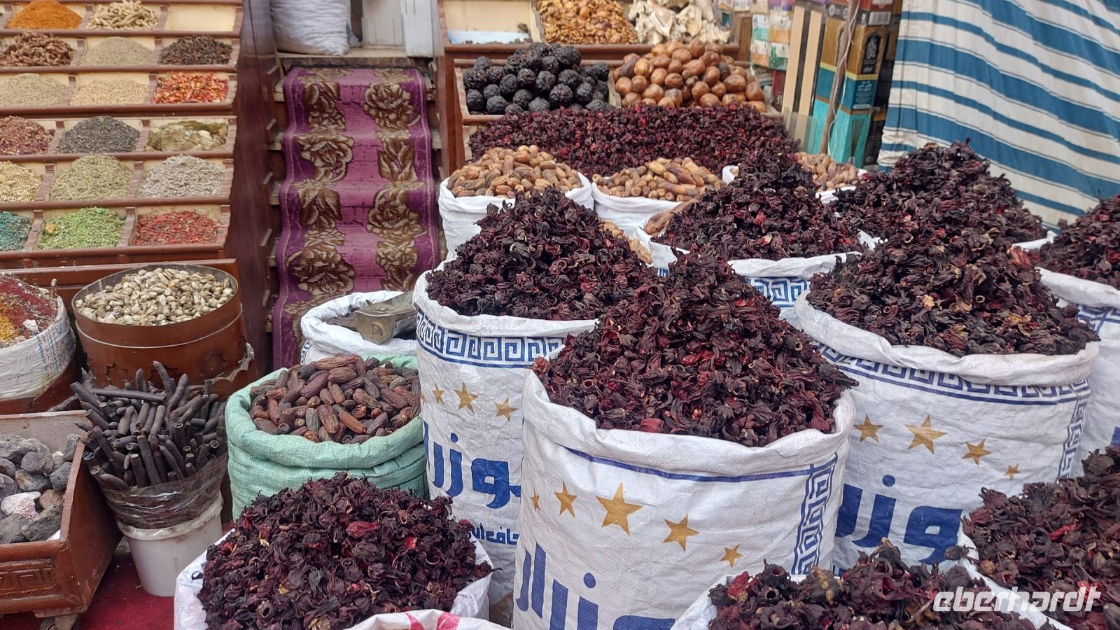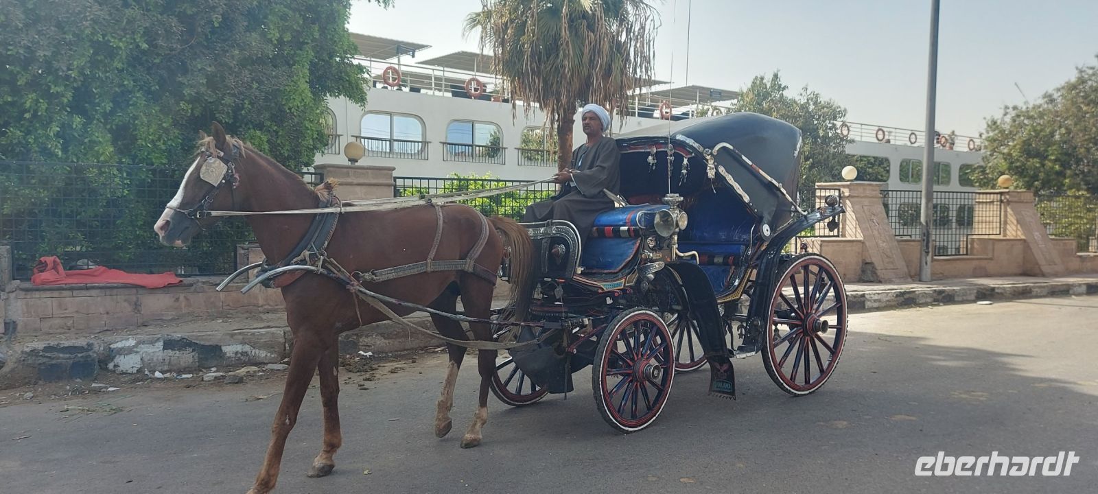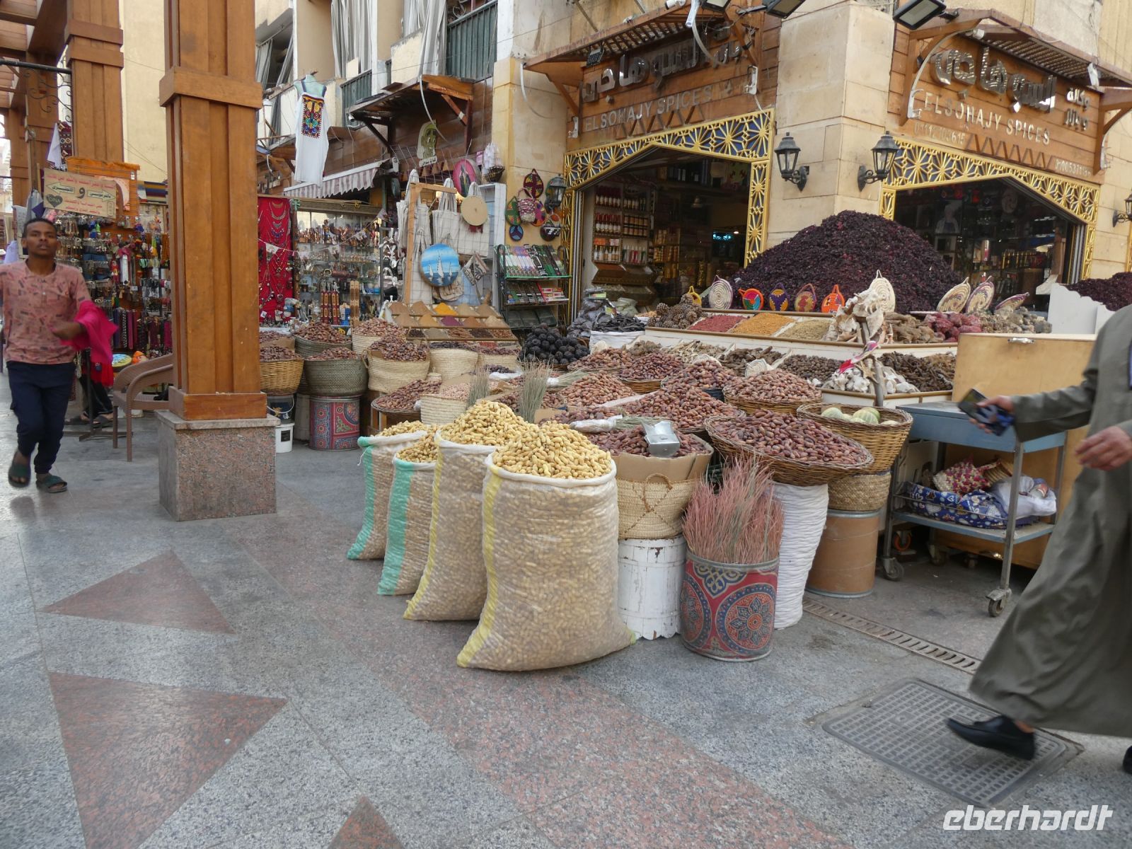 Heute hat sich das Wetter leicht geändert. Nach den sehr warmen Tagen steht Sandsturm ins Haus, weshalb wir unsere eigentlich geplante Felukkenfahrt auf dem Wasser für heute streichen und auf Samstag verschieben. Kein Problem, unser örtlicher Reiseleiter Essam hat sofort ein Ersatzprogramm parat. Wieder auf dem Schiff angekommen genießen wir zunächst das Mittagessen und begeben uns dann auf den Markt in Assuan. Wieder nehmen wir die Pferdekutschen und tauchen ein in das authentische Leben der Stadt. Sehr bekannt sind die Gewürze von Assuan. Wir besuchen ein Geschäft und lassen uns die vielen Farben und Gerüche präsentieren. Auch sehr gut riechende Teemischungen gibt es in dem historischen Geschäft. Wir decken uns mit Gewürzmischungen, Tee, Safran aus dem Iran, Vanillestangen und Datteln ein und fahren mit den Kutschen zurück zum Schiff. Vor dem Abendessen können wir uns noch ein bißchen entspannen und genießen dann den Abend an Bord.