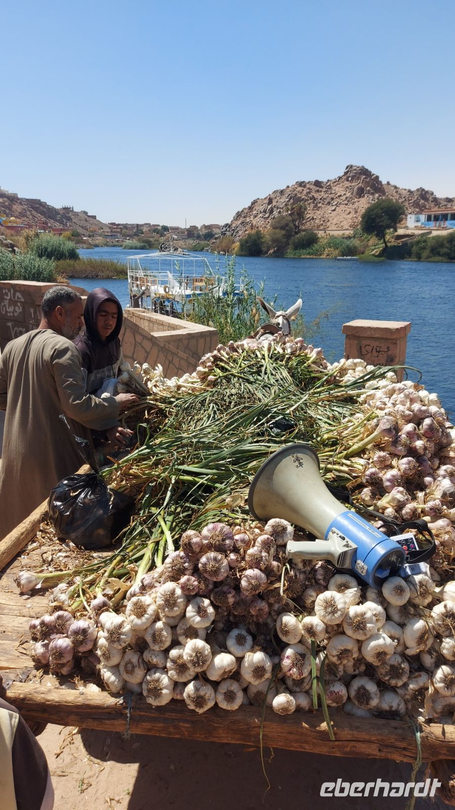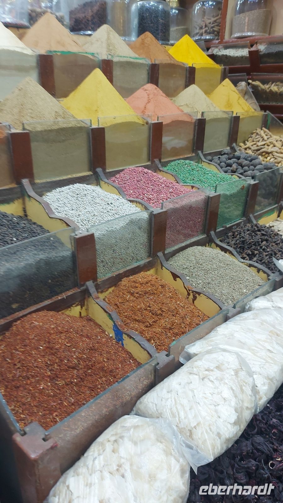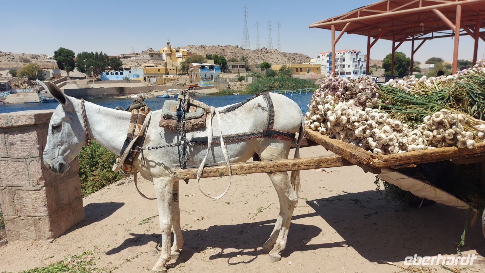 Heute hat sich das Wetter leicht geändert. Nach den sehr warmen Tagen steht Sandsturm ins Haus, weshalb wir unsere eigentlich geplante Felukkenfahrt auf dem Wasser für heute streichen und auf Samstag verschieben. Kein Problem, unser örtlicher Reiseleiter Essam hat sofort ein Ersatzprogramm parat. Wieder auf dem Schiff angekommen genießen wir zunächst das Mittagessen und begeben uns dann auf den Markt in Assuan. Wieder nehmen wir die Pferdekutschen und tauchen ein in das authentische Leben der Stadt. Sehr bekannt sind die Gewürze von Assuan. Wir besuchen ein Geschäft und lassen uns die vielen Farben und Gerüche präsentieren. Auch sehr gut riechende Teemischungen gibt es in dem historischen Geschäft. Wir decken uns mit Gewürzmischungen, Tee, Safran aus dem Iran, Vanillestangen und Datteln ein und fahren mit den Kutschen zurück zum Schiff. Vor dem Abendessen können wir uns noch ein bißchen entspannen und genießen dann den Abend an Bord.