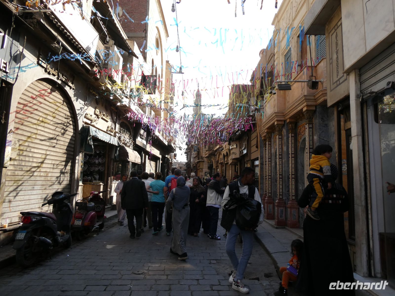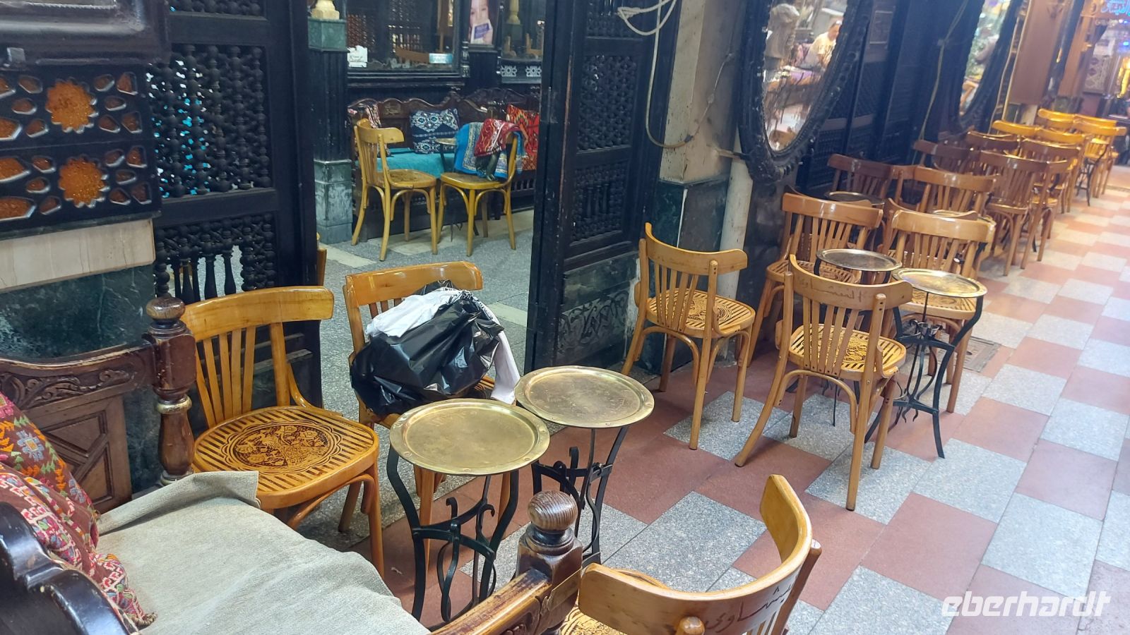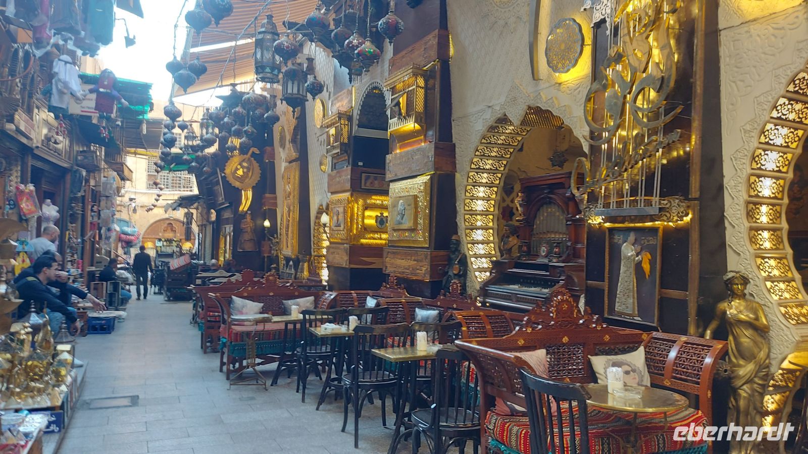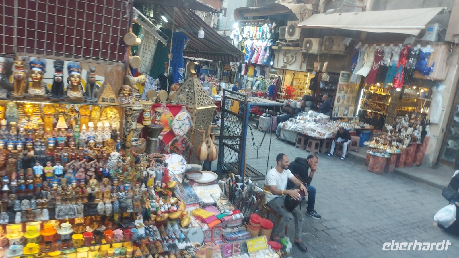 Wir erholen uns bei einer Mittagspause in einem Lokal, das typisch ägyptische Speisen für Touristen bereithält, da in der Ramadanzeit fast alle Lokale tagsüber geschlossen sind und die Zeit für Renovierungen nutzen. Unsere Reisegruppe stärkt sich am köstlichen Büfett. Zum Abschluss der Stadtbesichtigung steht der Besuch auf dem Basar Khan-Al-Kalili auf dem Programm, er liegt direkt im alten Zentrum von Kairo, umgeben von großen Moscheen. Es herrscht eine schöne Atmosphäre in den engen Gassen des Marktes, wo vor allem Schmuck, Dekor aus vielen ägyptischen Figuren, Kleidung, arabische Lampen sowie Speisen und Getränke angeboten werden. Von links und rechts werden wir freundlich begrüßt und zum Kauf angeregt. Mit vielen Eindrücken kehren wir zurück ins Hotel. Auf dem Weg sehen wir schon die Pyramiden aus dem Sand herausragen, die wir morgen besichtigen werden.