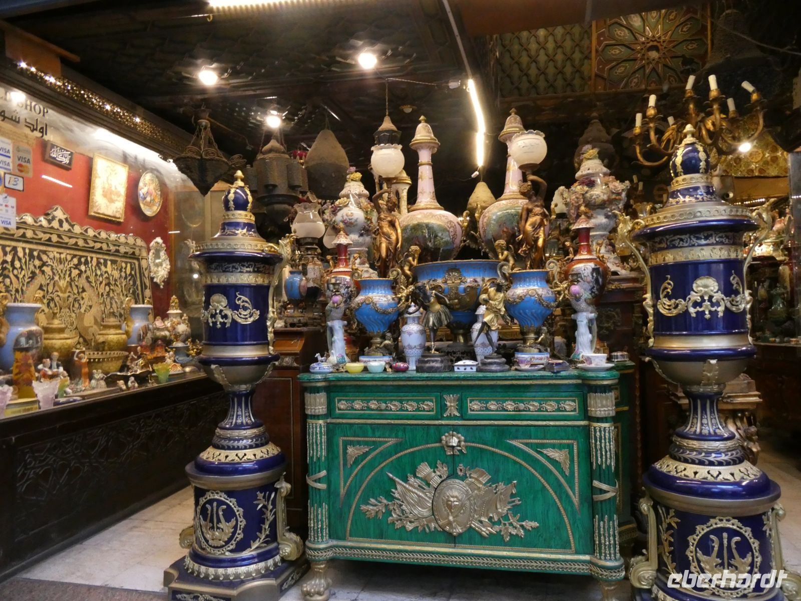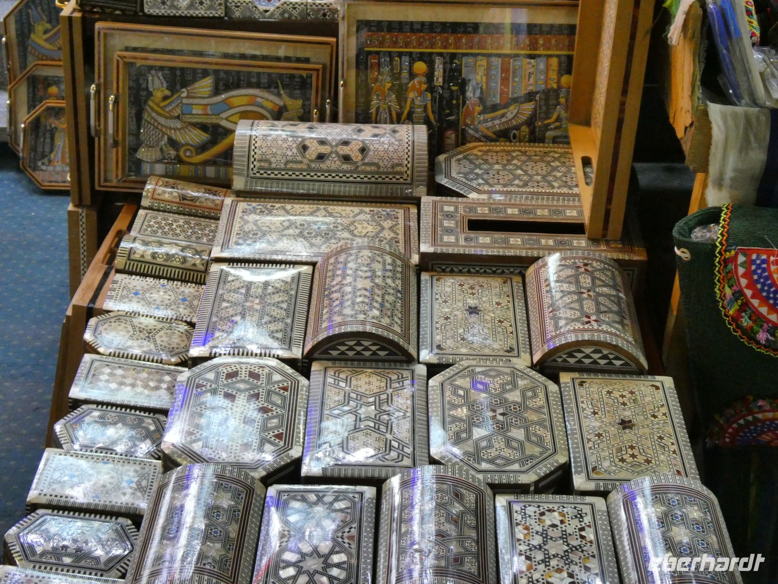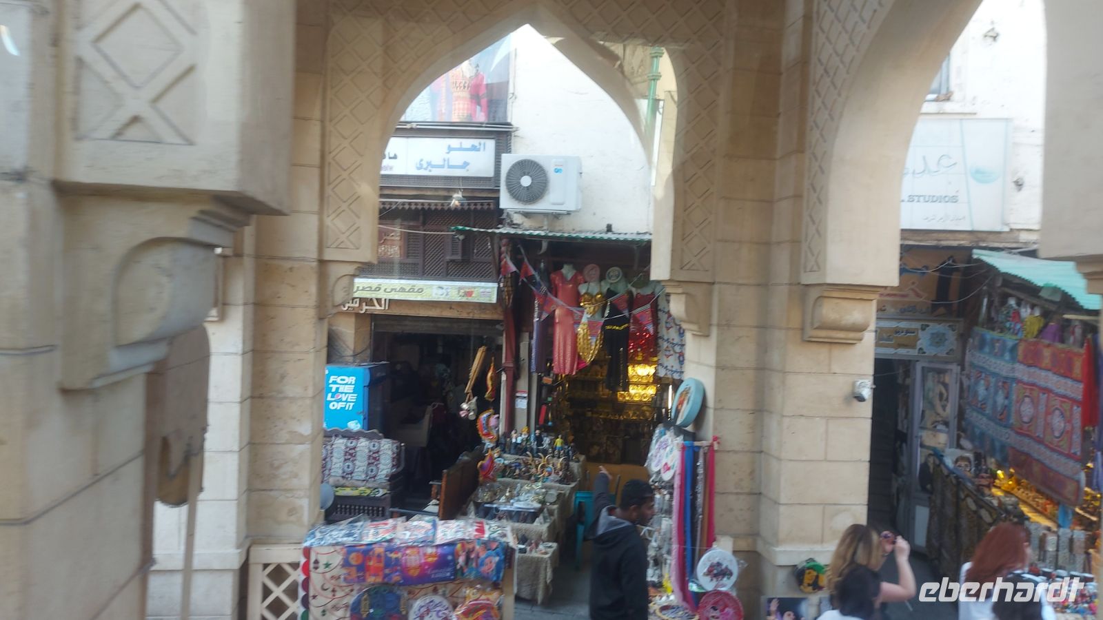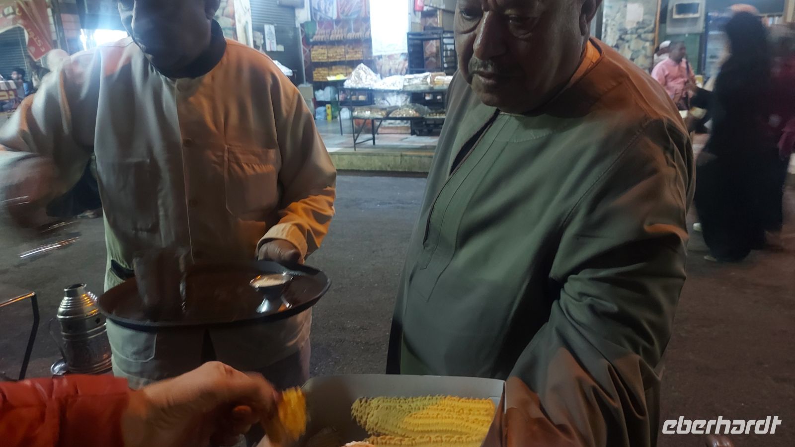 Wir erholen uns bei einer Mittagspause in einem Lokal, das typisch ägyptische Speisen für Touristen bereithält, da in der Ramadanzeit fast alle Lokale tagsüber geschlossen sind und die Zeit für Renovierungen nutzen. Unsere Reisegruppe stärkt sich am köstlichen Büfett. Zum Abschluss der Stadtbesichtigung steht der Besuch auf dem Basar Khan-Al-Kalili auf dem Programm, er liegt direkt im alten Zentrum von Kairo, umgeben von großen Moscheen. Es herrscht eine schöne Atmosphäre in den engen Gassen des Marktes, wo vor allem Schmuck, Dekor aus vielen ägyptischen Figuren, Kleidung, arabische Lampen sowie Speisen und Getränke angeboten werden. Von links und rechts werden wir freundlich begrüßt und zum Kauf angeregt. Mit vielen Eindrücken kehren wir zurück ins Hotel. Auf dem Weg sehen wir schon die Pyramiden aus dem Sand herausragen, die wir morgen besichtigen werden.