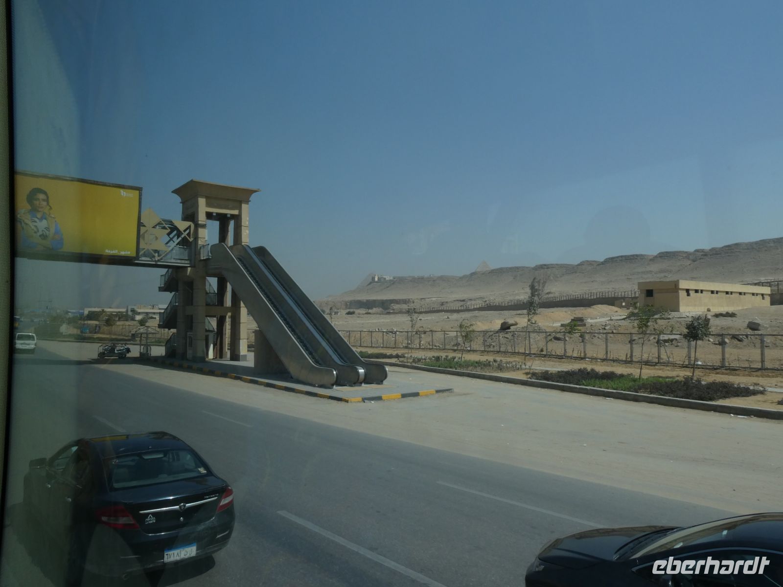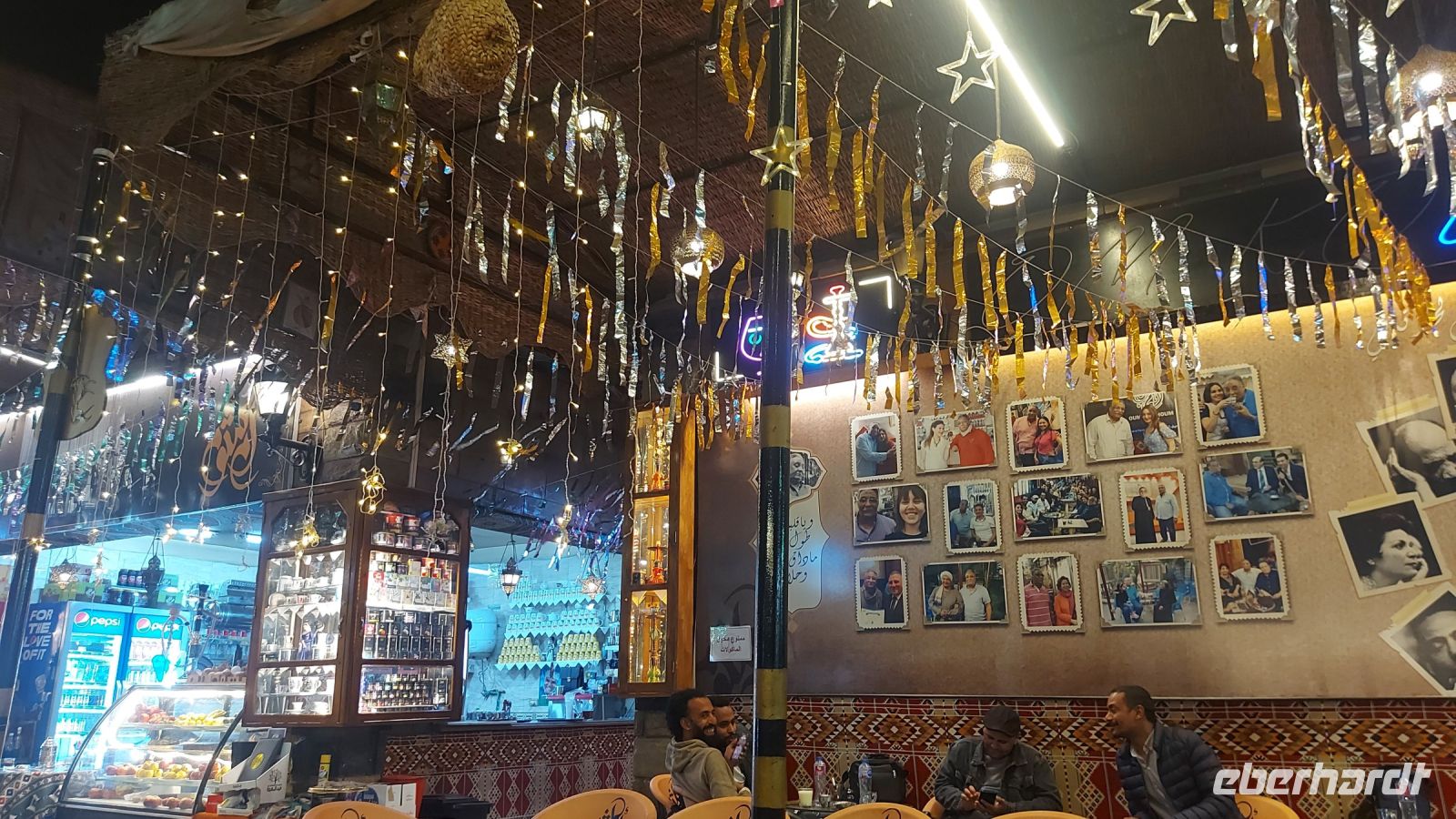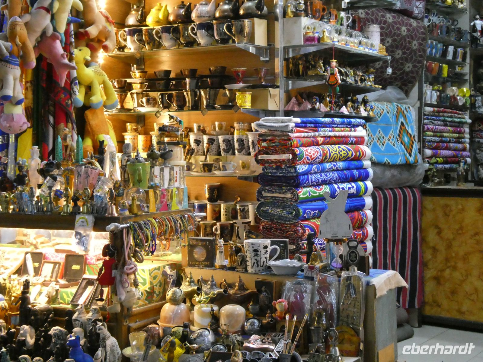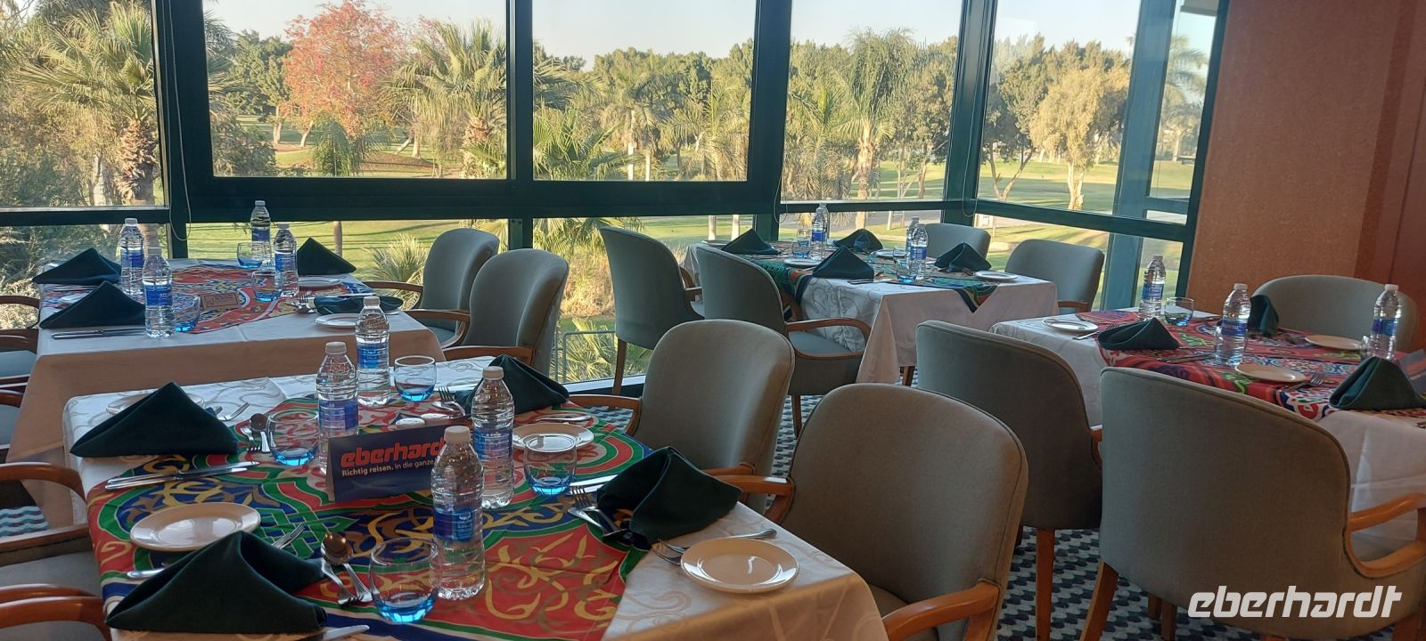 Wir erholen uns bei einer Mittagspause in einem Lokal, das typisch ägyptische Speisen für Touristen bereithält, da in der Ramadanzeit fast alle Lokale tagsüber geschlossen sind und die Zeit für Renovierungen nutzen. Unsere Reisegruppe stärkt sich am köstlichen Büfett. Zum Abschluss der Stadtbesichtigung steht der Besuch auf dem Basar Khan-Al-Kalili auf dem Programm, er liegt direkt im alten Zentrum von Kairo, umgeben von großen Moscheen. Es herrscht eine schöne Atmosphäre in den engen Gassen des Marktes, wo vor allem Schmuck, Dekor aus vielen ägyptischen Figuren, Kleidung, arabische Lampen sowie Speisen und Getränke angeboten werden. Von links und rechts werden wir freundlich begrüßt und zum Kauf angeregt. Mit vielen Eindrücken kehren wir zurück ins Hotel. Auf dem Weg sehen wir schon die Pyramiden aus dem Sand herausragen, die wir morgen besichtigen werden.