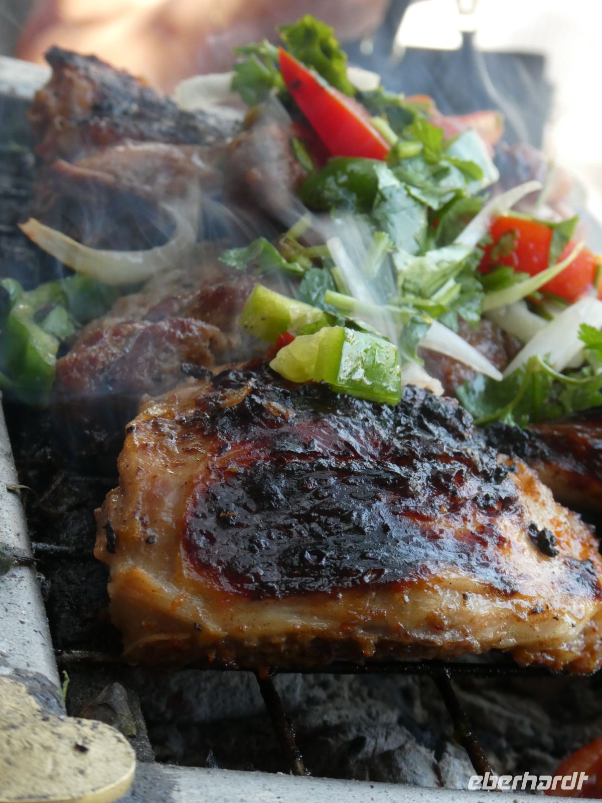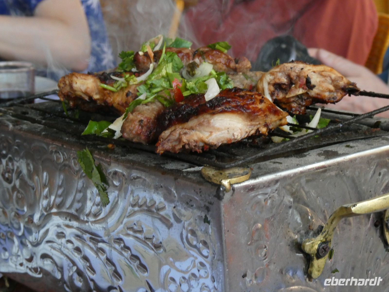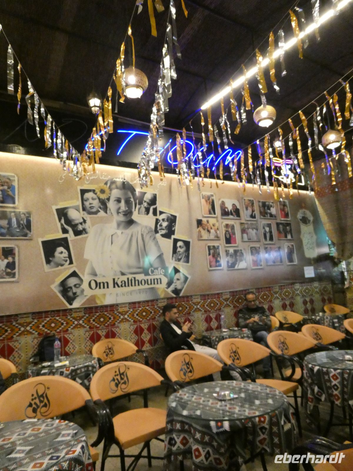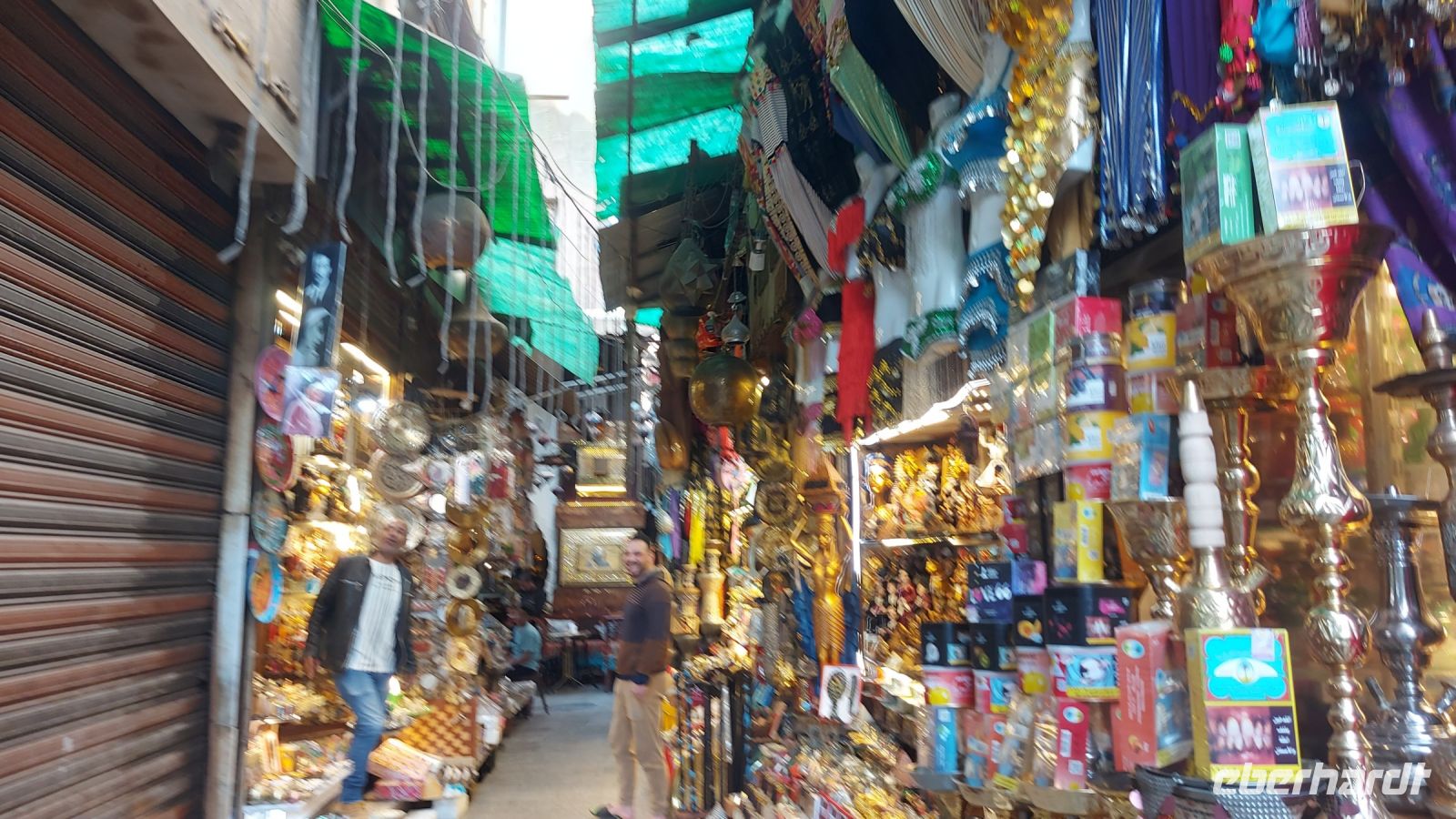 Wir erholen uns bei einer Mittagspause in einem Lokal, das typisch ägyptische Speisen für Touristen bereithält, da in der Ramadanzeit fast alle Lokale tagsüber geschlossen sind und die Zeit für Renovierungen nutzen. Unsere Reisegruppe stärkt sich am köstlichen Büfett. Zum Abschluss der Stadtbesichtigung steht der Besuch auf dem Basar Khan-Al-Kalili auf dem Programm, er liegt direkt im alten Zentrum von Kairo, umgeben von großen Moscheen. Es herrscht eine schöne Atmosphäre in den engen Gassen des Marktes, wo vor allem Schmuck, Dekor aus vielen ägyptischen Figuren, Kleidung, arabische Lampen sowie Speisen und Getränke angeboten werden. Von links und rechts werden wir freundlich begrüßt und zum Kauf angeregt. Mit vielen Eindrücken kehren wir zurück ins Hotel. Auf dem Weg sehen wir schon die Pyramiden aus dem Sand herausragen, die wir morgen besichtigen werden.