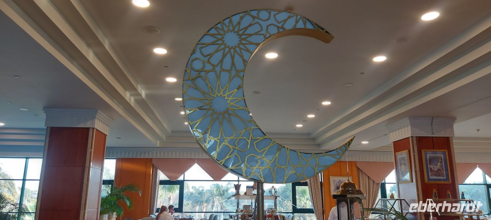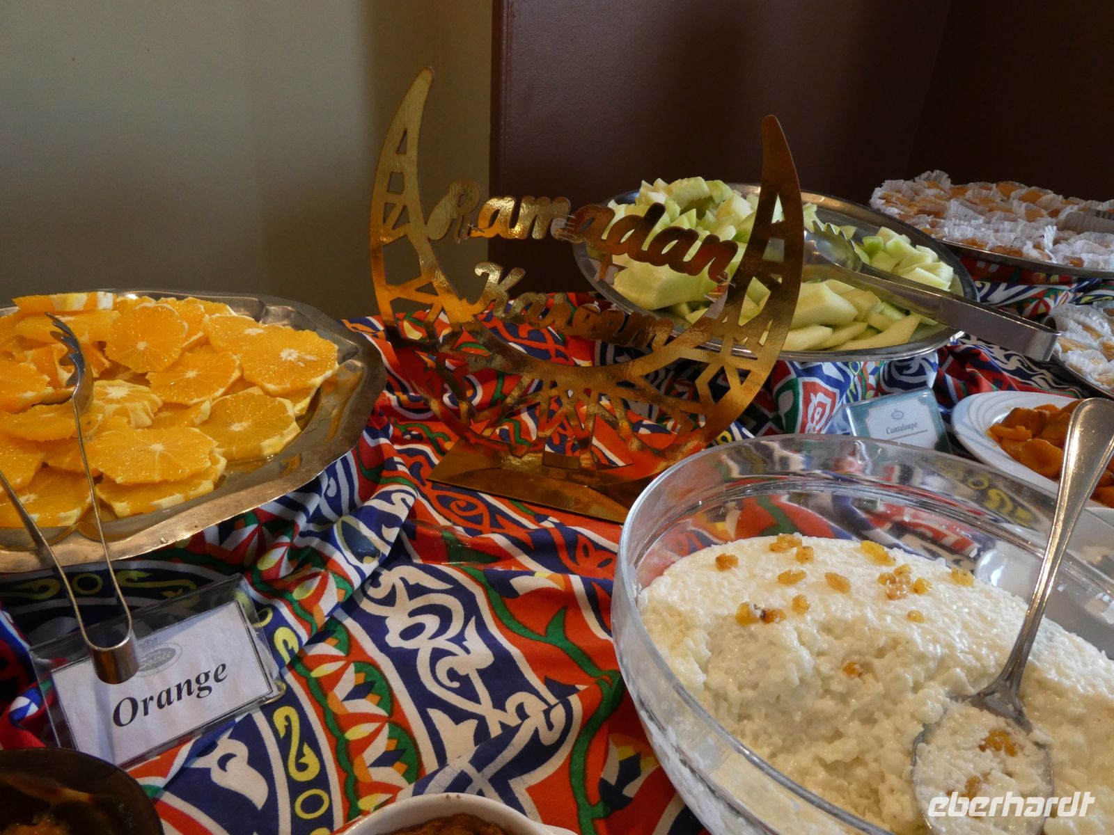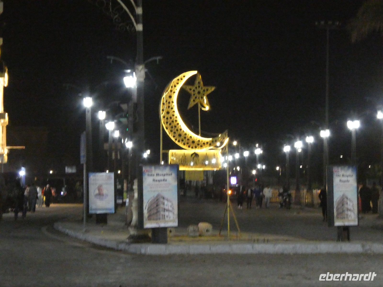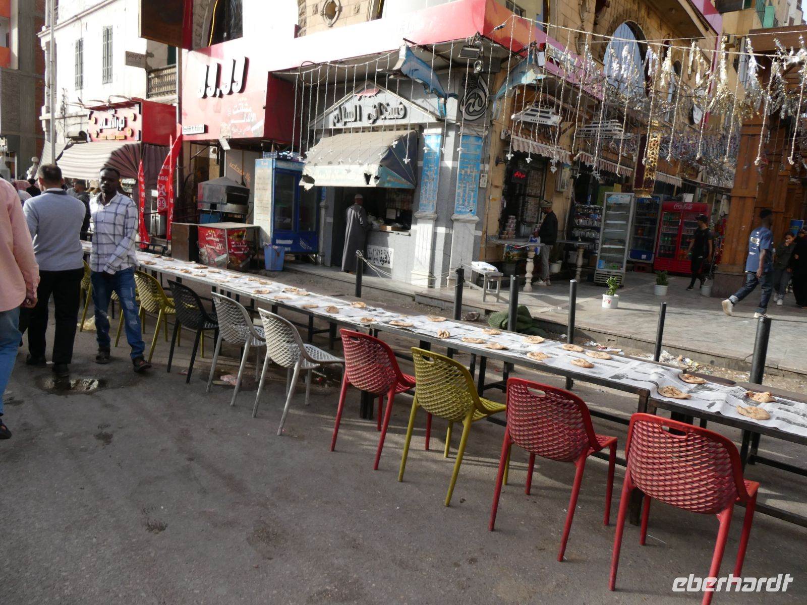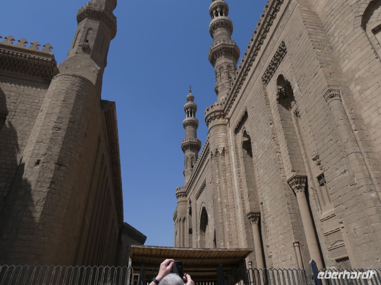 Wir besteigen den Bus und fahren um die Ecke zu einer weiteren Moschee der Zitadelle: Die Sultan-Hassan-Moschee. Am Eingang geben wir die Schuhe ab und besichtigen die Hallen der Moschee. Der Imam setzt für uns zum Gesang an. Mit dem Abendgebet um 19.30 enden die täglichen Gebete. In der Ramadan-Zeit herrscht in Kairo eine besondere Stimmung, erzählt unser Reiseleiter. Die Stadt ist mit vielen Lichtern geschmückt. Zur Ramadan-Dekoration gehören die Ramadan-Lampe, der Halbmond oder auch Kanonen, die früher verwendet wurden, als es noch keine Lautsprecher oder Telefone für die Erinnerungen an die Gebete gab. Nach der ersten Hälfte der Fastenzeit kommen viele Moslems aus anderen Ländern, um die Feste zum Fastenbrechen hier im quirligen Kairo zu verbringen, berichtet unser Reiseleiter Essam. Oft wird bis vier Uhr morgens gefeiert. Nach dem Sonnenaufgang führen gläubige Moslems bis zum Sonnenuntergang nichts in den Mund, auch kein Wasser. Essam erzählt uns, was hinter dem Glauben in Ägypten steckt und warum die Fastenzeit eine Freude für die Ägypter ist und kein Zwang.