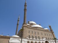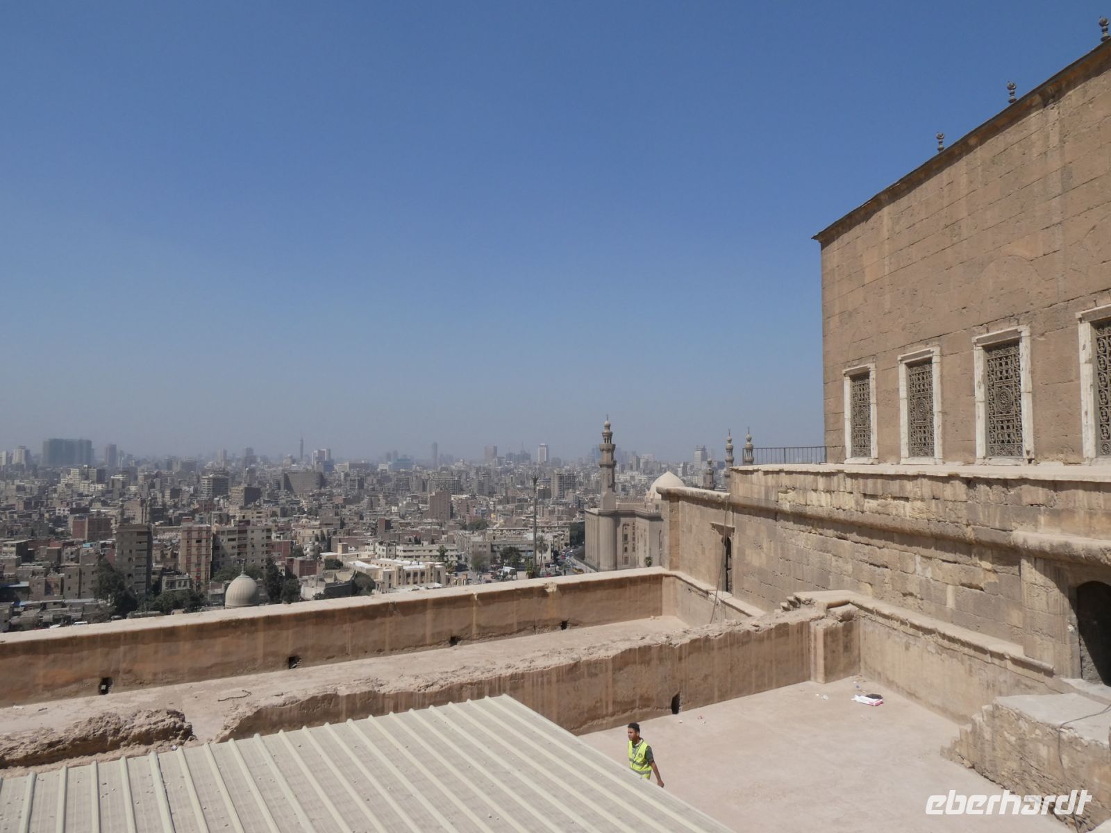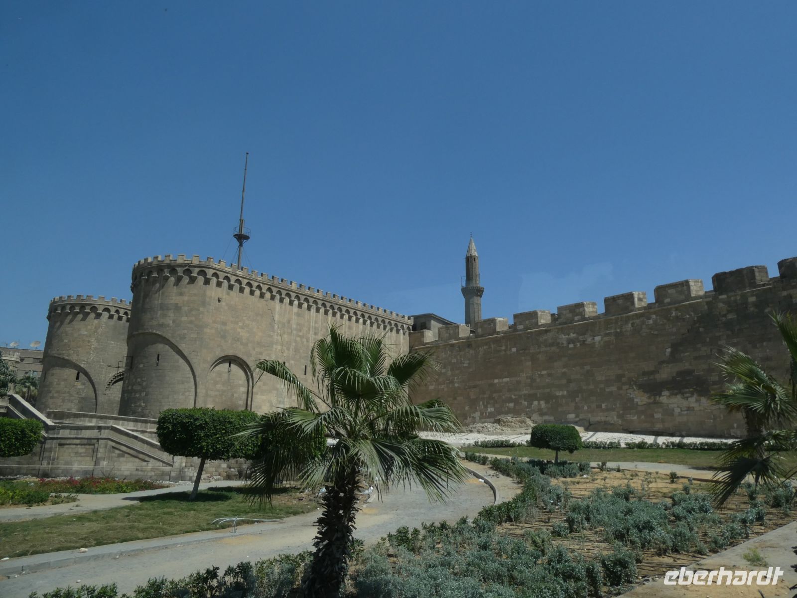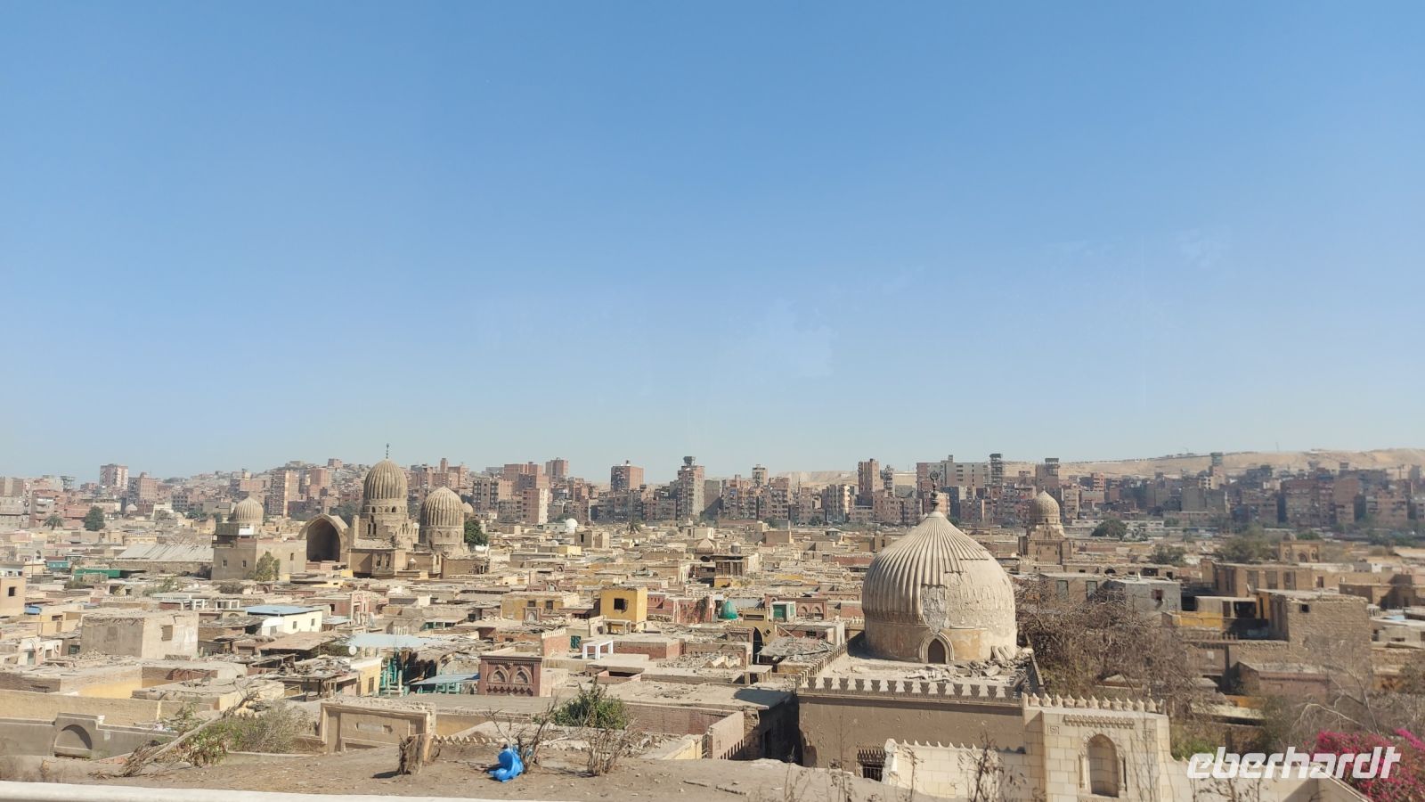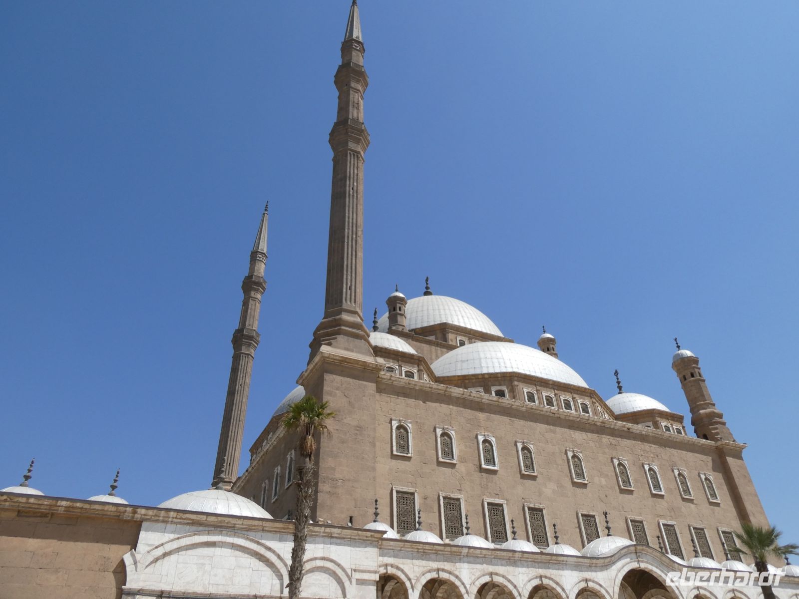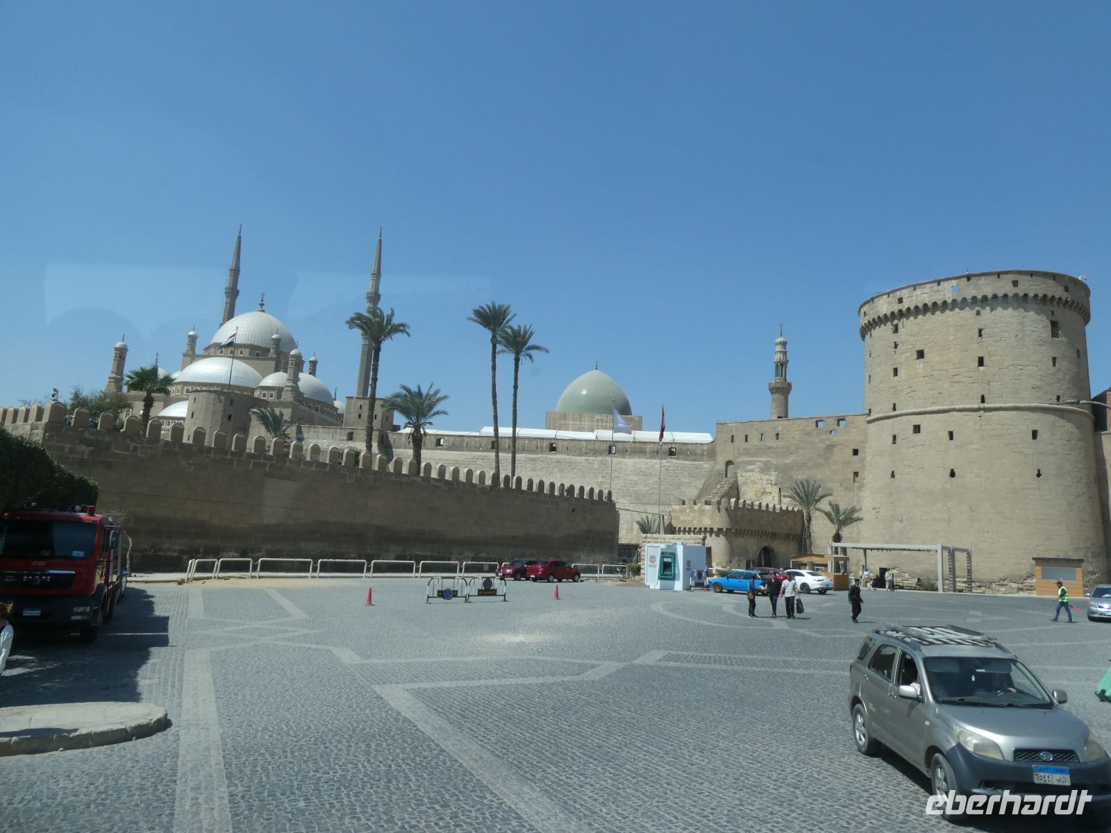 Im Anschluss besichtigen wir die Zitadelle, die riesige Festung, die majestätisch auf dem Saladin-Platz empor ragt. Sie beherbergt Moscheen, darunter die Muhammad Ali-Moschee, die wegen ihrer Auskleidung auch Alabstermoschee genannt wird. Wir ziehen die Schuhe aus, nehmen sie in die Hand und betreten auf Strümpfen das heilige Gebäude mit der atemberaubenden Architektur. Vom Vorplatz der Moschee hat man einen herrlichen Blick auf die Stadt Kairo. Der Imam spricht gerade ein Gebet. Während in der Türkei die Gebete vom Tonband kommen, wird in Ägypten live gesprochen, erklärt Essam.