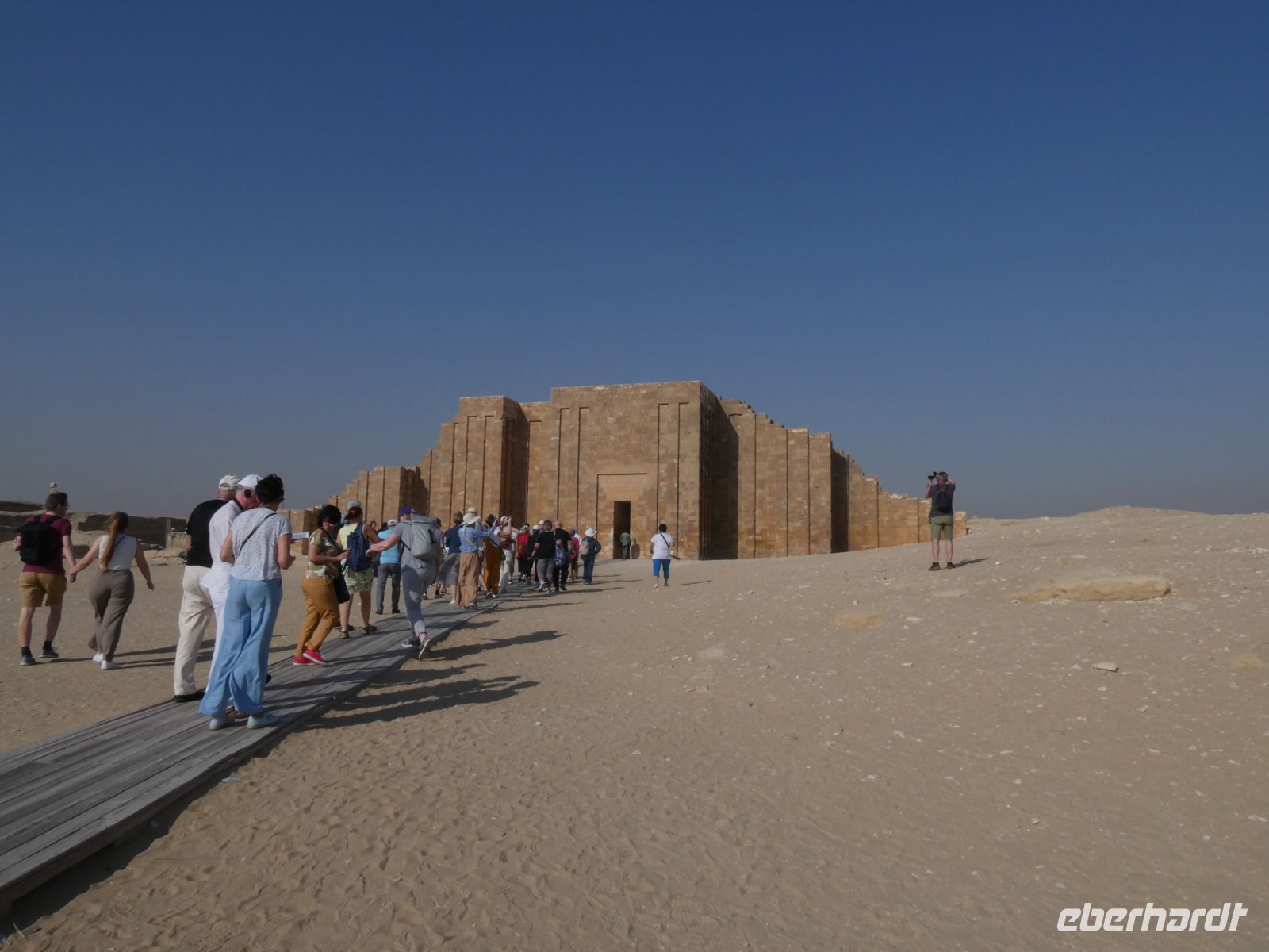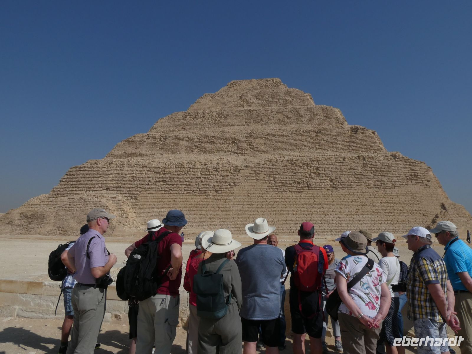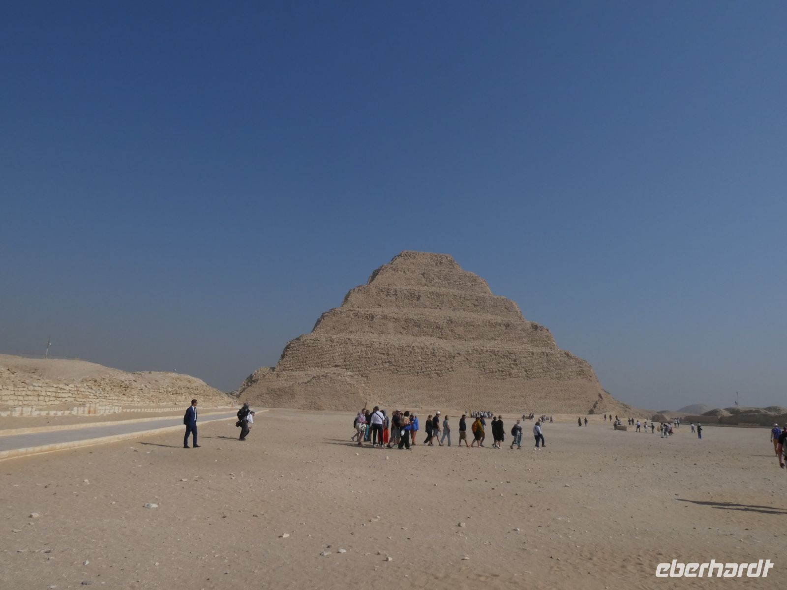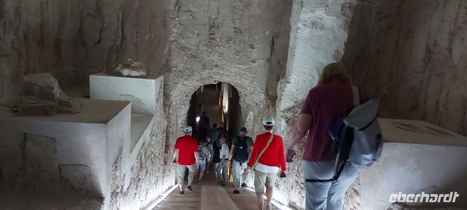 Früh morgens fahren wir mit unserem Reiseleiter nach Sakkara, wo die Grabstätten der Herrscher und hohen Würdenträger der antiken Stadt Memphis liegen. Wir machen einen Umweg, um einen Blick auf das neue Ägyptische Museum GRAND EGYPTIAN MUSEUM (GEM) zu werfen, in dem schon viele Exponate untergebracht sind. Es befindet sich in der Nähe der Pyramiden, die bald auch mit der Metro erschlossen sein werden. Auf der Fahrt hören wir viel über Geschichte, Land und Leute. In Sakkara (Saqqara), einstmals die Nekropolis von Memphis, steht die älteste Stufenpyramide der Welt des Königs Djoser. Zunächst gehen wir in die Grabkammer der Prinzessin Seschseschet Idut und bestaunen die filigranen Zeichnungen im ganzen Raum. Sie war die Tochter von Pharao Unas, dem neunten und letzten Herrscher der 5. Dynastie. Unser örtlicher Reiseleiter erklärt uns die Inschriften einer "Scheintür", die symbolisch dafür sorgen sollten, dass der begrabene Herrscher oder die Herrscherin vor dem "Totengericht" gut über sich selbst berichten kann, wie ein Ablass im Mittelalter, da man glaubte, dass sie das Portal für den Zugang ins Jenseits für die Seele des Verstorbenen seien. Später wurden Papyrusrollen mit den Biographien der Verstorbenen ins Grab gelegt, daher ist die Scheintür ein bedeutendes historisches Element dieser Grabkammer.