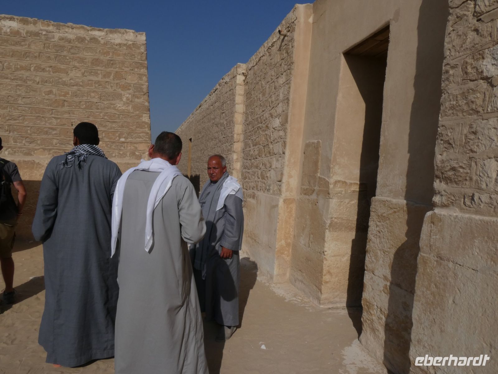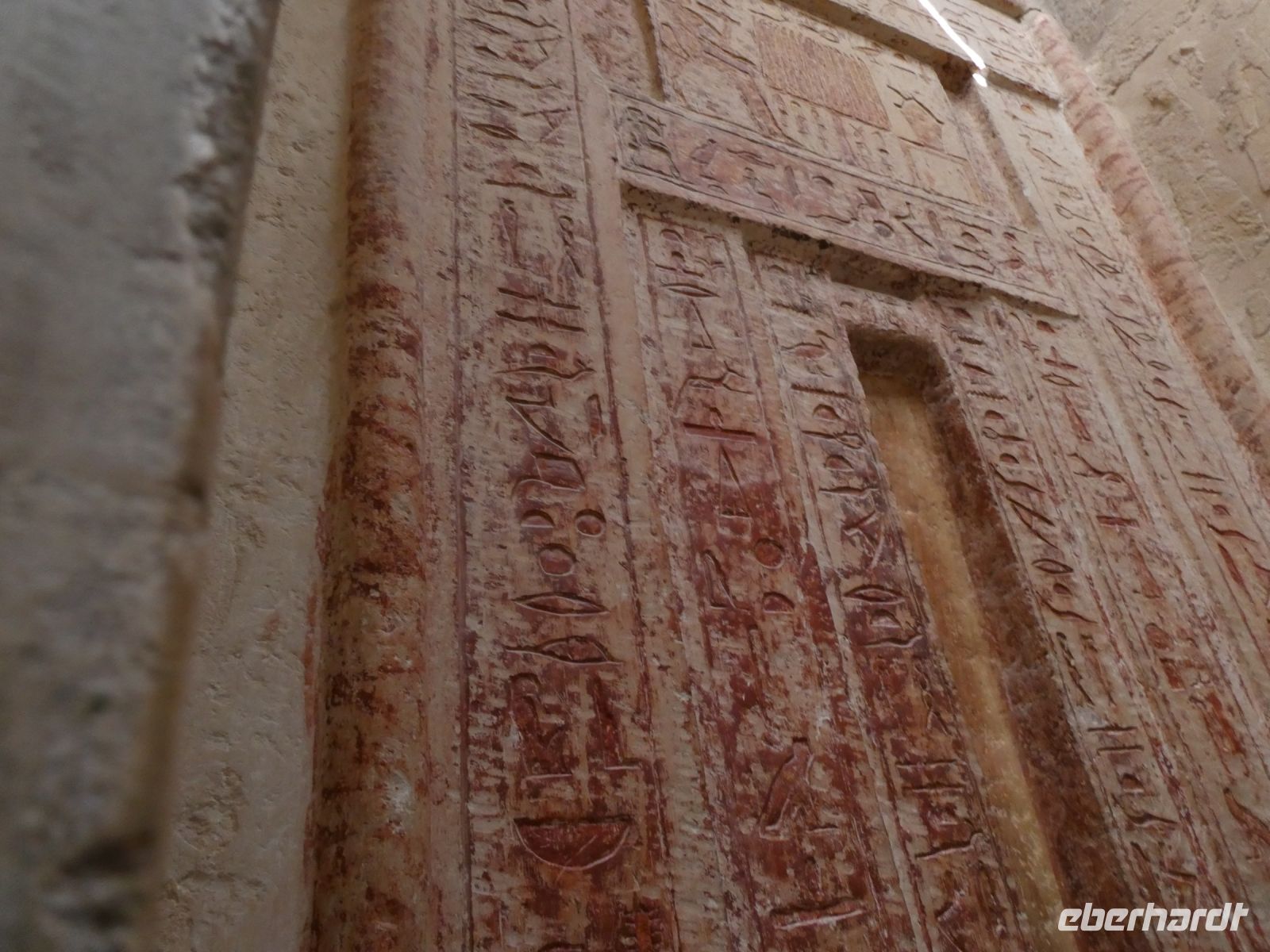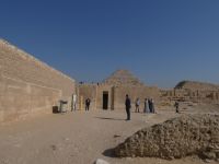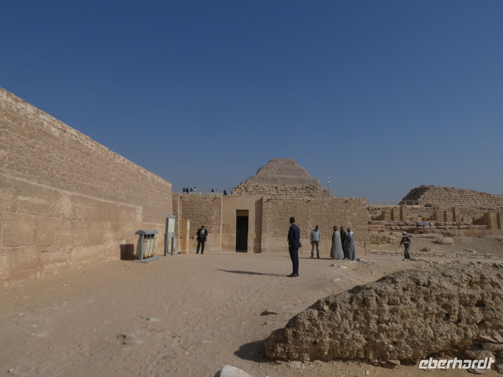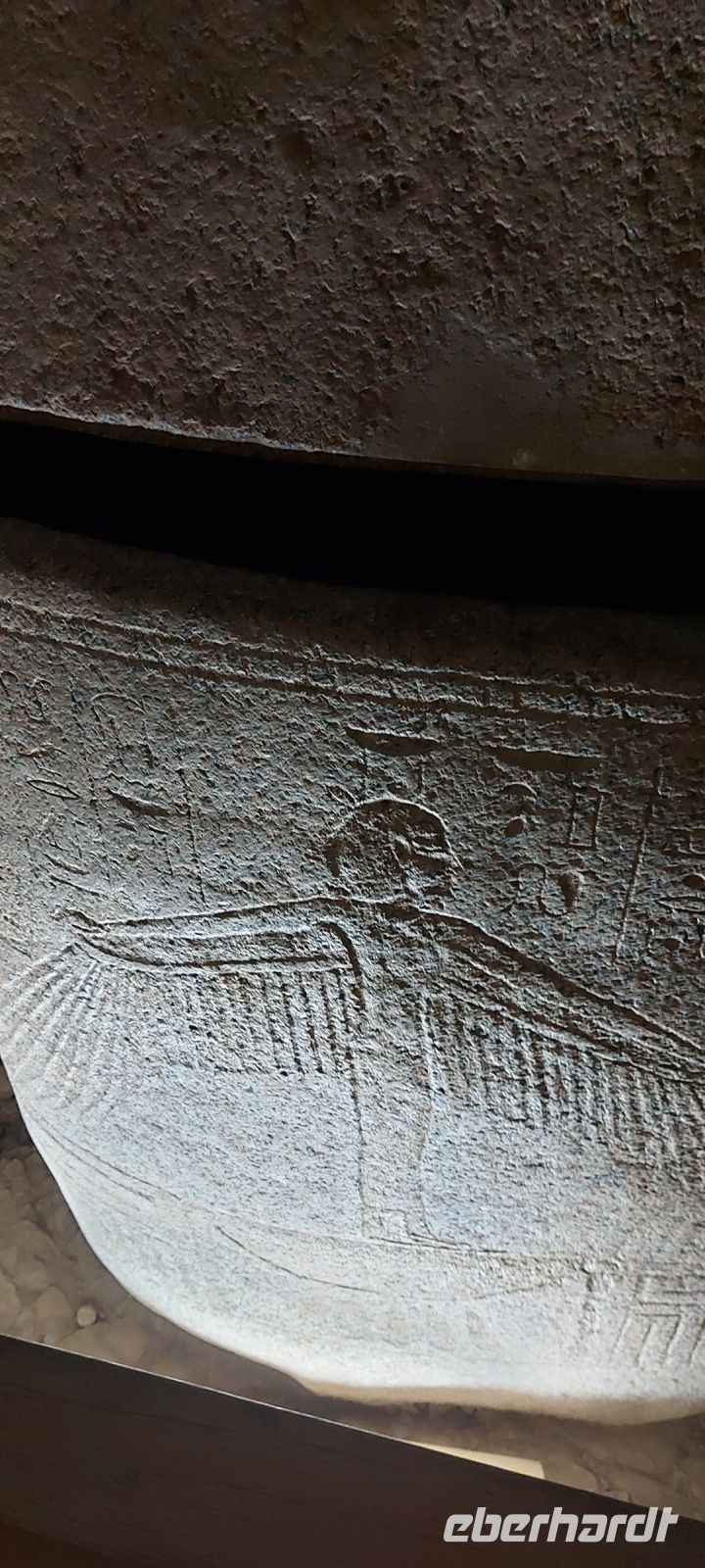 Früh morgens fahren wir mit unserem Reiseleiter nach Sakkara, wo die Grabstätten der Herrscher und hohen Würdenträger der antiken Stadt Memphis liegen. Wir machen einen Umweg, um einen Blick auf das neue Ägyptische Museum GRAND EGYPTIAN MUSEUM (GEM) zu werfen, in dem schon viele Exponate untergebracht sind. Es befindet sich in der Nähe der Pyramiden, die bald auch mit der Metro erschlossen sein werden. Auf der Fahrt hören wir viel über Geschichte, Land und Leute. In Sakkara (Saqqara), einstmals die Nekropolis von Memphis, steht die älteste Stufenpyramide der Welt des Königs Djoser. Zunächst gehen wir in die Grabkammer der Prinzessin Seschseschet Idut und bestaunen die filigranen Zeichnungen im ganzen Raum. Sie war die Tochter von Pharao Unas, dem neunten und letzten Herrscher der 5. Dynastie. Unser örtlicher Reiseleiter erklärt uns die Inschriften einer "Scheintür", die symbolisch dafür sorgen sollten, dass der begrabene Herrscher oder die Herrscherin vor dem "Totengericht" gut über sich selbst berichten kann, wie ein Ablass im Mittelalter, da man glaubte, dass sie das Portal für den Zugang ins Jenseits für die Seele des Verstorbenen seien. Später wurden Papyrusrollen mit den Biographien der Verstorbenen ins Grab gelegt, daher ist die Scheintür ein bedeutendes historisches Element dieser Grabkammer.
