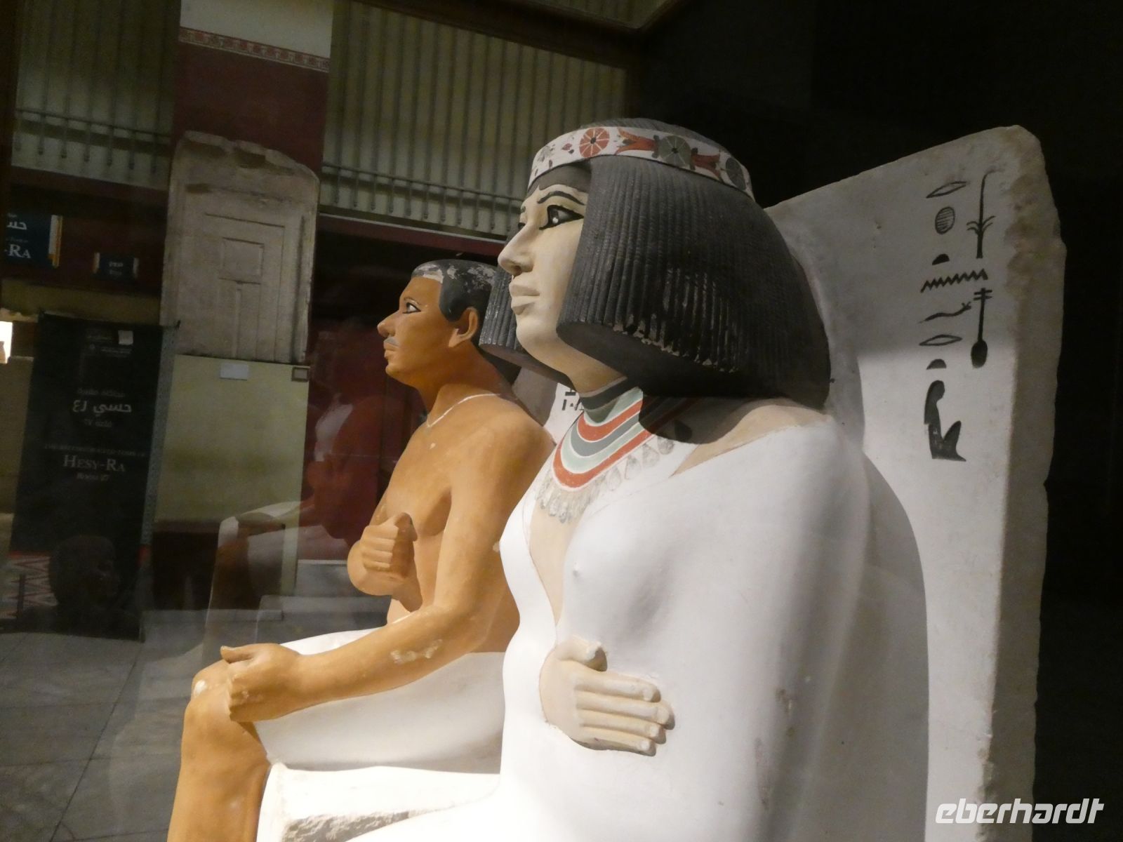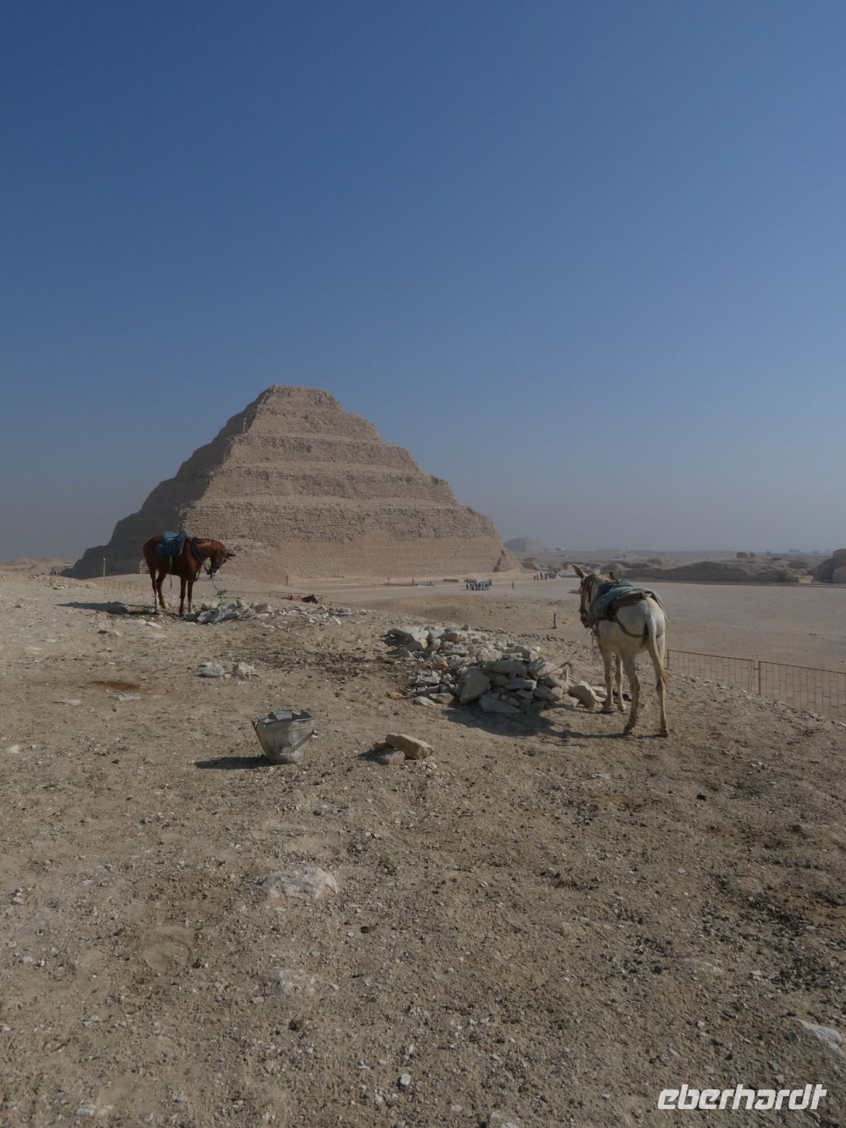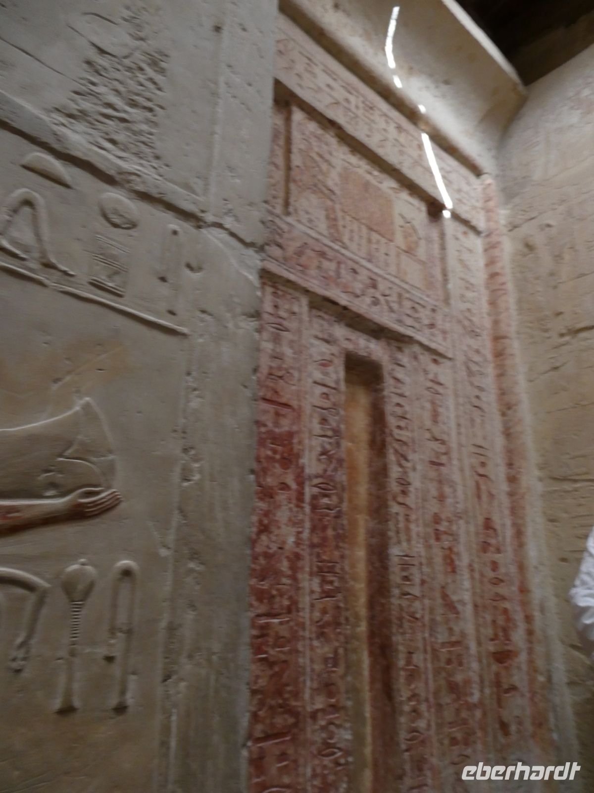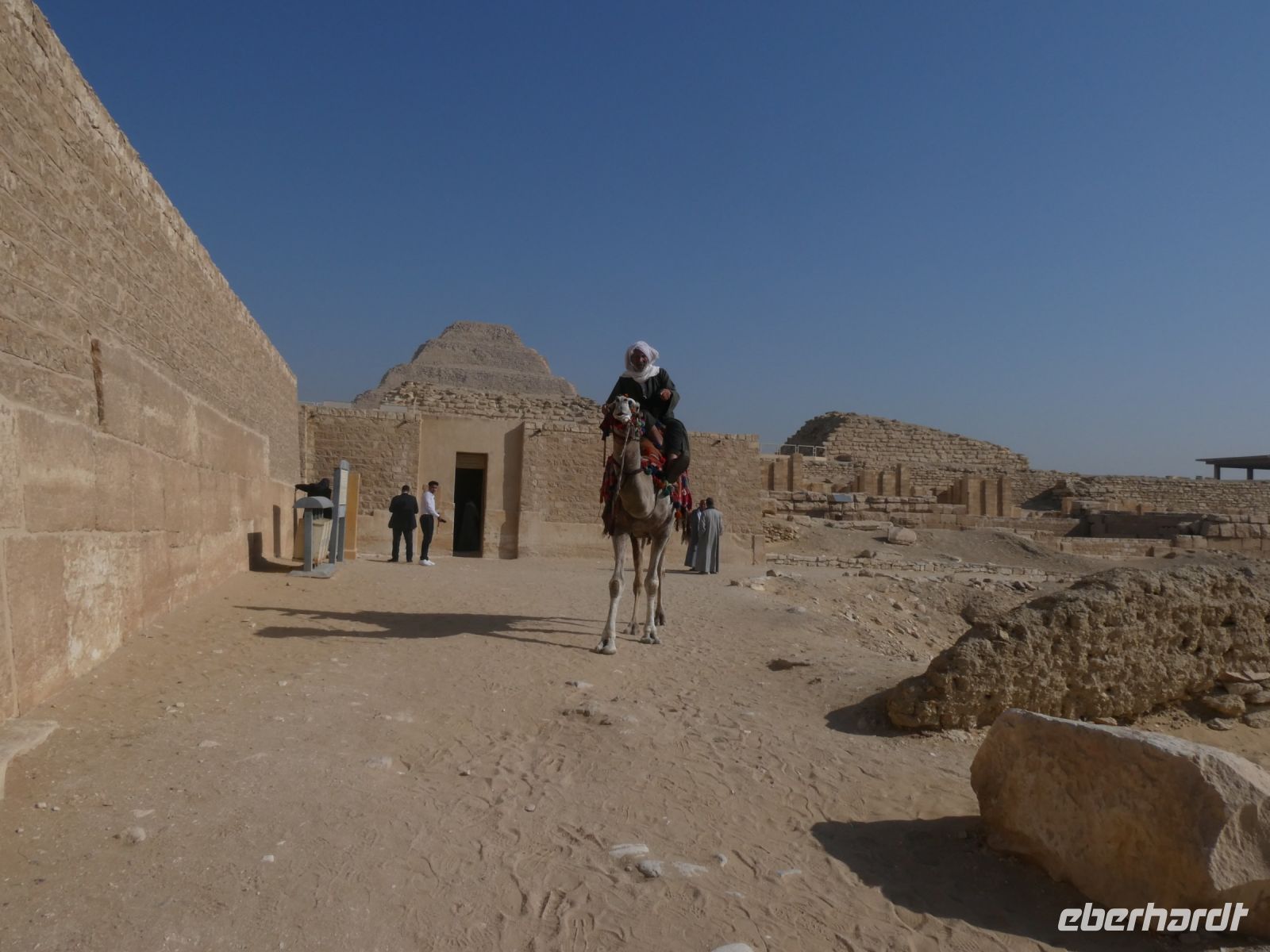 Früh morgens fahren wir mit unserem Reiseleiter nach Sakkara, wo die Grabstätten der Herrscher und hohen Würdenträger der antiken Stadt Memphis liegen. Wir machen einen Umweg, um einen Blick auf das neue Ägyptische Museum GRAND EGYPTIAN MUSEUM (GEM) zu werfen, in dem schon viele Exponate untergebracht sind. Es befindet sich in der Nähe der Pyramiden, die bald auch mit der Metro erschlossen sein werden. Auf der Fahrt hören wir viel über Geschichte, Land und Leute. In Sakkara (Saqqara), einstmals die Nekropolis von Memphis, steht die älteste Stufenpyramide der Welt des Königs Djoser. Zunächst gehen wir in die Grabkammer der Prinzessin Seschseschet Idut und bestaunen die filigranen Zeichnungen im ganzen Raum. Sie war die Tochter von Pharao Unas, dem neunten und letzten Herrscher der 5. Dynastie. Unser örtlicher Reiseleiter erklärt uns die Inschriften einer "Scheintür", die symbolisch dafür sorgen sollten, dass der begrabene Herrscher oder die Herrscherin vor dem "Totengericht" gut über sich selbst berichten kann, wie ein Ablass im Mittelalter, da man glaubte, dass sie das Portal für den Zugang ins Jenseits für die Seele des Verstorbenen seien. Später wurden Papyrusrollen mit den Biographien der Verstorbenen ins Grab gelegt, daher ist die Scheintür ein bedeutendes historisches Element dieser Grabkammer.