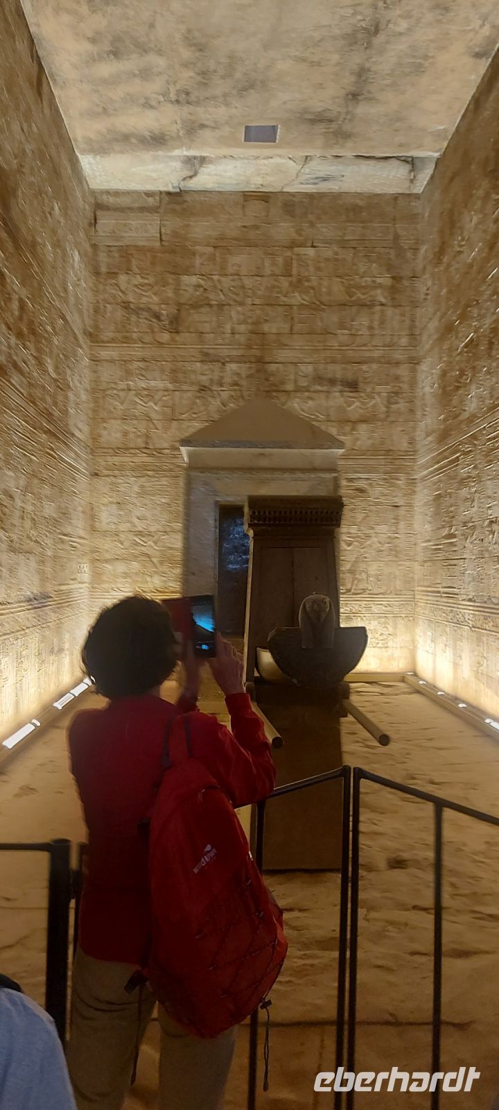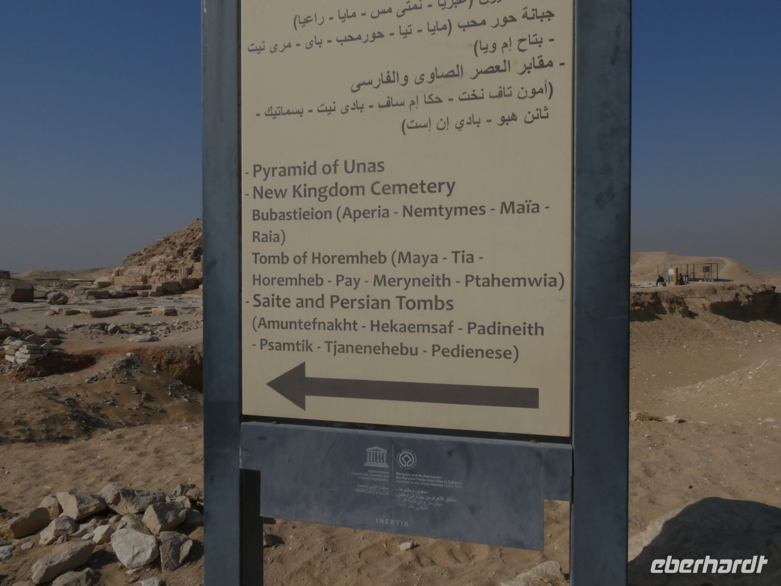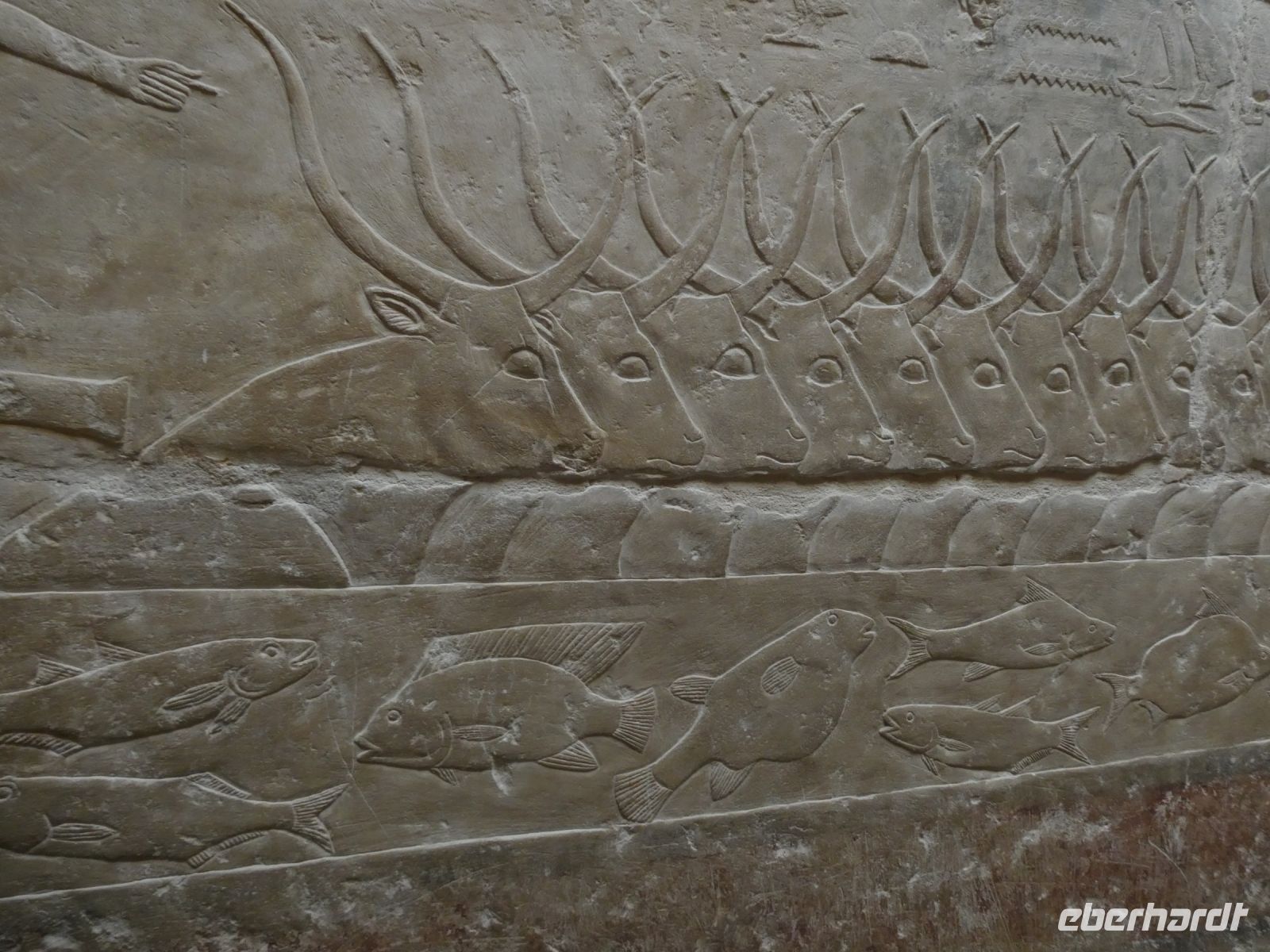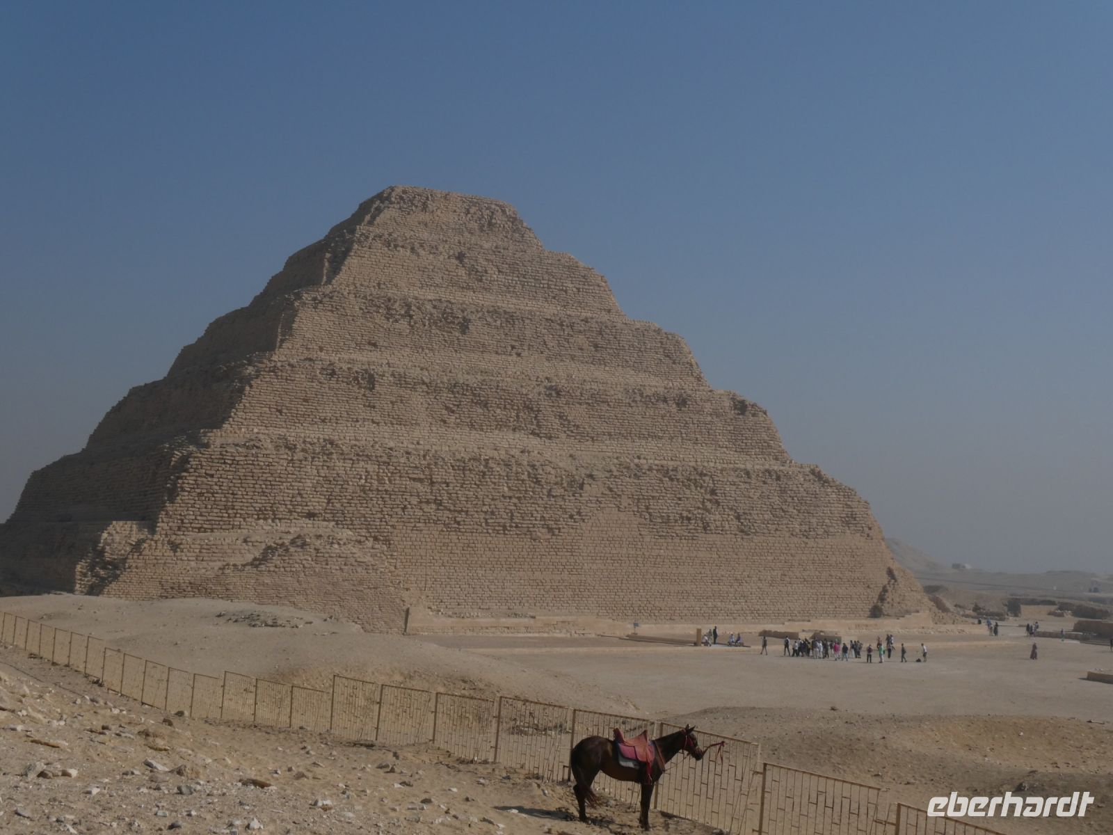 Früh morgens fahren wir mit unserem Reiseleiter nach Sakkara, wo die Grabstätten der Herrscher und hohen Würdenträger der antiken Stadt Memphis liegen. Wir machen einen Umweg, um einen Blick auf das neue Ägyptische Museum GRAND EGYPTIAN MUSEUM (GEM) zu werfen, in dem schon viele Exponate untergebracht sind. Es befindet sich in der Nähe der Pyramiden, die bald auch mit der Metro erschlossen sein werden. Auf der Fahrt hören wir viel über Geschichte, Land und Leute. In Sakkara (Saqqara), einstmals die Nekropolis von Memphis, steht die älteste Stufenpyramide der Welt des Königs Djoser. Zunächst gehen wir in die Grabkammer der Prinzessin Seschseschet Idut und bestaunen die filigranen Zeichnungen im ganzen Raum. Sie war die Tochter von Pharao Unas, dem neunten und letzten Herrscher der 5. Dynastie. Unser örtlicher Reiseleiter erklärt uns die Inschriften einer "Scheintür", die symbolisch dafür sorgen sollten, dass der begrabene Herrscher oder die Herrscherin vor dem "Totengericht" gut über sich selbst berichten kann, wie ein Ablass im Mittelalter, da man glaubte, dass sie das Portal für den Zugang ins Jenseits für die Seele des Verstorbenen seien. Später wurden Papyrusrollen mit den Biographien der Verstorbenen ins Grab gelegt, daher ist die Scheintür ein bedeutendes historisches Element dieser Grabkammer.