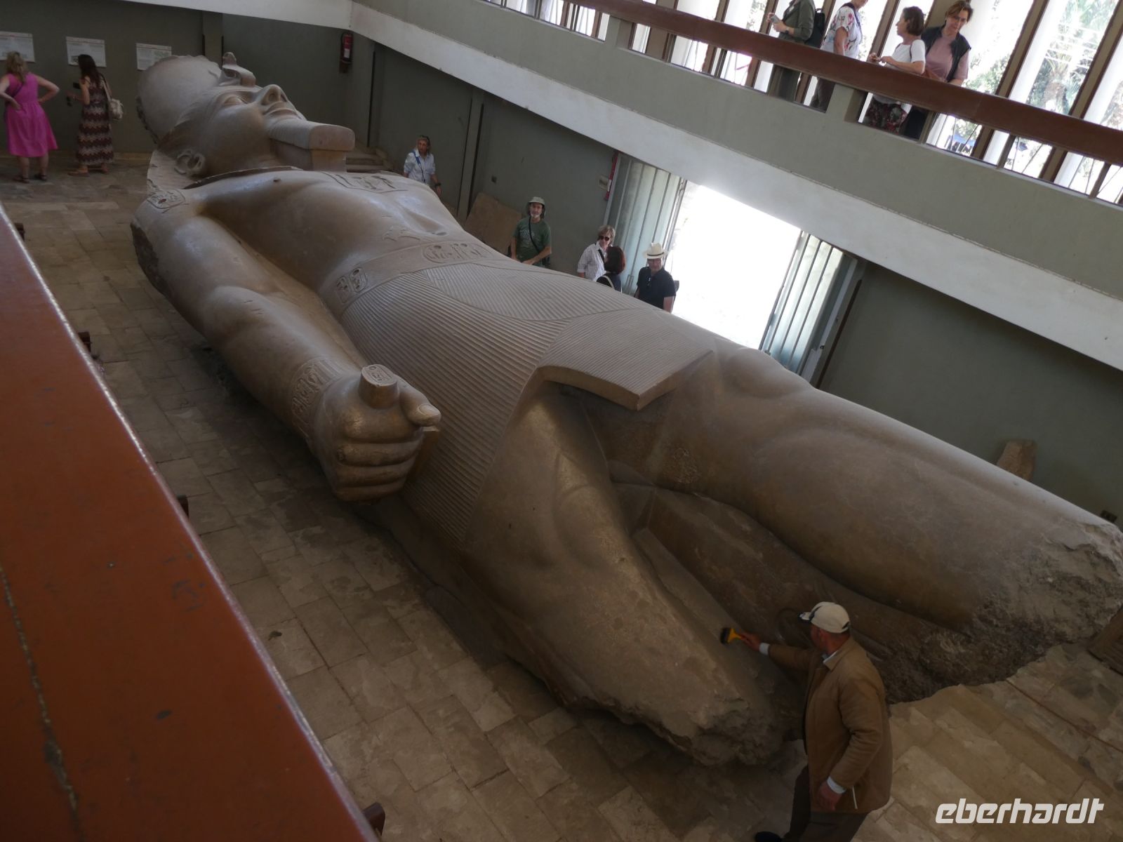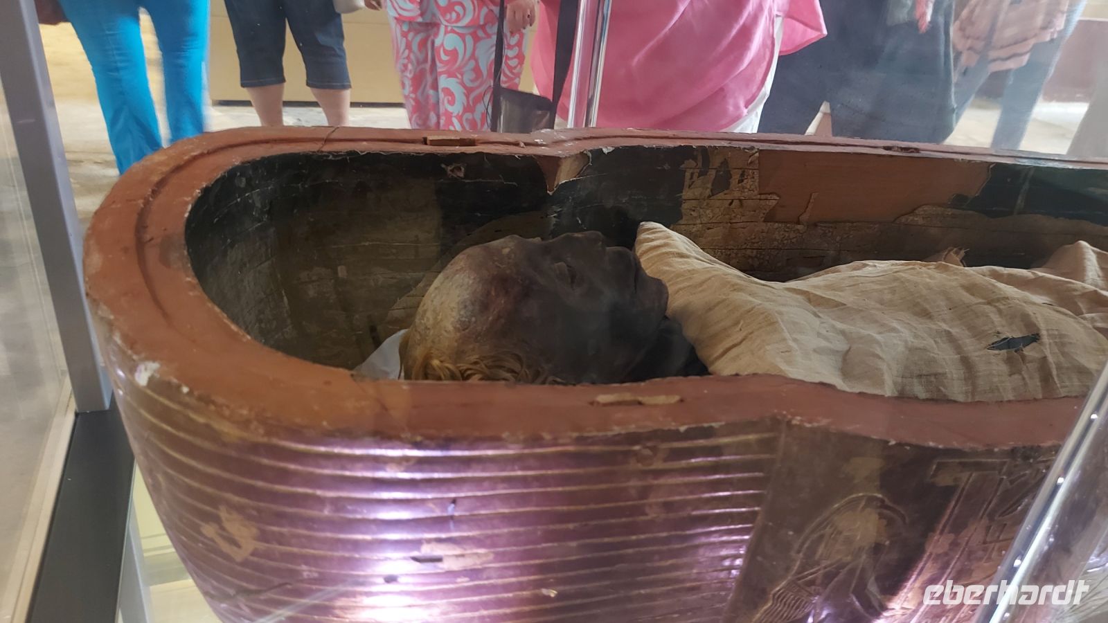 Die Sonne strahlt schon am frühen Morgen. Nach einem herrlichen Frühstück mit Blick ins Grüne begrüßt uns unser örtlicher Reiseleiter Essam, ein Ägyptologe für Studienreisen, der die ganze Reise an unserer Seite sein wird. Unser Reisebus bringt uns zunächst zum Ägyptischen Museum. Das neu gebaute Gebäude wird erst im Juli offiziell eröffnet. Das wichtigste Exponat ist noch im alten Gebäude, das wir mit unserem Reiseleiter ausführlich besichtigen. Wir sind beeindruckt von den Ausstellungsstücken zu den verschiedenen Epochen der Geschichte Ägyptens und erlernen bereits erste Zeichen der Bildsprache. Eine Mumie mit Originalhaar ist noch im Museum verblieben, weitere 21 befinden sich jetzt in einem neuen Museum. Die Informationen zu den Ausgrabungen und zum Grabschatz des Tutanchamun sind sehr beeindruckend. Sein Grab wurde im Tal der Könige ungeöffnet gefunden. Die weltberühmte Goldmaske, unzählige Grabbeigaben in mehreren Sarkophagen erzählen vom Leben des jungen Pharao.