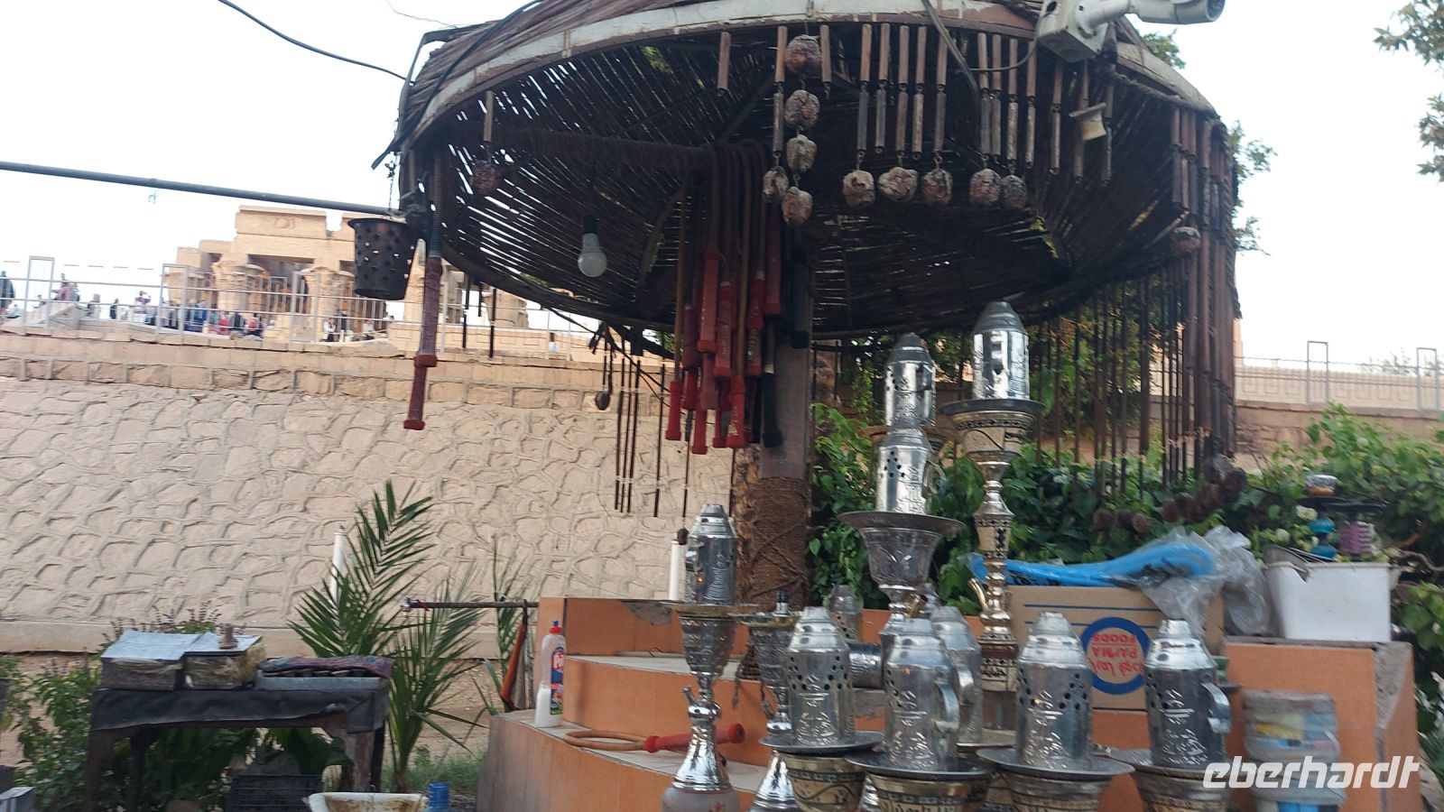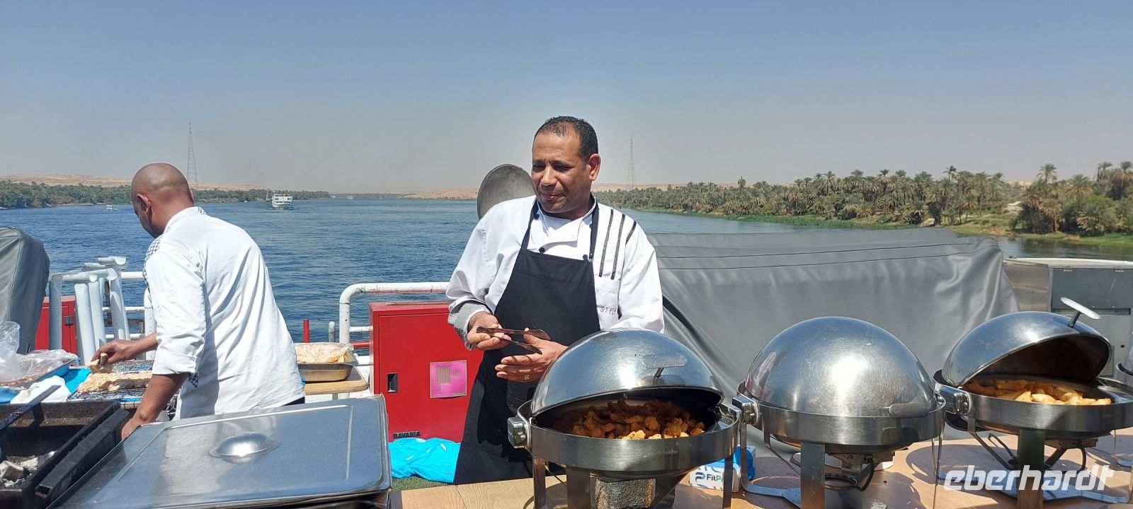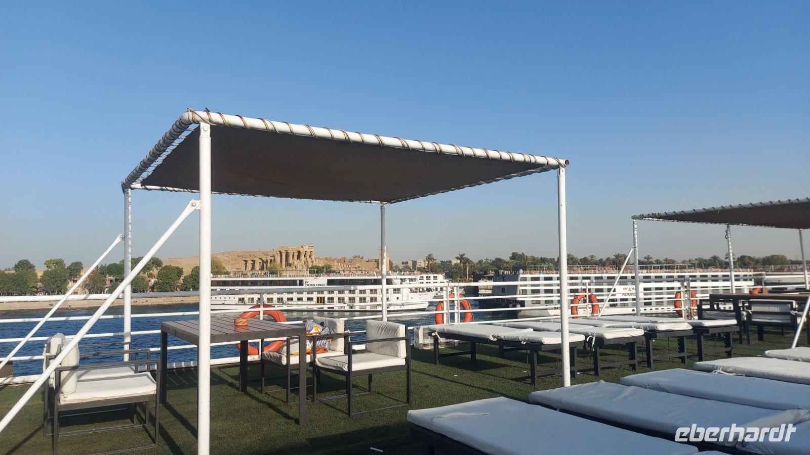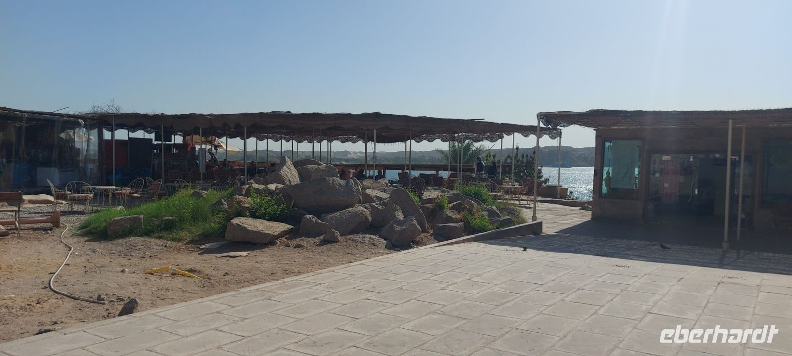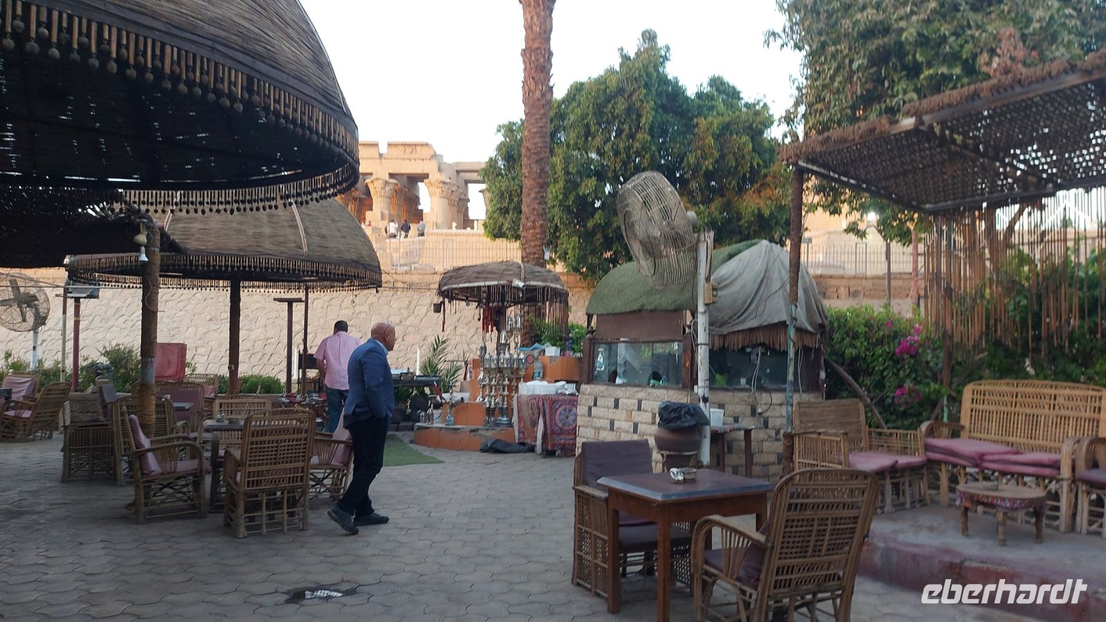 Nachmittags halten wir wieder in Kom Ombo, da neu angekommene Gäste heute die Tempelanlage besuchen. Wir verabreden uns mit unserem Reiseleiter, um in ein Teezelt nahe der Promenade zu gehen. Da Ramadan ist, gehört die schöne Zeltanlage im ägyptischen Stil nur uns. Wir wählen die Teesorten aus Bockshornklee, Malve oder Anis genießen die Ruhe im Teezelt. Essam erzählt uns typische Geschichten aus Ägypten über die Gesellschaft, die uns zum Schmunzeln bringen. Vom Zelt aus haben wir nochmals einen Blick auf die Tempelanlage Kom Ombo. Anschließend gehen wir wieder an Bord unseres Schiffes. Zum gemeinsamen Abendessen treffen wir uns wieder.