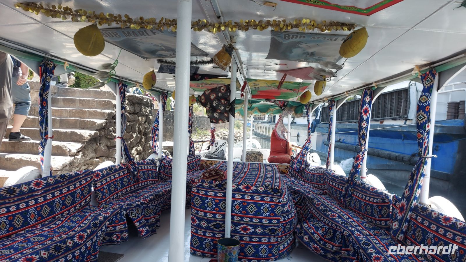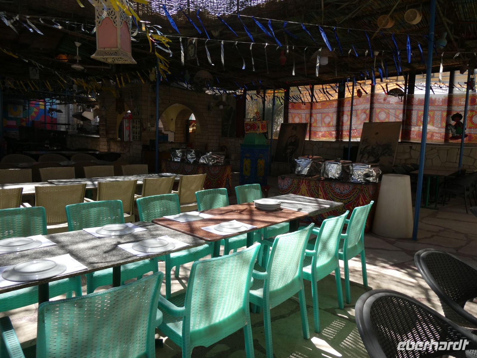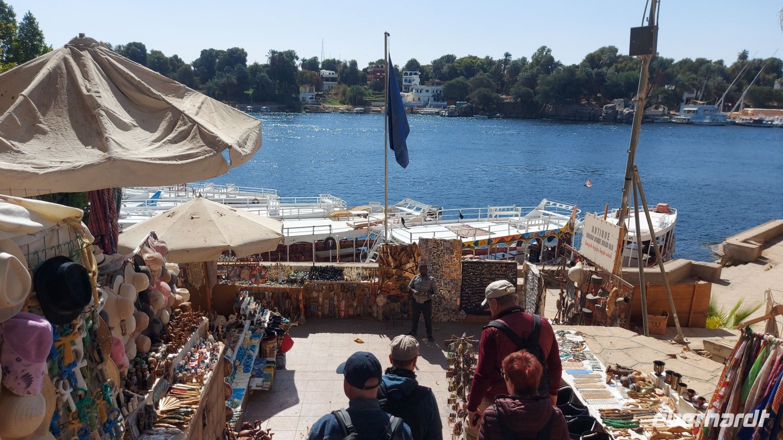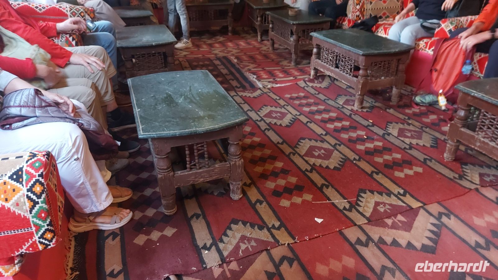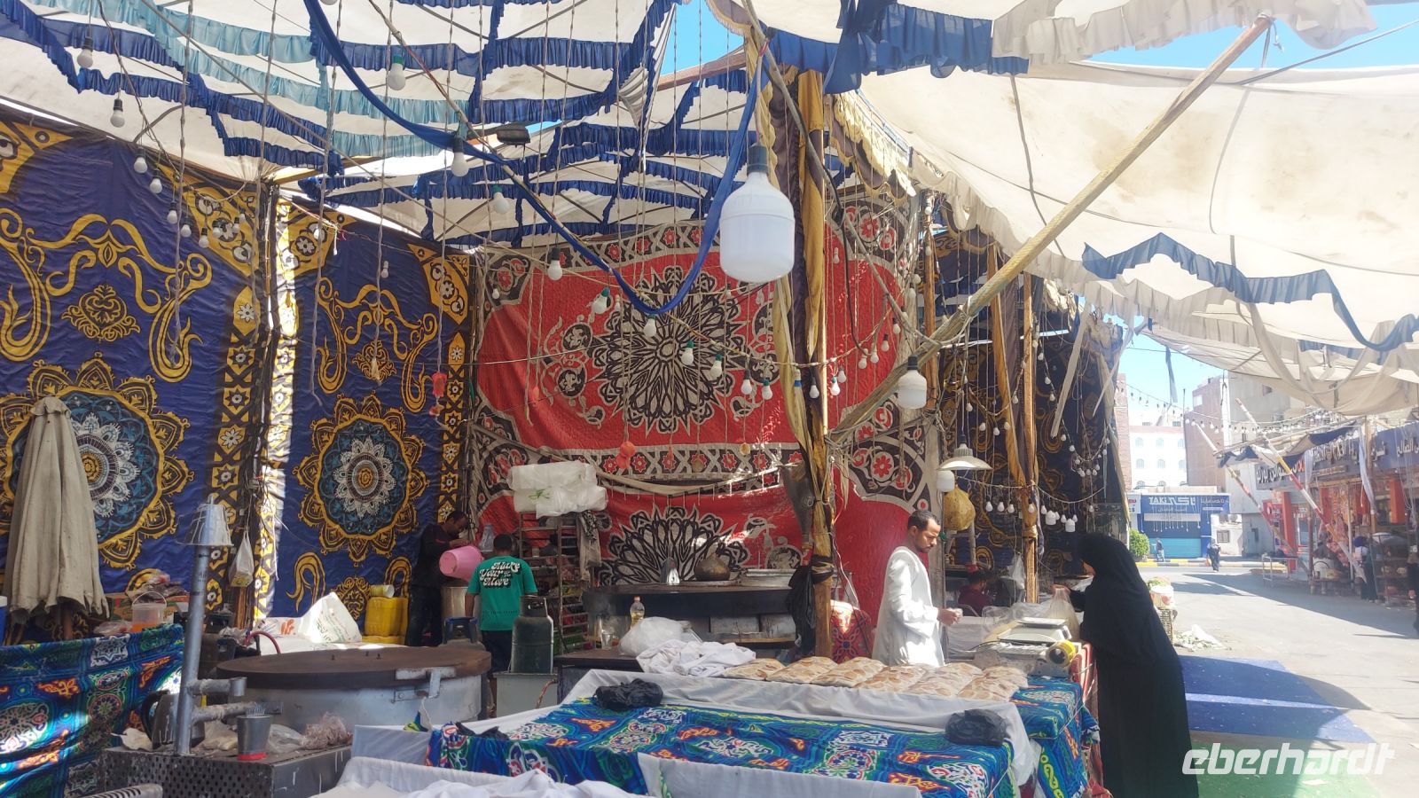 Nachmittags halten wir wieder in Kom Ombo, da neu angekommene Gäste heute die Tempelanlage besuchen. Wir verabreden uns mit unserem Reiseleiter, um in ein Teezelt nahe der Promenade zu gehen. Da Ramadan ist, gehört die schöne Zeltanlage im ägyptischen Stil nur uns. Wir wählen die Teesorten aus Bockshornklee, Malve oder Anis genießen die Ruhe im Teezelt. Essam erzählt uns typische Geschichten aus Ägypten über die Gesellschaft, die uns zum Schmunzeln bringen. Vom Zelt aus haben wir nochmals einen Blick auf die Tempelanlage Kom Ombo. Anschließend gehen wir wieder an Bord unseres Schiffes. Zum gemeinsamen Abendessen treffen wir uns wieder.