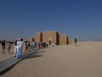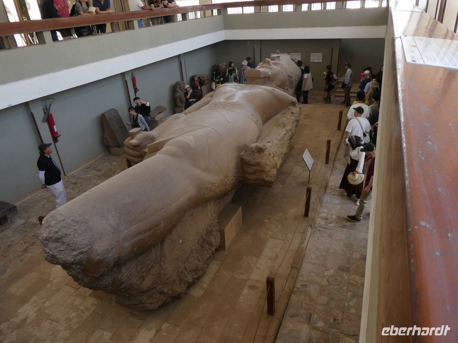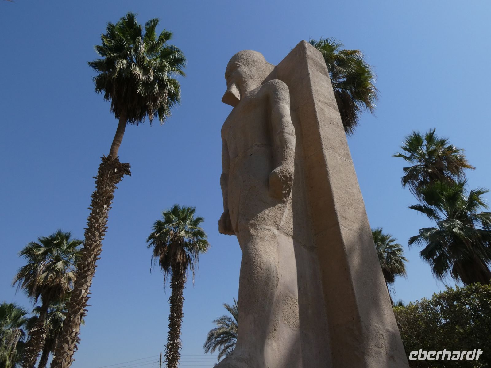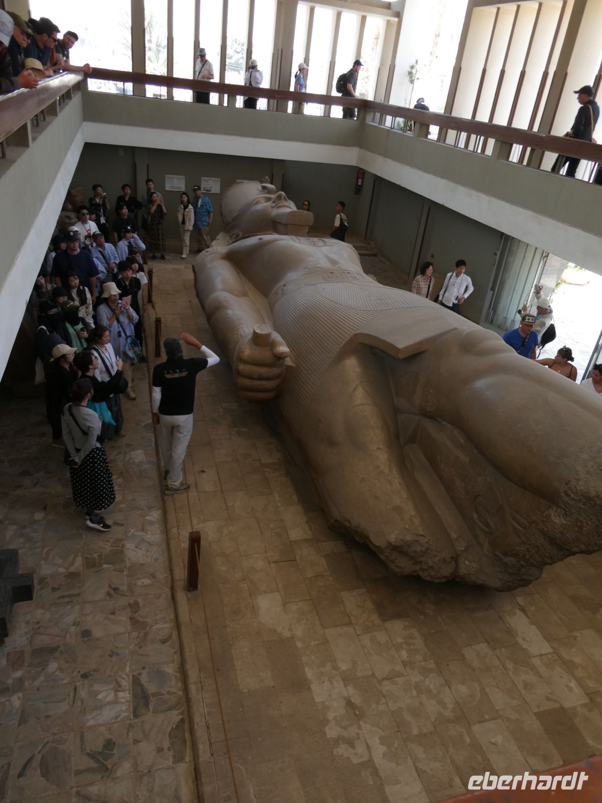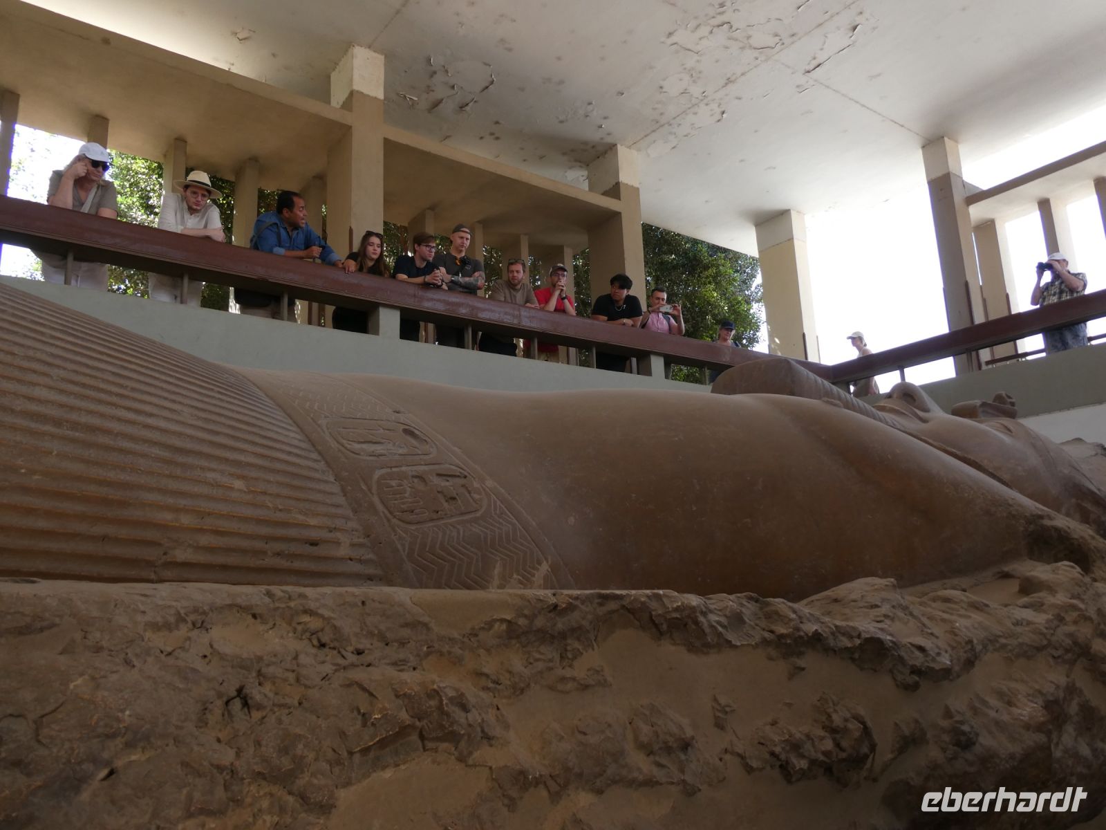 Heute ist es sehr heiß, gut, dass wir früh aufgebrochen sind zu unserem Tagesausflug. Im Anschluss gehen wir bis zur Stufenpyramide, die älteste der Welt, aus der 3. Dynastie des Alten Reiches um 2700 v. Chr. . Pyramiden gelten als "Haus der Ewigkeit" und sind den wichtigen Herrschern Ägyptens zugeordnet. Mit dem Reisebus fahren wir weiter ins nahe Memphis. Die Überreste der Stadt, die Sakkara als Nekropolis nutzte, sind vor nicht allzu langer Zeit gefunden worden. Neben einem Sphinx, der Statue von Ramses II und einigen kleineren Ausgrabungsstücken begeistert uns vor allem die riesige, tonnenschwere, liegende Statue von Ramses II, die hier gefunden und wegen ihres Gewichts nicht versetzt wurde. Wir betrachten sie ganz genau von allen Seiten und versuchen, mit unserem bereits erworbenen Wissen, die Inschriften (Kartuschen) auf der eindrucksvollen Statue zu deuten. Informationsschilder erklären die Kartuschen und berichten vom Fund der Statue.