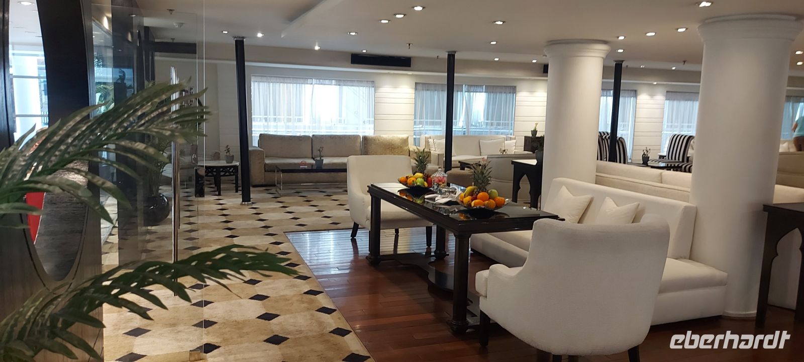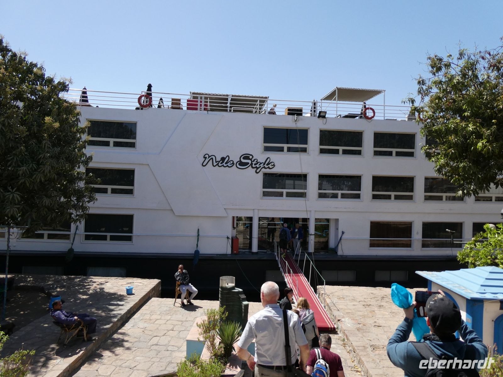 Am frühen Vormittag gehen wir in Luxor an Bord unseres Kreuzfahrtschiffes MS Nile Style auf dem Nil. Unsere Kreuzfahrt beginnt während wir das Mittagessen einnehmen, und wir sehen die Ufer des Nils aus dem Panoramafenster an uns vorbeigleiten. Das Wetter ist herrlich, und wir ruhen uns am Nachmittag in den Kabinen oder auf dem Sonnendeck aus, bevor wir uns zur täglichen Tea-Time treffen. Der breite Nil glänzt in der Sonne und wir sehen das Nilufer mit Palmen, verzeinzelten Wohnanlagen und badenden Kindern an uns vorbeigleiten. Am späten Nachmittag treffen wir an der Schleuse bei Esna ein und reisen dann weiter nach Edfu, wo wir gegen Mitternacht anlegen. Am ersten Tag unserer Nil-Kreuzfahrt werden wir vom Schiffsmanager zu einem Cocktail an Bord eingeladen, bevor das gemeinsame Abendessen beginnt.