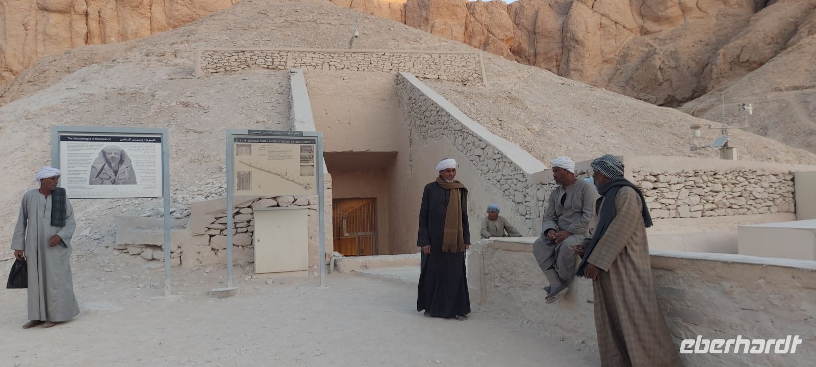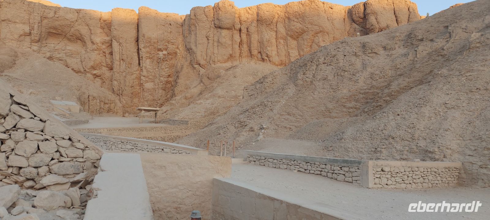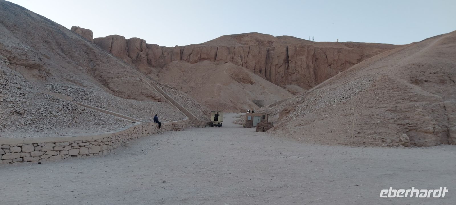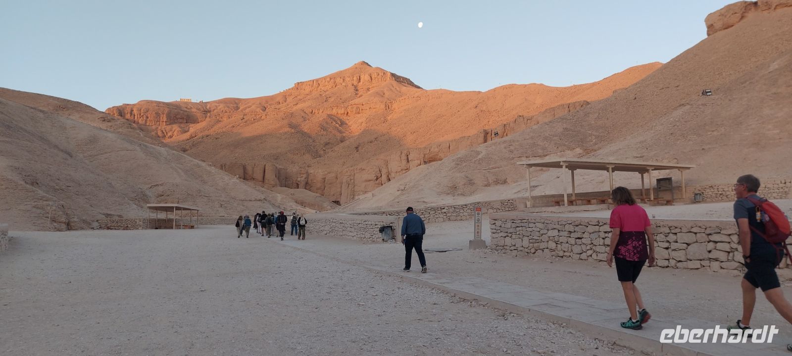 Das frühe Aufstehen hat sich gelohnt. Gleich nach dem Frühstück sind wir mit dem Reisebus zum UNESCO Weltkulturerbe Tal der Könige gefahren und waren der erste Bus auf dem Parkplatz. Das Morgenlicht entschädigt uns sofort für das frühe Aufstehen, denn das Tal liegt leer vor uns. Direkt nach der Öffnung des Tals begeben wir uns eilig bis ganz nach oben zur Grabstätte von Ramses III, die wir ganz für uns allein besichtigen können. Essam zeigt uns die Highlights des Tals des Todes und erklär die Bedeutung der Felsengräber, die nach der Pyramidenzeit verhindern sollten, dass die Gräber der Pharaonen ebenfalls geplündert werden. Die bunten Malereien, Hieroglyphen und Reliefs sind einzigartig und mit ihren Farben bis heute gut erhalten. Wir schauen uns drei Gräber an und sehen auch die Grabstätte von Tutanchamun, die erhalten blieb, weil sie unter einen weiteren Grab versteckt war.