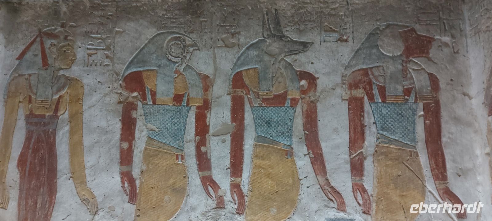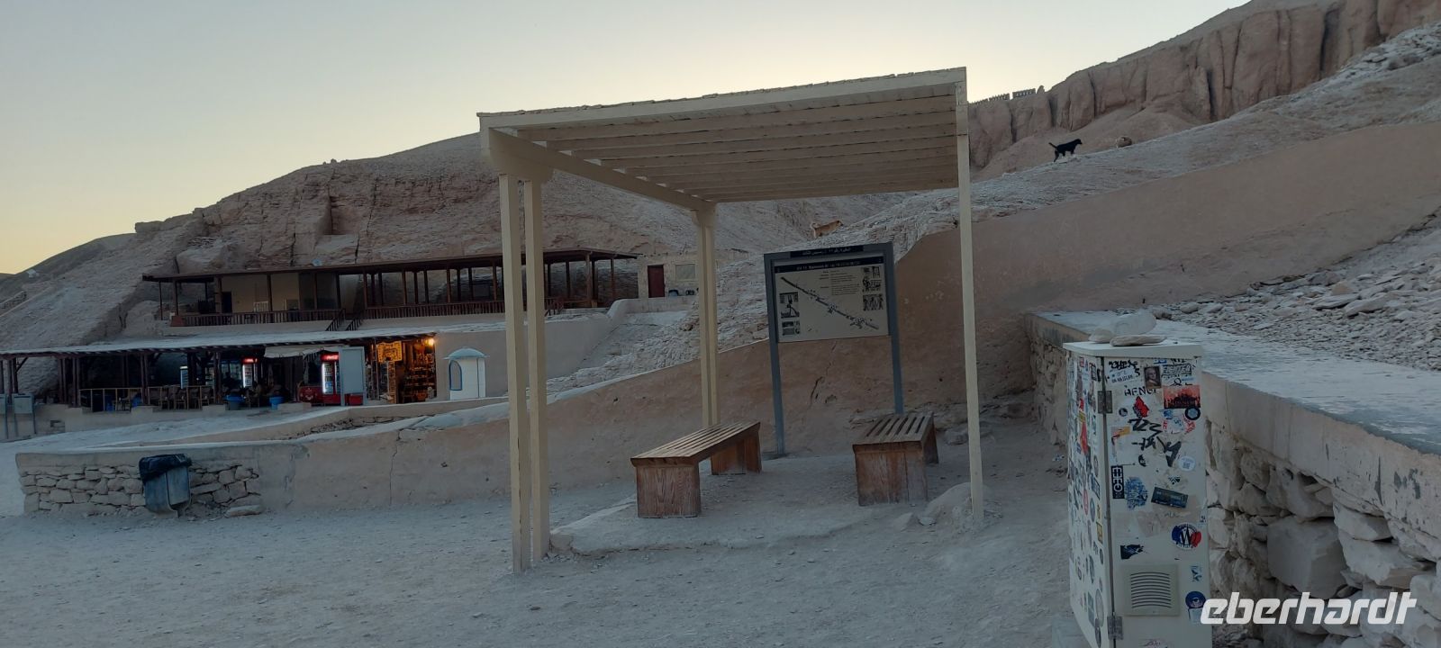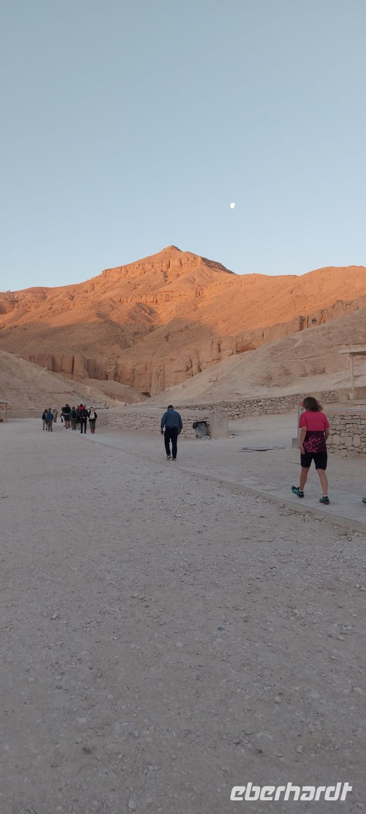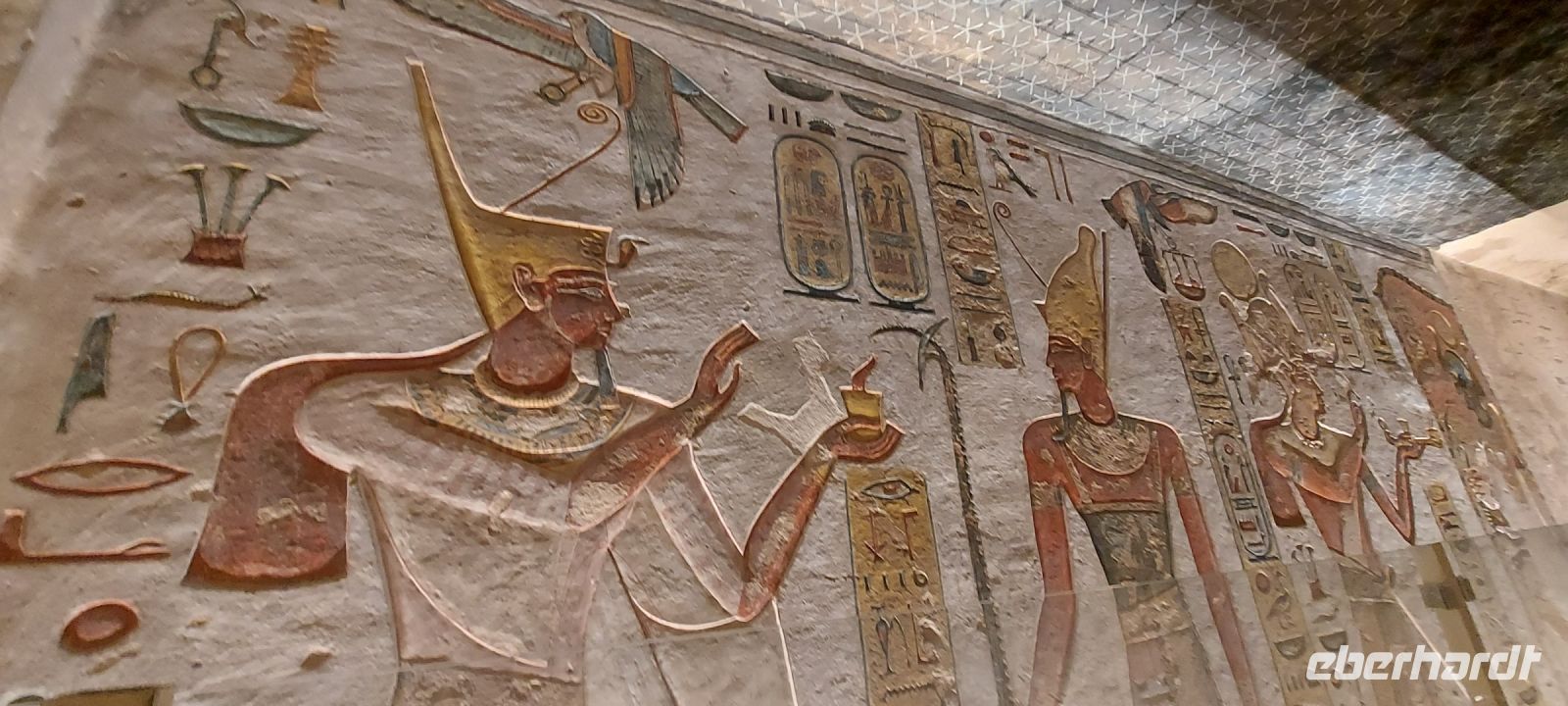 Das frühe Aufstehen hat sich gelohnt. Gleich nach dem Frühstück sind wir mit dem Reisebus zum UNESCO Weltkulturerbe Tal der Könige gefahren und waren der erste Bus auf dem Parkplatz. Das Morgenlicht entschädigt uns sofort für das frühe Aufstehen, denn das Tal liegt leer vor uns. Direkt nach der Öffnung des Tals begeben wir uns eilig bis ganz nach oben zur Grabstätte von Ramses III, die wir ganz für uns allein besichtigen können. Essam zeigt uns die Highlights des Tals des Todes und erklär die Bedeutung der Felsengräber, die nach der Pyramidenzeit verhindern sollten, dass die Gräber der Pharaonen ebenfalls geplündert werden. Die bunten Malereien, Hieroglyphen und Reliefs sind einzigartig und mit ihren Farben bis heute gut erhalten. Wir schauen uns drei Gräber an und sehen auch die Grabstätte von Tutanchamun, die erhalten blieb, weil sie unter einen weiteren Grab versteckt war.