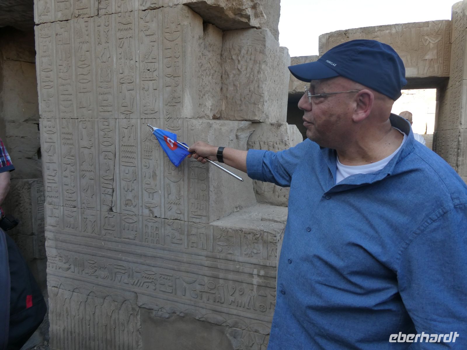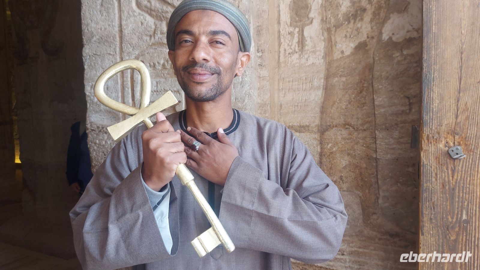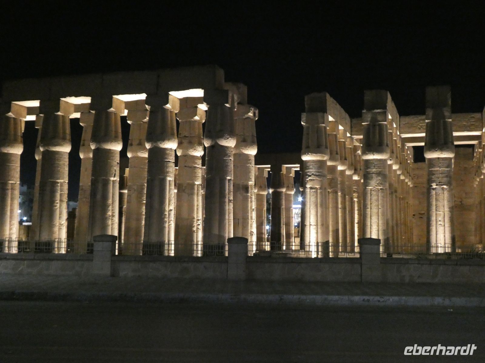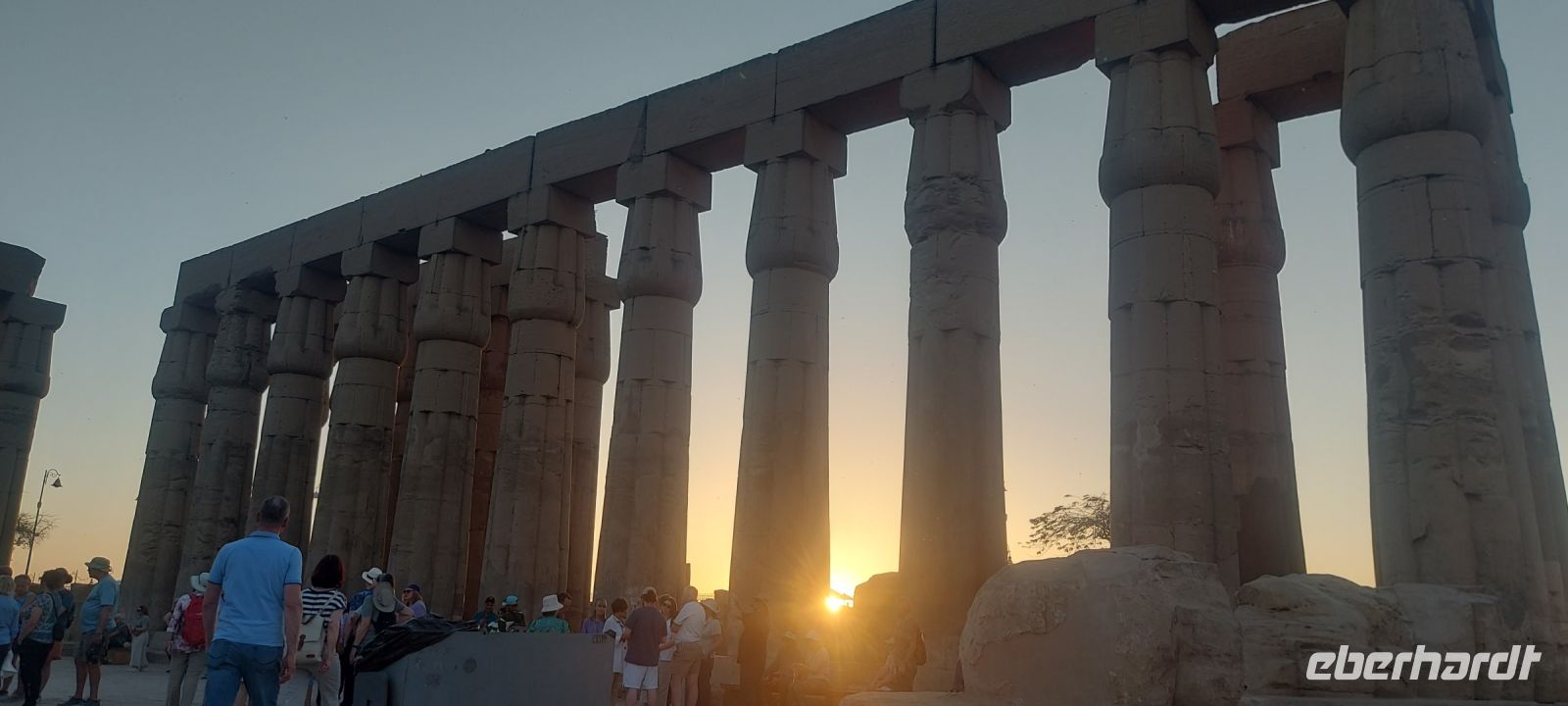Heute fahren wir von Kairo weiter in den Süden Ägyptens. Am frühen Morgen begeben wir uns zum Flughafen, um nach Luxor zu fliegen. Nach einem kurzen Flug landen wir pünktlich in Luxor und checken auf unserem Kreuzfahrtschiff auf dem Nil ein. Wir genießen ein typisches Mittagessen an Bord und lernen die Besatzung kennen, bevor wir uns zu unserem ersten Ausflug zum nahen Karnak-Tempel, dem größten Tempel Ägyptens, begeben. Der Karnak-Tempel stammt aus der Zeit um 2055 v. Chr. bis etwa 100 n. Chr. und liegt bei Theben am östlichen Nilfufer. Er wurde als Kulttempel errichtet und ist den Göttern Amun, Mut und Khonsu gewidmet. Hier ist noch ein Heiliger See erhalten, der einzige, der vollständig gesäubert und geflutet wurde. Der Begriff Karnak bedeutet "befestigtes Dorf". Tatsächlich sieht man in der Tempelanlage eine Reihe von Tempeln, Kapellen und anderen Gebäuden, die den Eindruck eines Dorfes erwecken. Allein der Säulensaal hat 134 Säulen. Anschließend besichtigen wir in Luxor den riesigen Tempel im Zentrum der Stadt. Die Statuen und der Obelisk sind beeindruckend. Der Säulensaal ist überwältigend und wir hören von unserem Reiseleiter, was die Inschriften bedeuten. Essam erklärt uns die wichtigsten Sehenswürdigkeiten der Tempelanlage. Langsam kommt die Abenddämmerung und der Tempel wird in ein schönes Licht eingetaucht. Das ist auch das Zeichen, dass die Moslems ihr Fasten brechen dürfen. Im Hintergrund hört man den Imam zum Gebet rufen. Wir haben noch Freizeit, um die riesige Tempelanlage von allen Seiten zu fotografieren, bevor wir wieder den kurzen Weg zu unserem Kreuzfahrtschiff zurückfahren, wo wir gemeinsam das Abendessen einnehmen. Anschließend sitzen einige von uns noch in der abendlichen Atmosphäre auf dem Deck des Schiffes im Hafen von Luxor und genießen die kühle Luft. Morgen heißt es früh aufzustehen, denn wir wollen das Heilige Tal in Ruhe und mit wenig Touristen genießen.