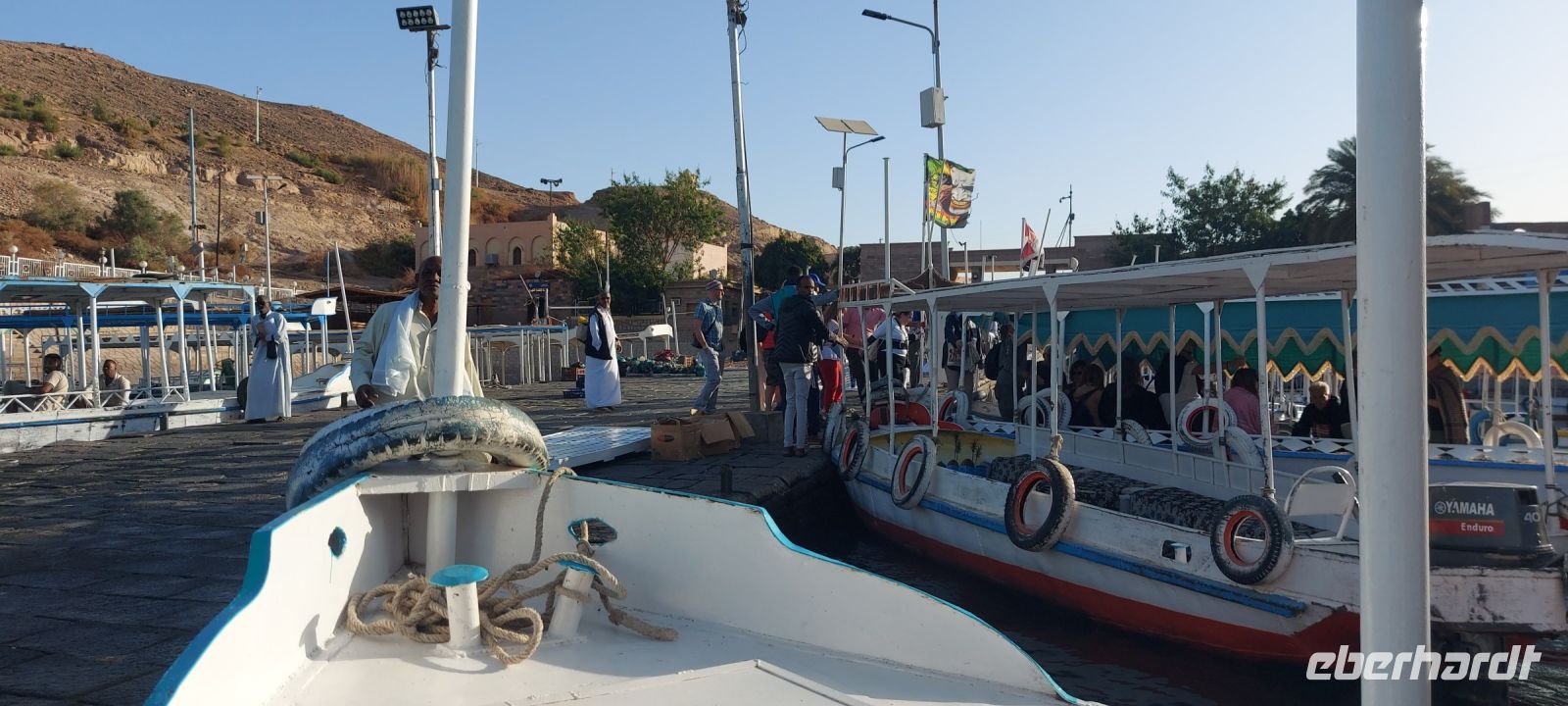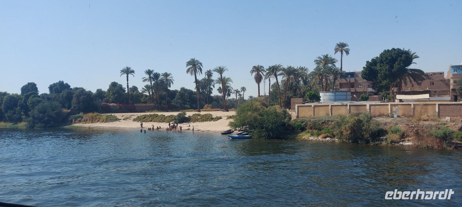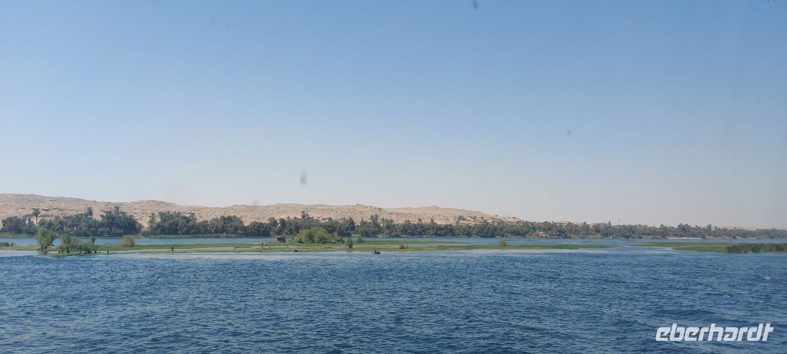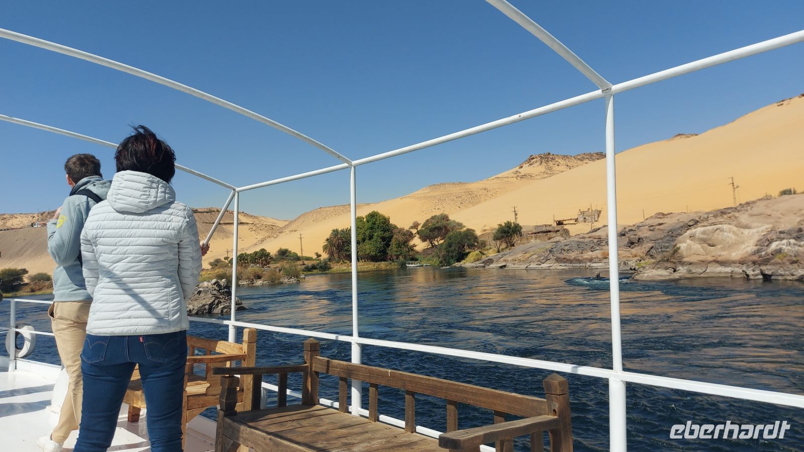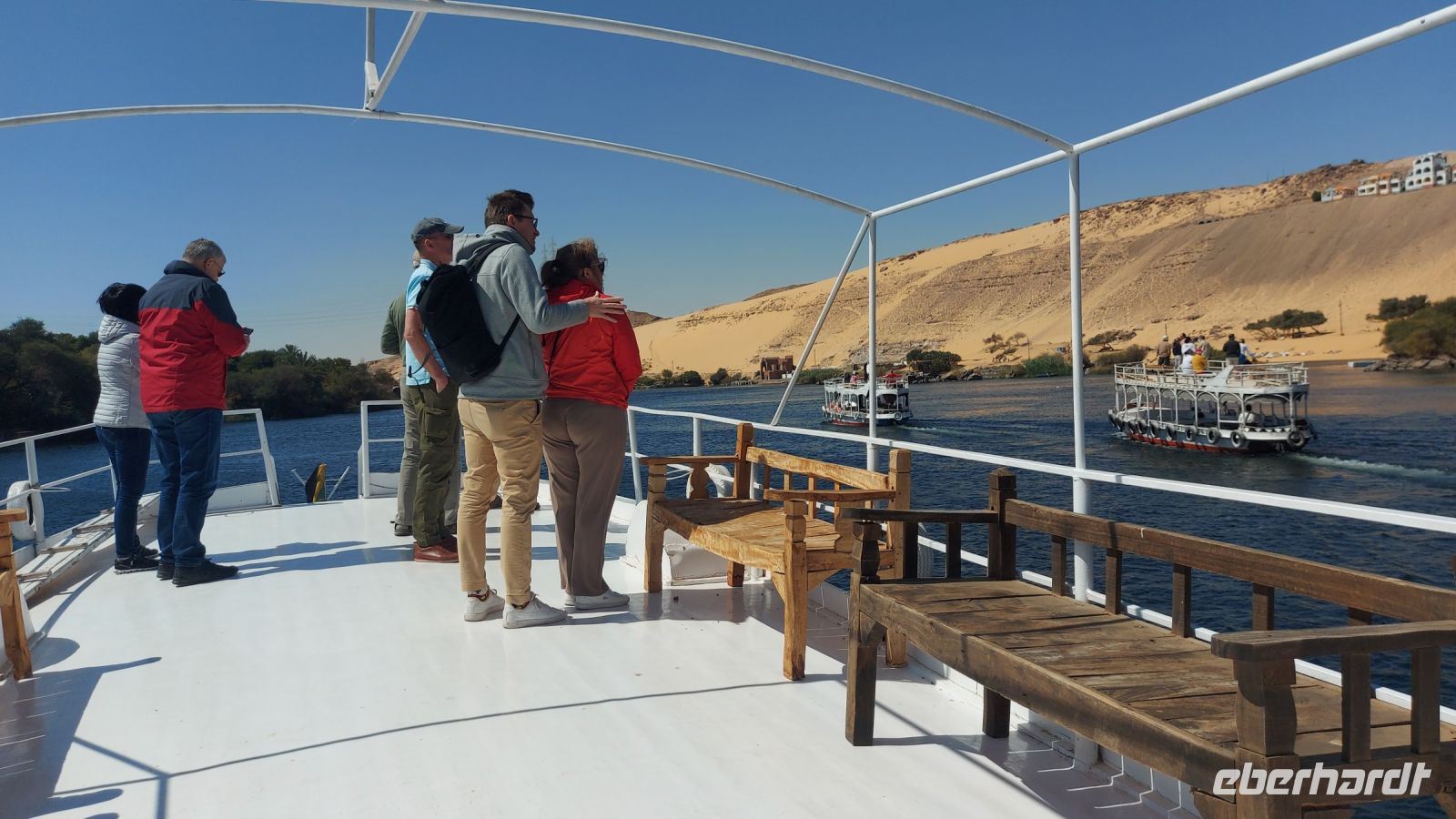 Das Wetter ist heute herrlich und der Himmel strahlend blau. Wir starten an der Promenade von Assuan mit einer Felukke, ein kleines Motorboot, das nur für unsere Gruppe reserviert ist. Der Ausblick auf das Ufer des Nils ist herrlich. Begrüßt werden wir mit einem Willkommenslied der Boots-Belegschaft. Unser erster Stopp gilt dem Botanischen Garten auf der Lord-Kitchener-Insel. Der Engländer Lord Kitchener hat den Botanischen Garten einst mit exotischen Pflanzen und Bäumen aus Asien und Afrika angelegt. Die Schilder auf den Bäumen zeugen von der ursprünglichen Herkunft. Nach dem kurzen Spaziergang über die Insel steigen wir wieder auf unser Motorboot. Die Fahrt führt durch ein Naturschutzgebiet mit Schilf und Basaltfelsen. Wir sitzen unten oder oben auf dem Sonnendach und genießen die herrliche Aussicht, bis wir in einem nubischen Dorf angelangt sind. Wir sind die einzigen Besucher dort und machen einen Spaziergang durch die Gassen aus Sand bis zur Moschee des Dorfes. Natürlich sind einige Einwohner - und vor allem Kinder - interessiert an uns und kommen zum Hauptplatz vor der Moschee, wo sie ihr Handwerk anbieten. Dann steigen wir wieder auf unser Boot. Wir genießen die Rückfahrt in der Sonne, mit leichtem Wind. Auf der Fahrt kommen wir an dem Hotel vorbei, in dem Agatha Christie "Tod auf dem Nil" auf dem Balkon geschrieben. Das Mittagessen nehmen wir wieder an Bord unseres Nil-Kreuzfahrtschiffes ein, das am frühen Nachmittag Richtung Luxor ablegt.