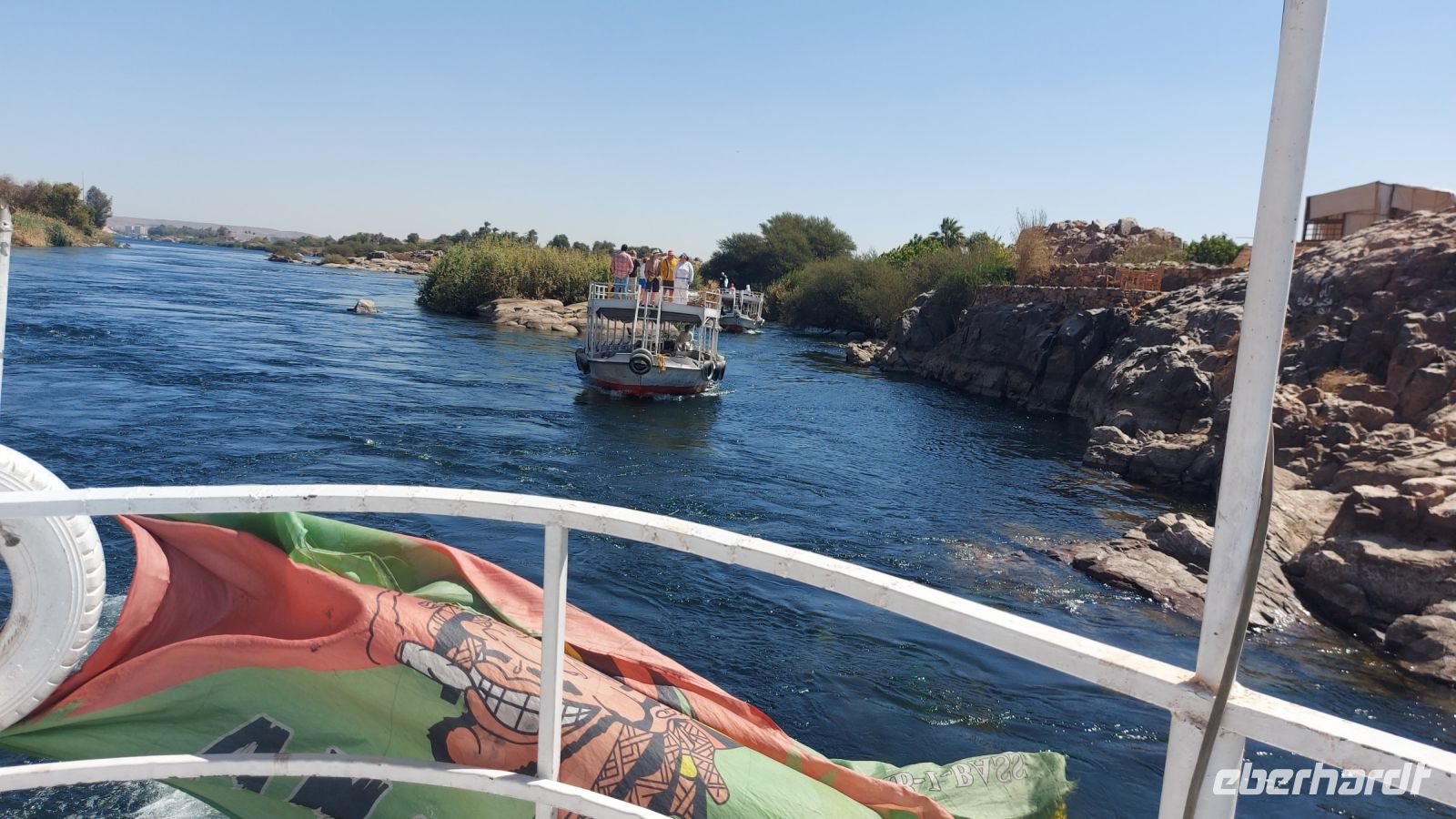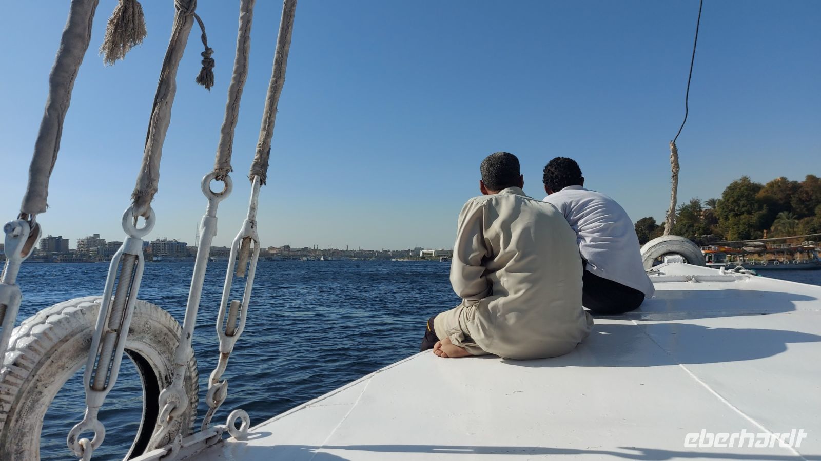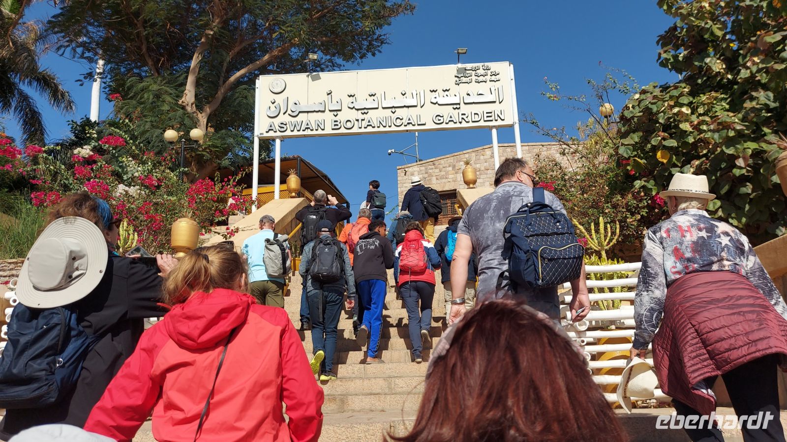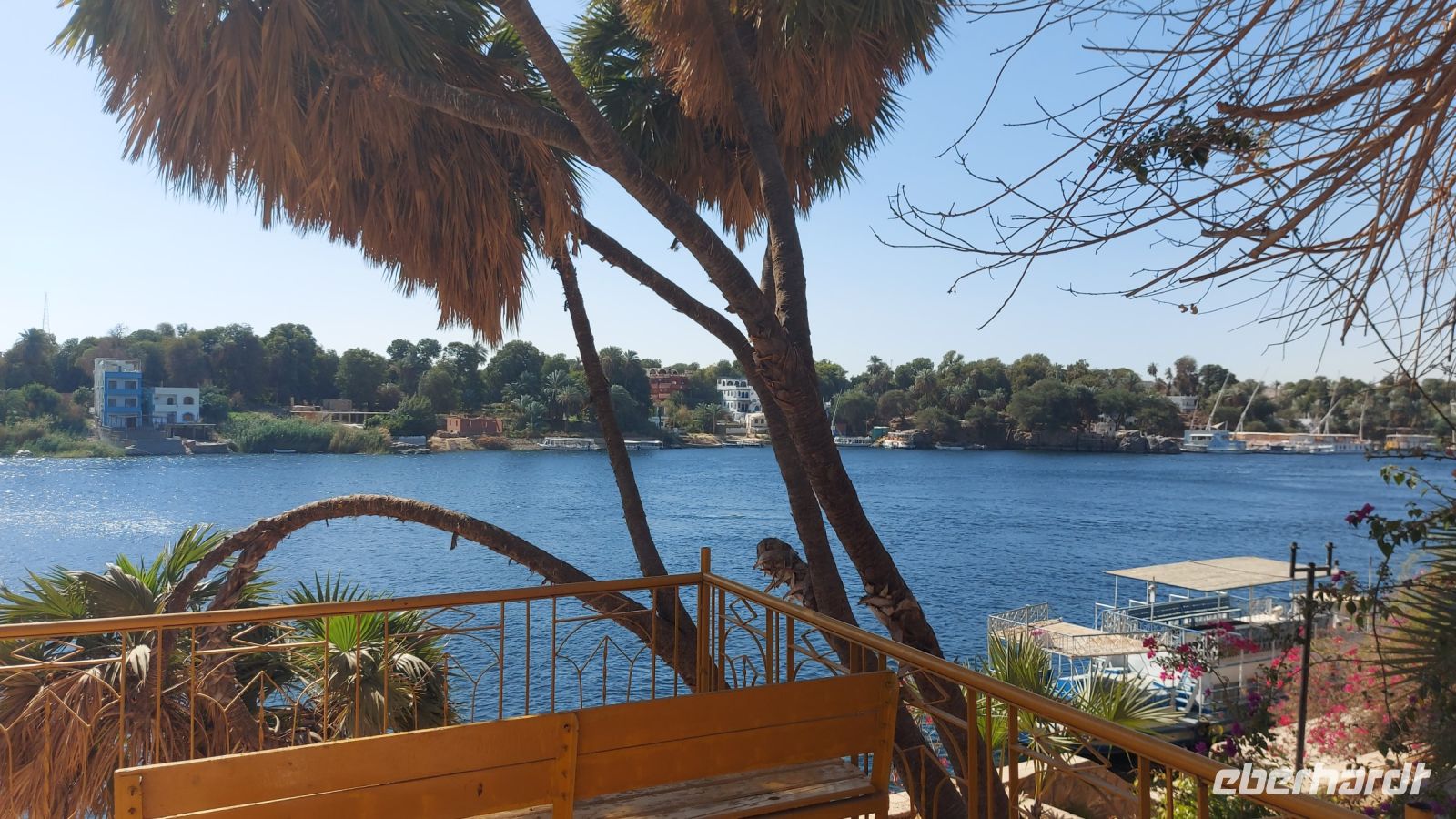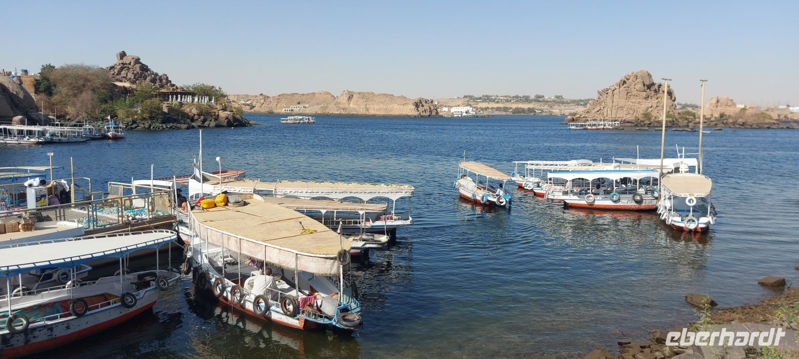 Das Wetter ist heute herrlich und der Himmel strahlend blau. Wir starten an der Promenade von Assuan mit einer Felukke, ein kleines Motorboot, das nur für unsere Gruppe reserviert ist. Der Ausblick auf das Ufer des Nils ist herrlich. Begrüßt werden wir mit einem Willkommenslied der Boots-Belegschaft. Unser erster Stopp gilt dem Botanischen Garten auf der Lord-Kitchener-Insel. Der Engländer Lord Kitchener hat den Botanischen Garten einst mit exotischen Pflanzen und Bäumen aus Asien und Afrika angelegt. Die Schilder auf den Bäumen zeugen von der ursprünglichen Herkunft. Nach dem kurzen Spaziergang über die Insel steigen wir wieder auf unser Motorboot. Die Fahrt führt durch ein Naturschutzgebiet mit Schilf und Basaltfelsen. Wir sitzen unten oder oben auf dem Sonnendach und genießen die herrliche Aussicht, bis wir in einem nubischen Dorf angelangt sind. Wir sind die einzigen Besucher dort und machen einen Spaziergang durch die Gassen aus Sand bis zur Moschee des Dorfes. Natürlich sind einige Einwohner - und vor allem Kinder - interessiert an uns und kommen zum Hauptplatz vor der Moschee, wo sie ihr Handwerk anbieten. Dann steigen wir wieder auf unser Boot. Wir genießen die Rückfahrt in der Sonne, mit leichtem Wind. Auf der Fahrt kommen wir an dem Hotel vorbei, in dem Agatha Christie "Tod auf dem Nil" auf dem Balkon geschrieben. Das Mittagessen nehmen wir wieder an Bord unseres Nil-Kreuzfahrtschiffes ein, das am frühen Nachmittag Richtung Luxor ablegt.