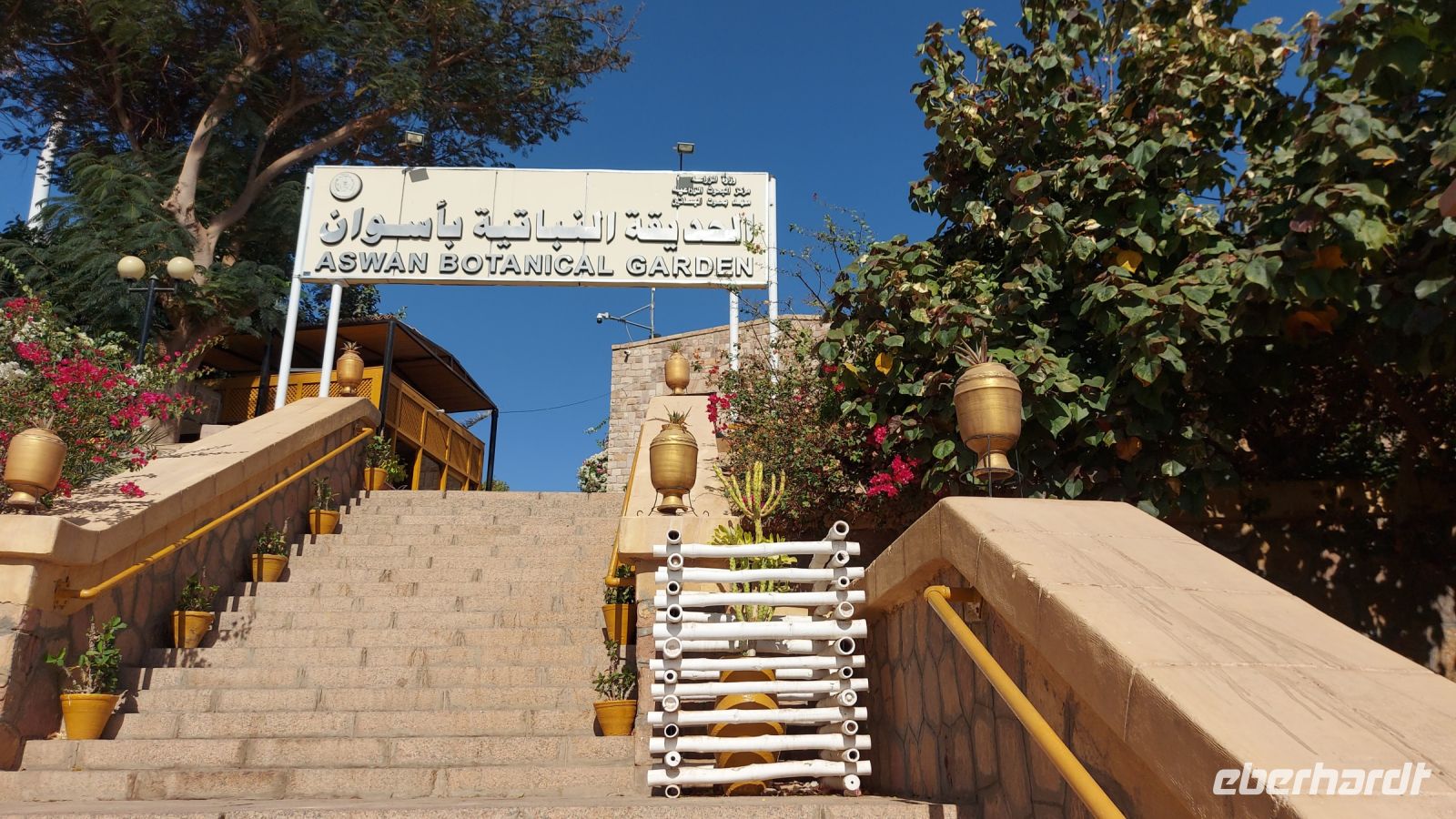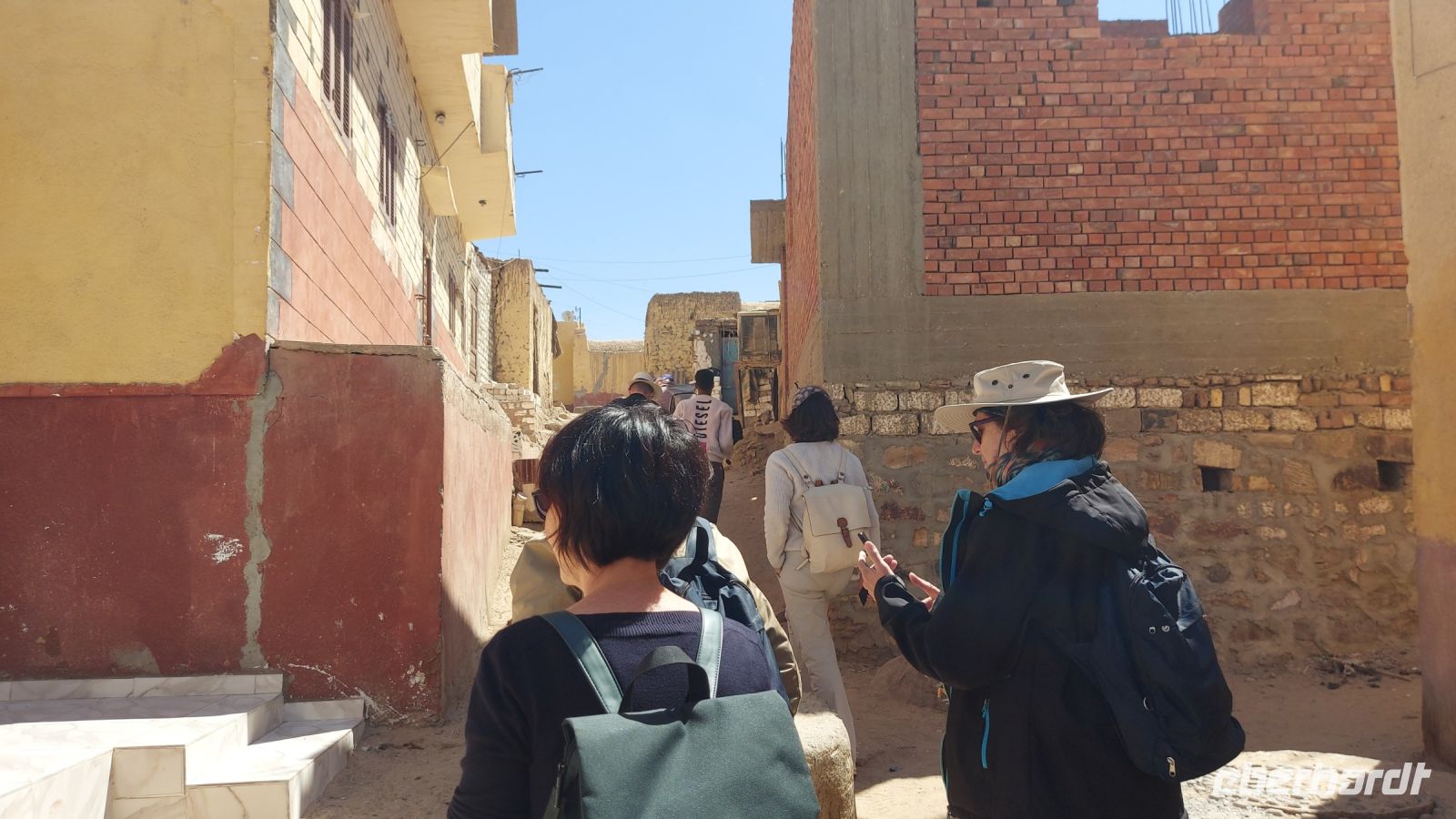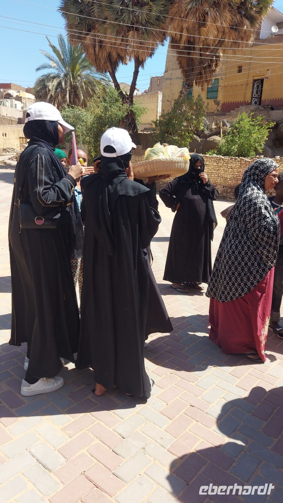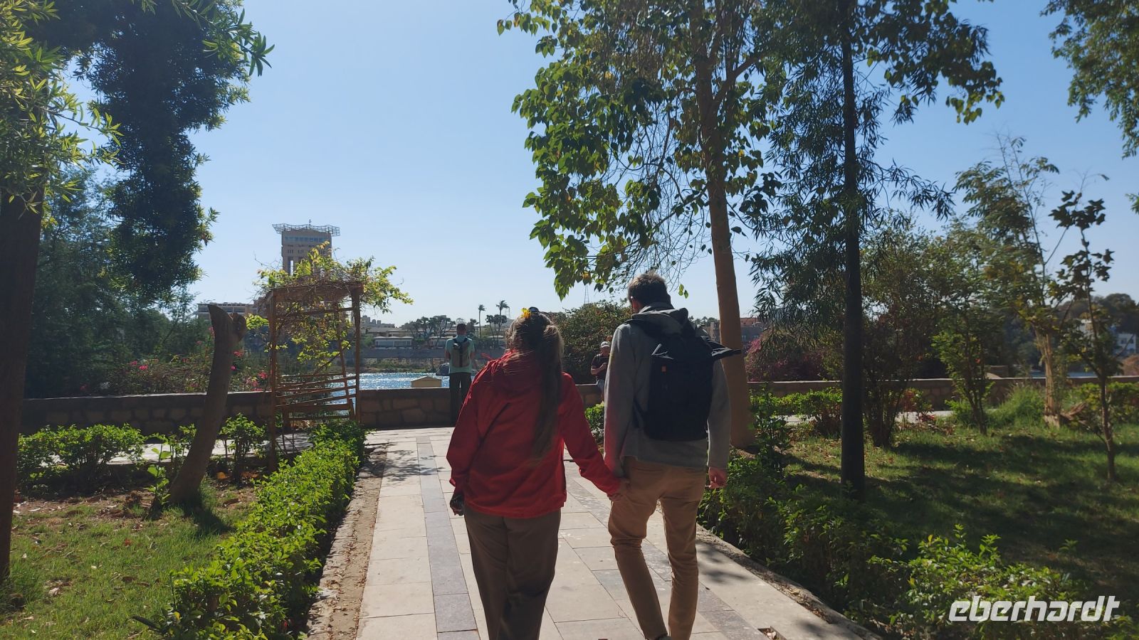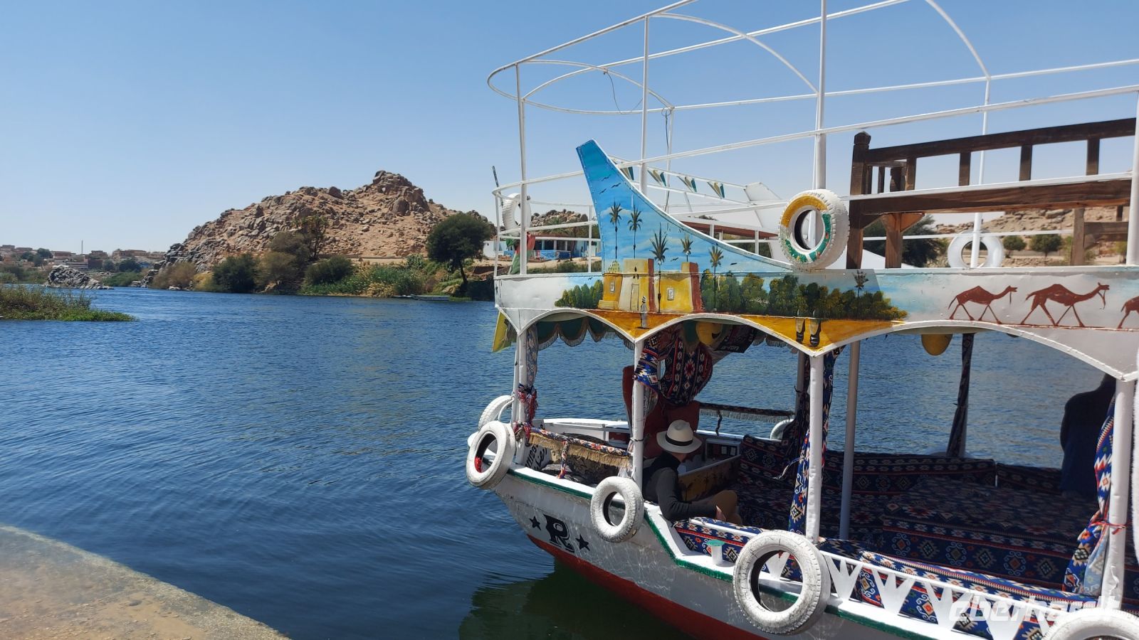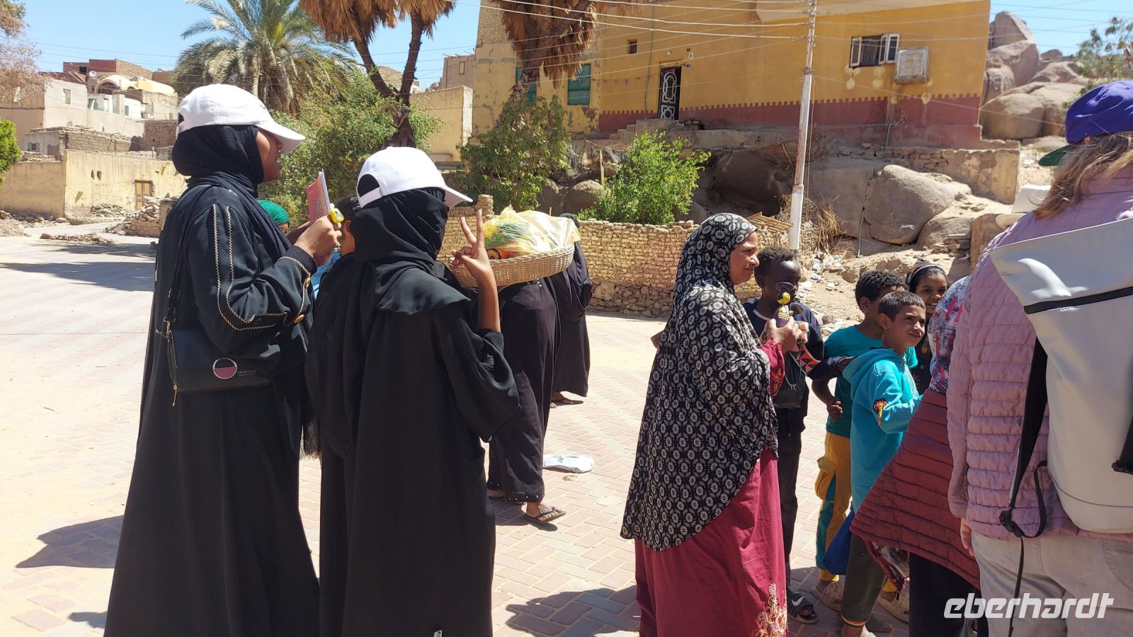 Das Wetter ist heute herrlich und der Himmel strahlend blau. Wir starten an der Promenade von Assuan mit einer Felukke, ein kleines Motorboot, das nur für unsere Gruppe reserviert ist. Der Ausblick auf das Ufer des Nils ist herrlich. Begrüßt werden wir mit einem Willkommenslied der Boots-Belegschaft. Unser erster Stopp gilt dem Botanischen Garten auf der Lord-Kitchener-Insel. Der Engländer Lord Kitchener hat den Botanischen Garten einst mit exotischen Pflanzen und Bäumen aus Asien und Afrika angelegt. Die Schilder auf den Bäumen zeugen von der ursprünglichen Herkunft. Nach dem kurzen Spaziergang über die Insel steigen wir wieder auf unser Motorboot. Die Fahrt führt durch ein Naturschutzgebiet mit Schilf und Basaltfelsen. Wir sitzen unten oder oben auf dem Sonnendach und genießen die herrliche Aussicht, bis wir in einem nubischen Dorf angelangt sind. Wir sind die einzigen Besucher dort und machen einen Spaziergang durch die Gassen aus Sand bis zur Moschee des Dorfes. Natürlich sind einige Einwohner - und vor allem Kinder - interessiert an uns und kommen zum Hauptplatz vor der Moschee, wo sie ihr Handwerk anbieten. Dann steigen wir wieder auf unser Boot. Wir genießen die Rückfahrt in der Sonne, mit leichtem Wind. Auf der Fahrt kommen wir an dem Hotel vorbei, in dem Agatha Christie "Tod auf dem Nil" auf dem Balkon geschrieben. Das Mittagessen nehmen wir wieder an Bord unseres Nil-Kreuzfahrtschiffes ein, das am frühen Nachmittag Richtung Luxor ablegt.