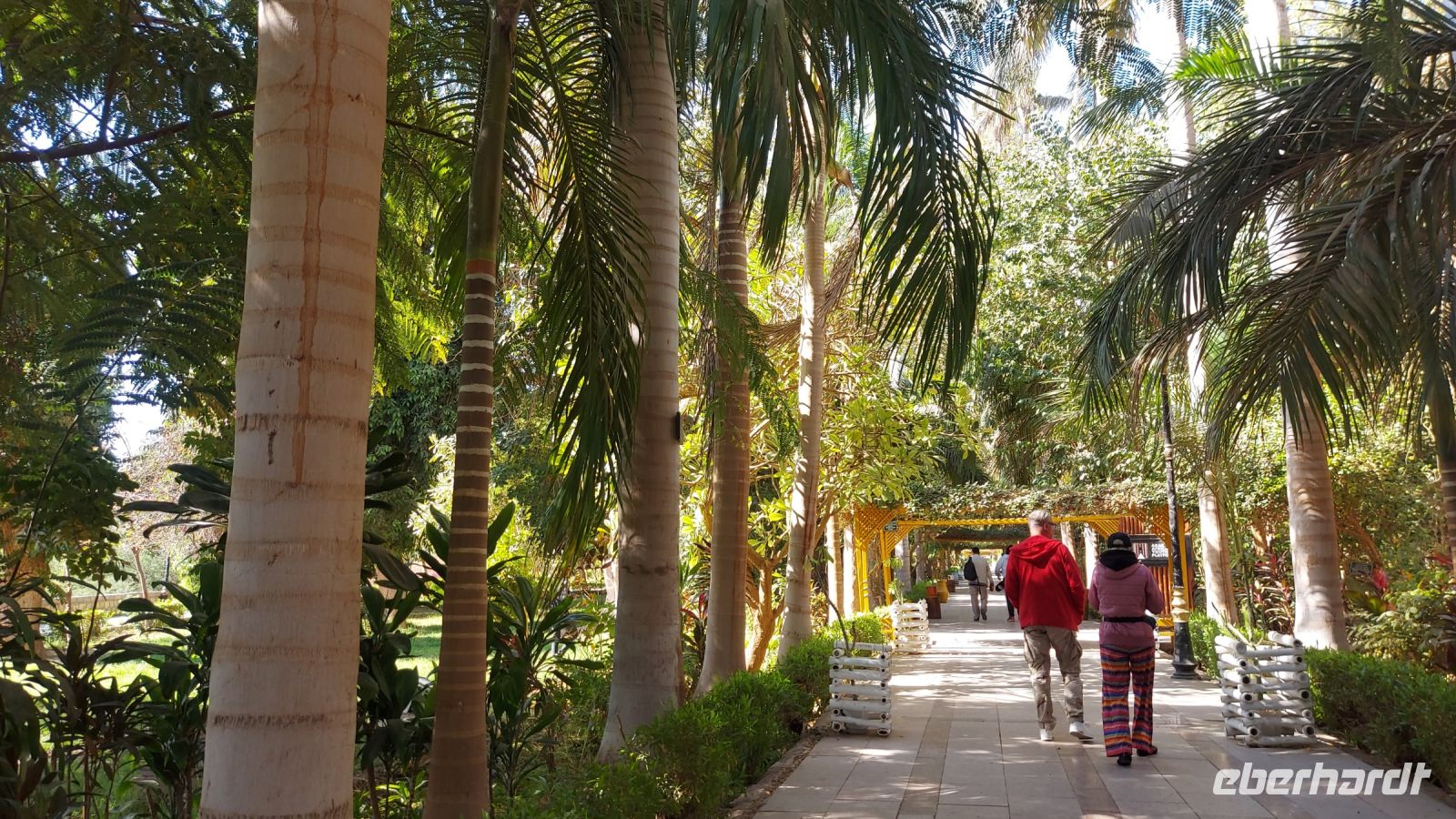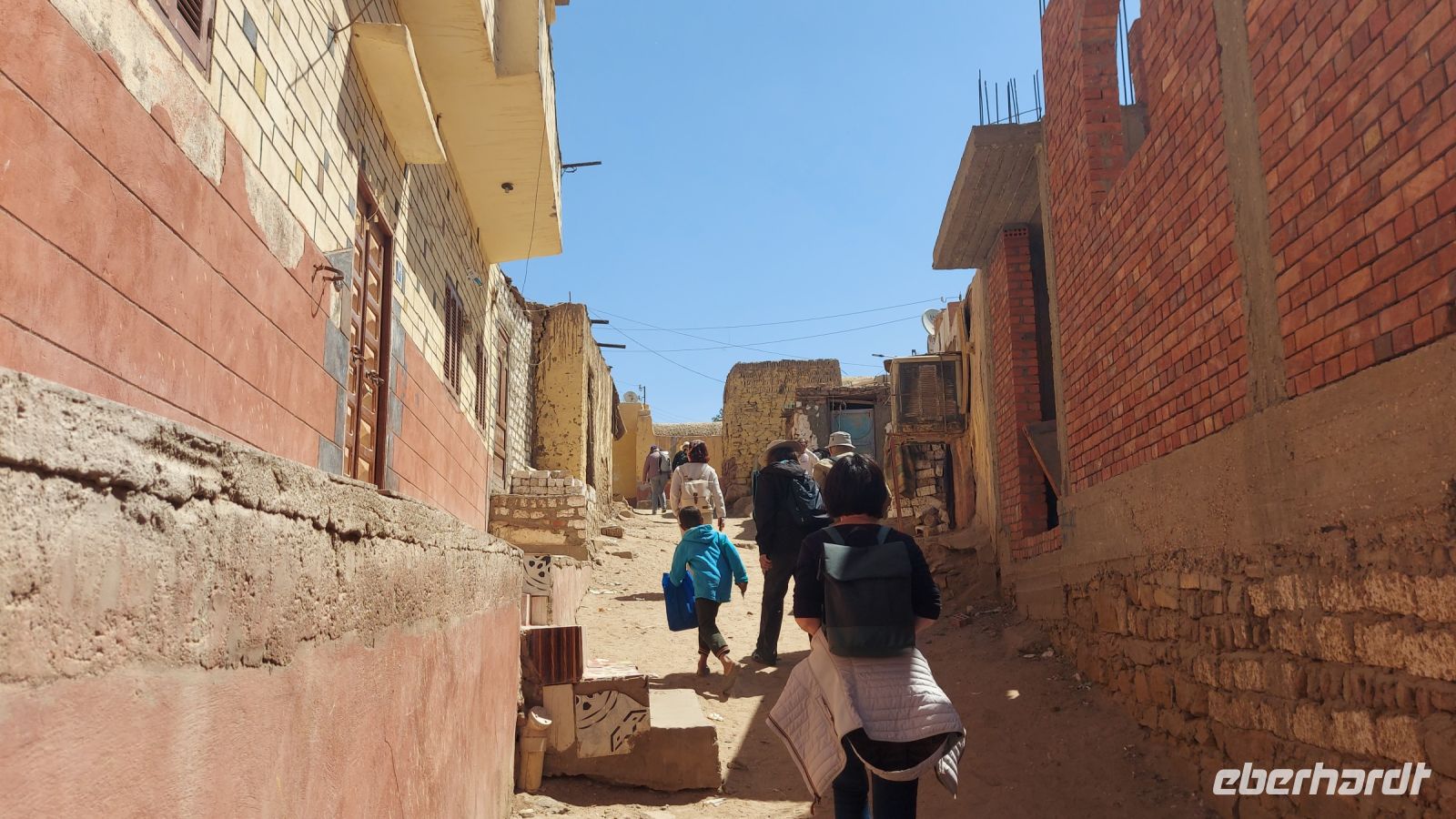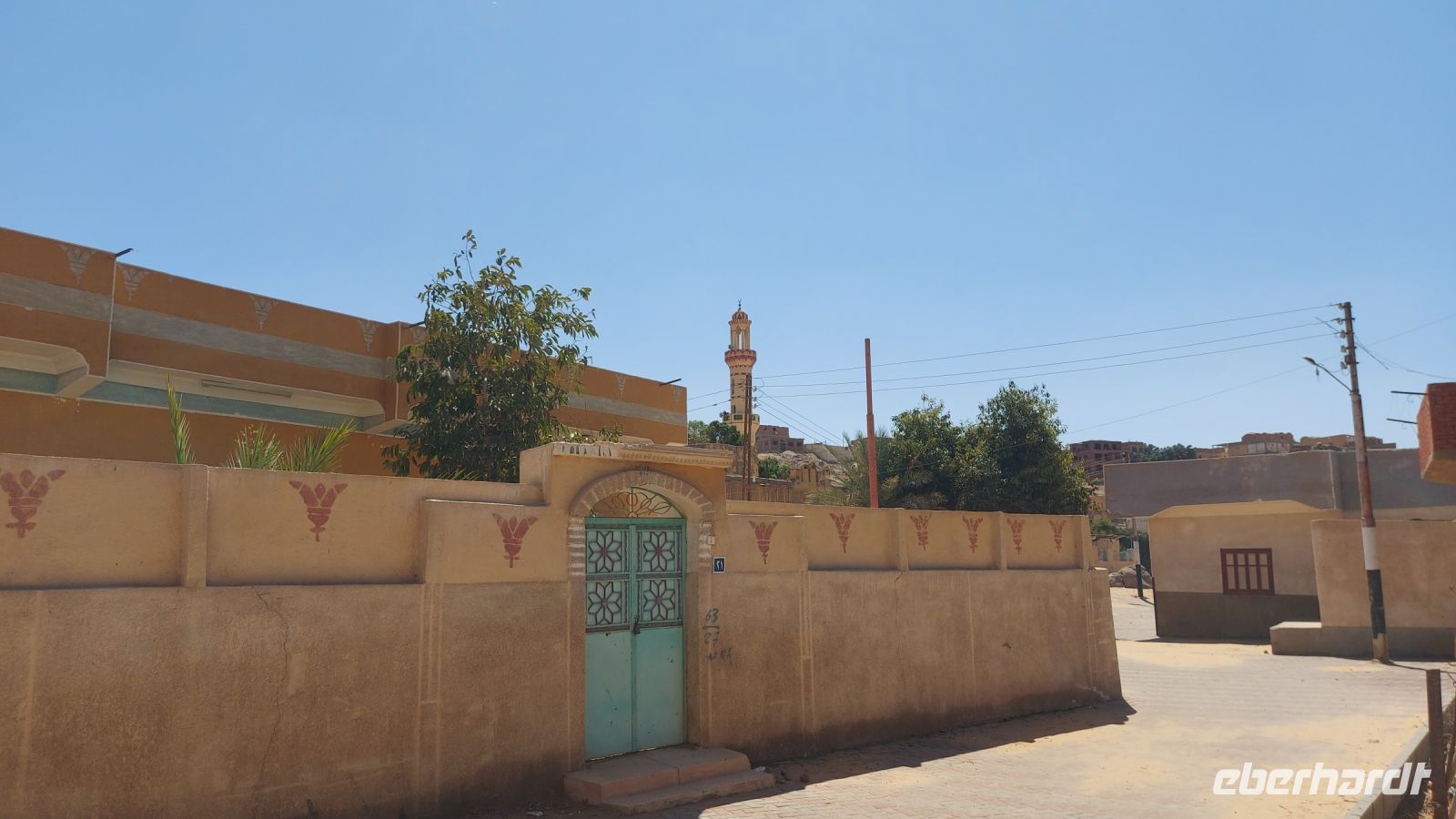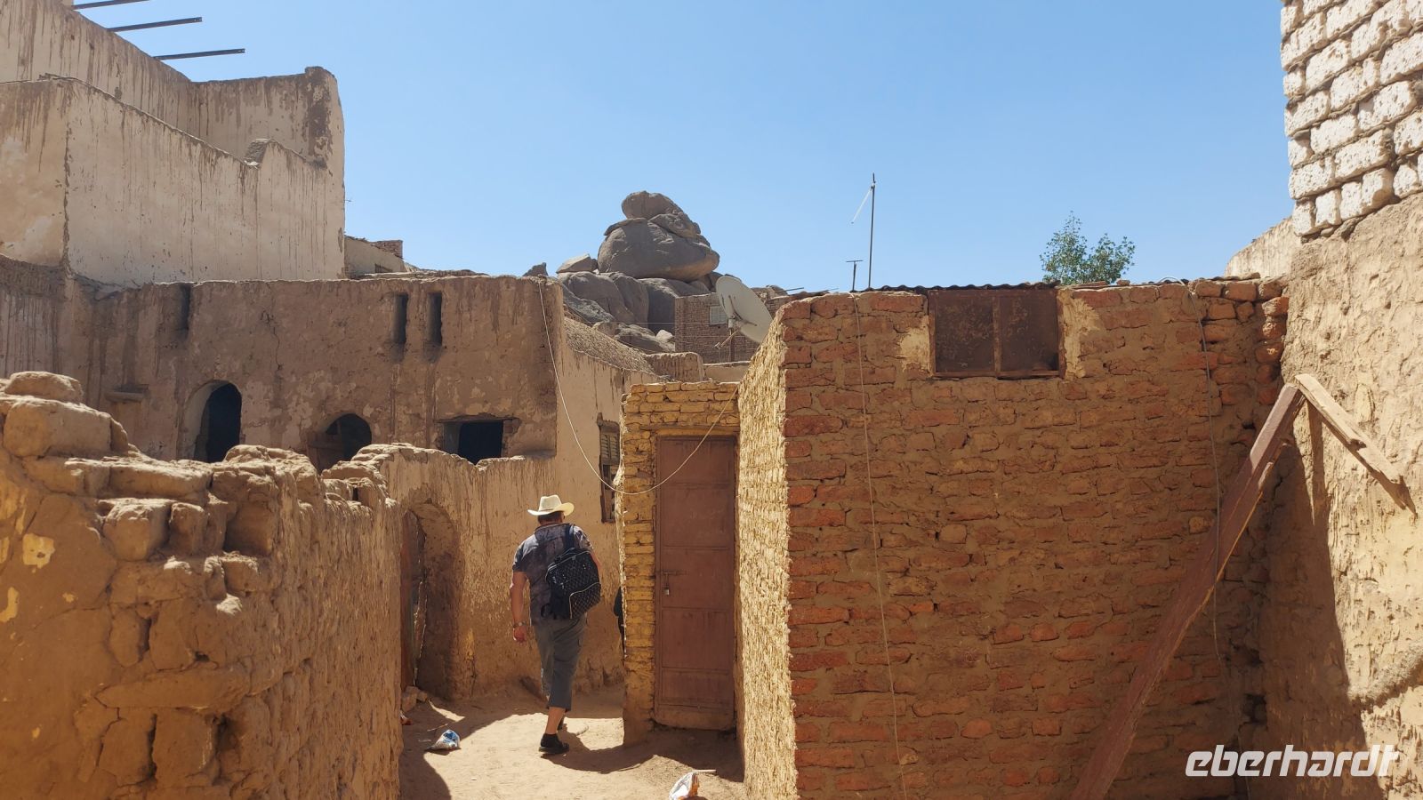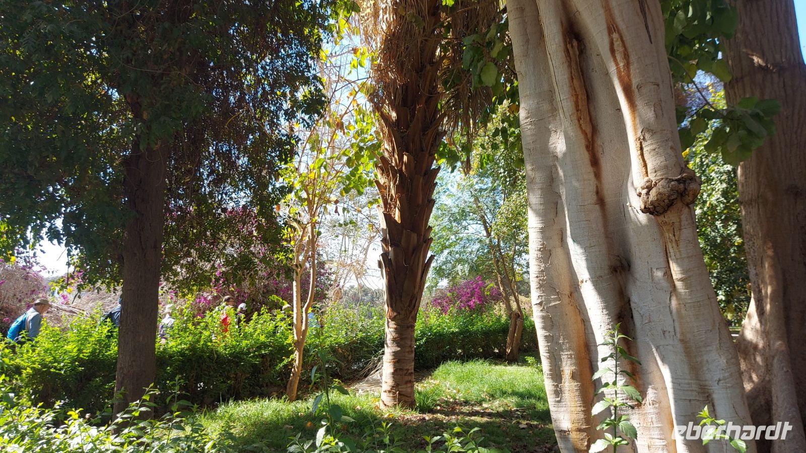 Das Wetter ist heute herrlich und der Himmel strahlend blau. Wir starten an der Promenade von Assuan mit einer Felukke, ein kleines Motorboot, das nur für unsere Gruppe reserviert ist. Der Ausblick auf das Ufer des Nils ist herrlich. Begrüßt werden wir mit einem Willkommenslied der Boots-Belegschaft. Unser erster Stopp gilt dem Botanischen Garten auf der Lord-Kitchener-Insel. Der Engländer Lord Kitchener hat den Botanischen Garten einst mit exotischen Pflanzen und Bäumen aus Asien und Afrika angelegt. Die Schilder auf den Bäumen zeugen von der ursprünglichen Herkunft. Nach dem kurzen Spaziergang über die Insel steigen wir wieder auf unser Motorboot. Die Fahrt führt durch ein Naturschutzgebiet mit Schilf und Basaltfelsen. Wir sitzen unten oder oben auf dem Sonnendach und genießen die herrliche Aussicht, bis wir in einem nubischen Dorf angelangt sind. Wir sind die einzigen Besucher dort und machen einen Spaziergang durch die Gassen aus Sand bis zur Moschee des Dorfes. Natürlich sind einige Einwohner - und vor allem Kinder - interessiert an uns und kommen zum Hauptplatz vor der Moschee, wo sie ihr Handwerk anbieten. Dann steigen wir wieder auf unser Boot. Wir genießen die Rückfahrt in der Sonne, mit leichtem Wind. Auf der Fahrt kommen wir an dem Hotel vorbei, in dem Agatha Christie "Tod auf dem Nil" auf dem Balkon geschrieben. Das Mittagessen nehmen wir wieder an Bord unseres Nil-Kreuzfahrtschiffes ein, das am frühen Nachmittag Richtung Luxor ablegt.
