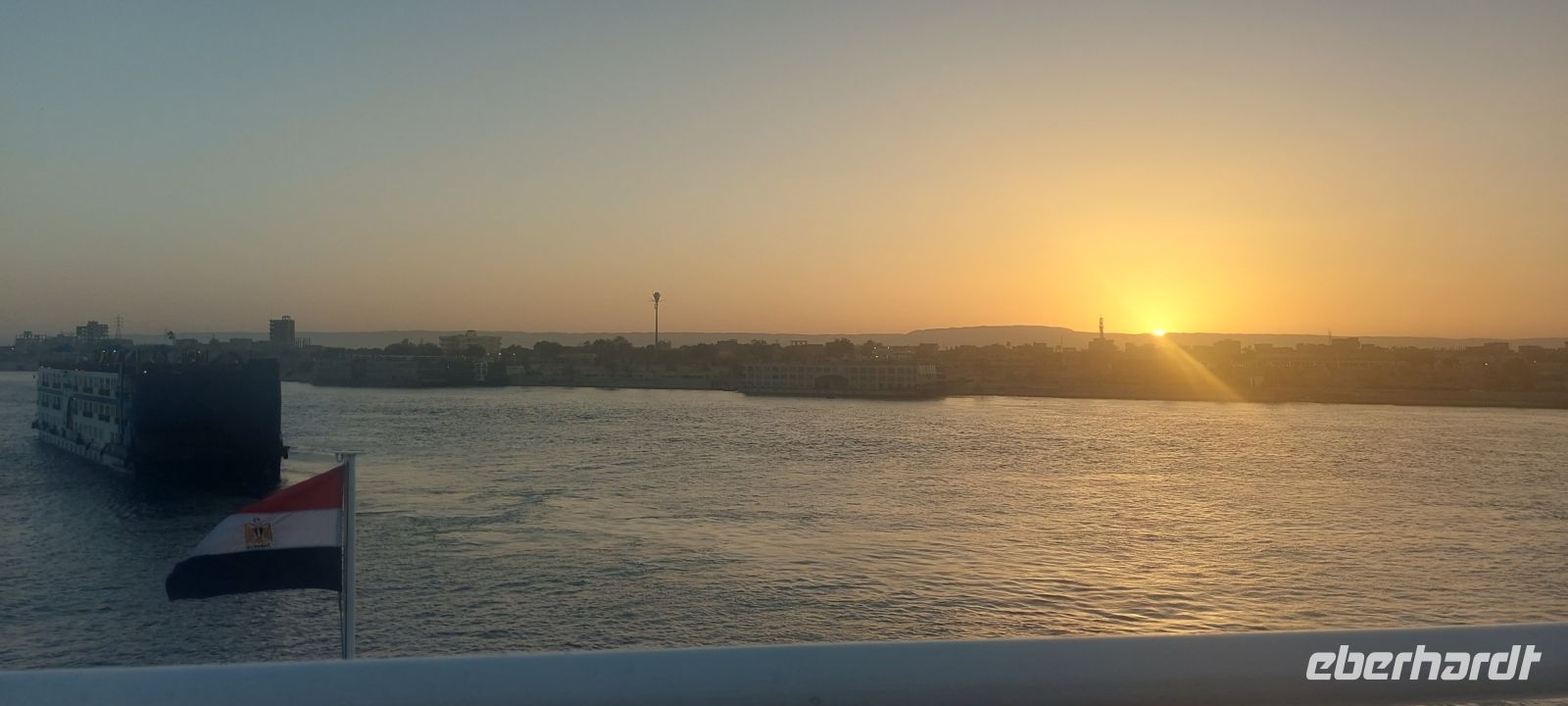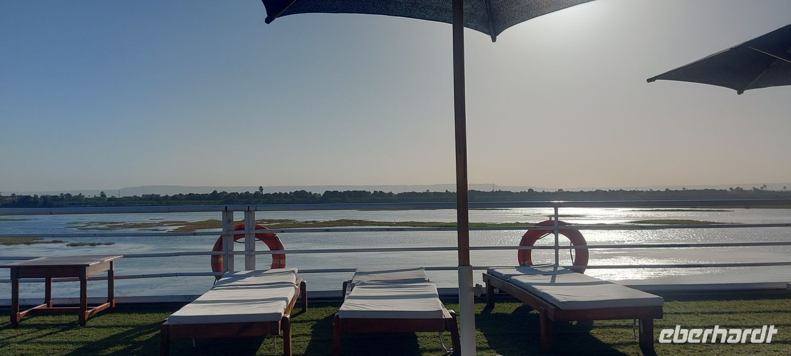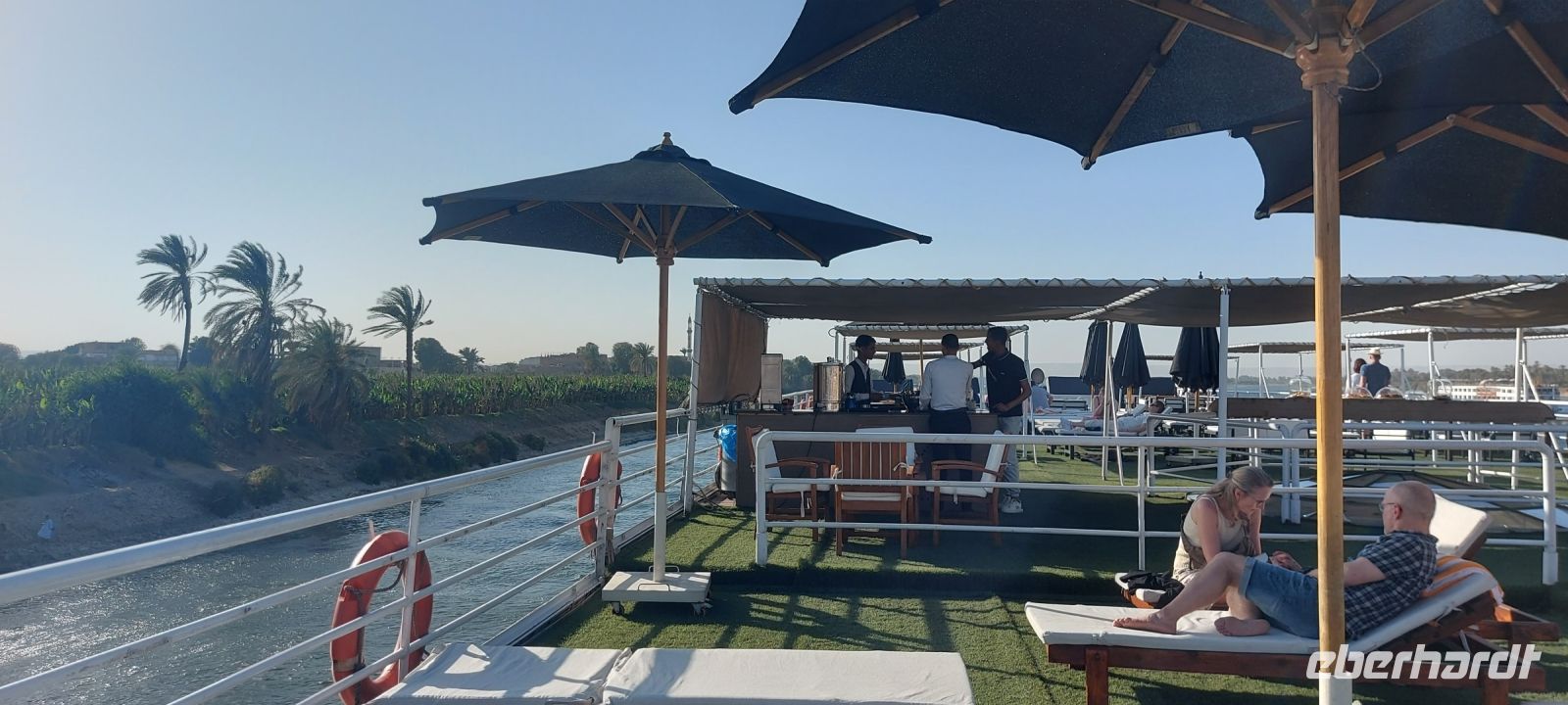 Nach dem Frühstück im Restaurant der MS Nile Style treffen wir uns mit unserem örtlichen Reiseleiter Essam in der Lounge-Bar. Heute wird er uns einen Vortrag über Land, Leute und die Stellung der Frau im Islam im modernen Ägypten halten und uns auch einige Traditionen erklären. Wir hören gespannt zu und können anschließend noch Fragen stellen. Wir erfahren, dass Moslems in Ägypten nicht mit Moslems in den umliegenden Ländern wie beispielsweise Syrien oder Saudi-Arabien zu vergleichen sind. Ägypter sind Kopten (Christen) oder Moslems. Die ägyptischen Moslems leben ihren Glauben nicht unter Zwang, sondern wie der Islam es im Koran empfiehlt. Kopftücher sind für Frauen keine staatliche Pflicht, außer in den heiligen Räumen der Moscheen. Daher ist auch der Ramadan eine Freude für sie, auch wenn die Entbehrung - gerade bei diesen heißen Temperaturen - nicht einfach ist. Der Islam basiert auf fünf Säulen, die Essam uns ausgiebig erklärt. So erhalten wir einen aktuellen Überblick über die Gesellschaft in Ägypten, in die wir in den letzten 10 Tagen einen Einblick gewinnen durften. Für den frühen Nachmittag verabreden wir uns, um die Kapitänszentrale unseres Schiffes zu besichtigen. Wir erfahren, wie die Tradition des Schiffsführers innerhalb der Familie vom Vater auf den Sohn vererbt wird, da für den Nil ein spezielles Wissen benötigt wird, das vor allem die einfachen Fischfänger haben. Am Nachmittag genießt der Großteil der Gruppe die herrliche Sonne und den fantastischen Ausblick auf das Nilufer vom Sonnendeck aus. Wir durchqueren gegen Mittag die Schleuse in Esna und fahren dann weiter nach Luxor, wo wir heute übernachten werden.