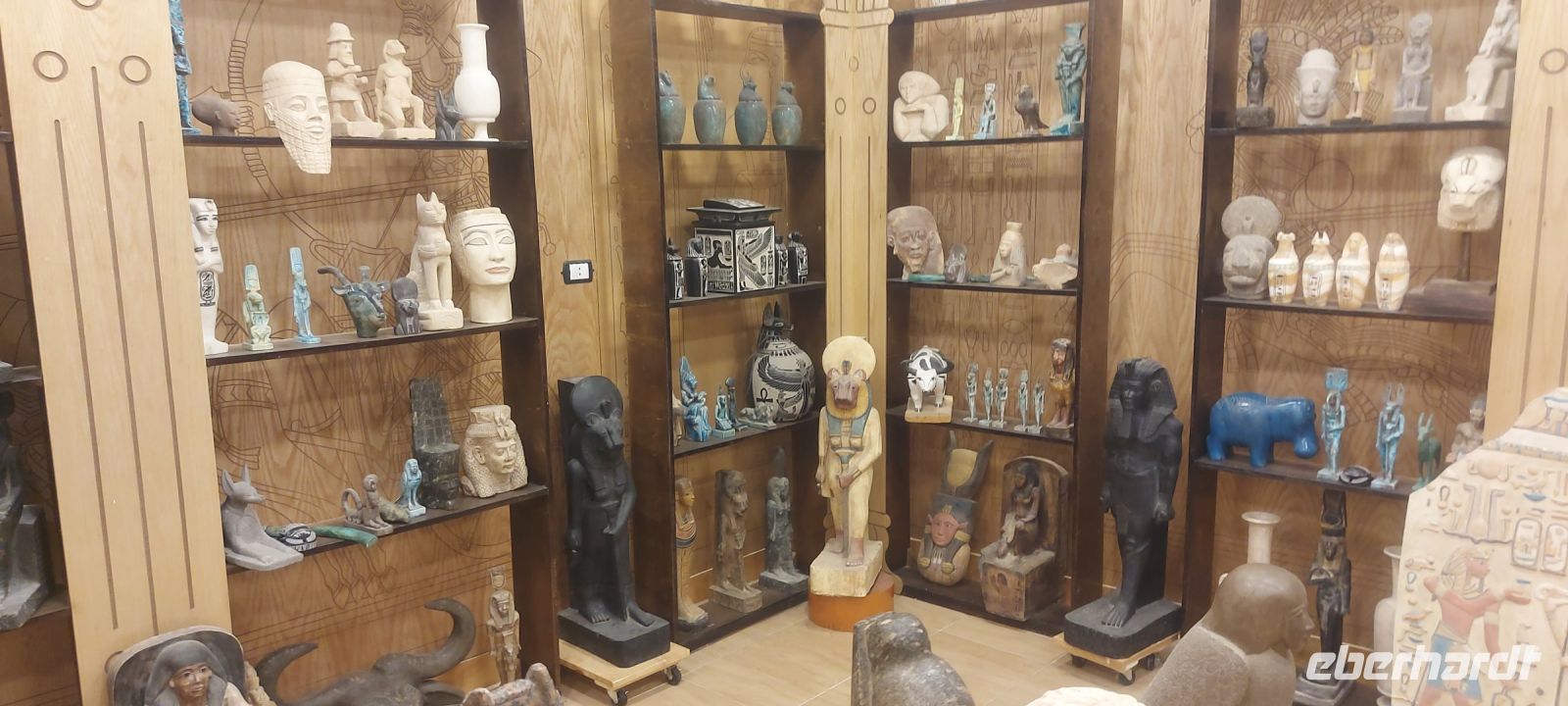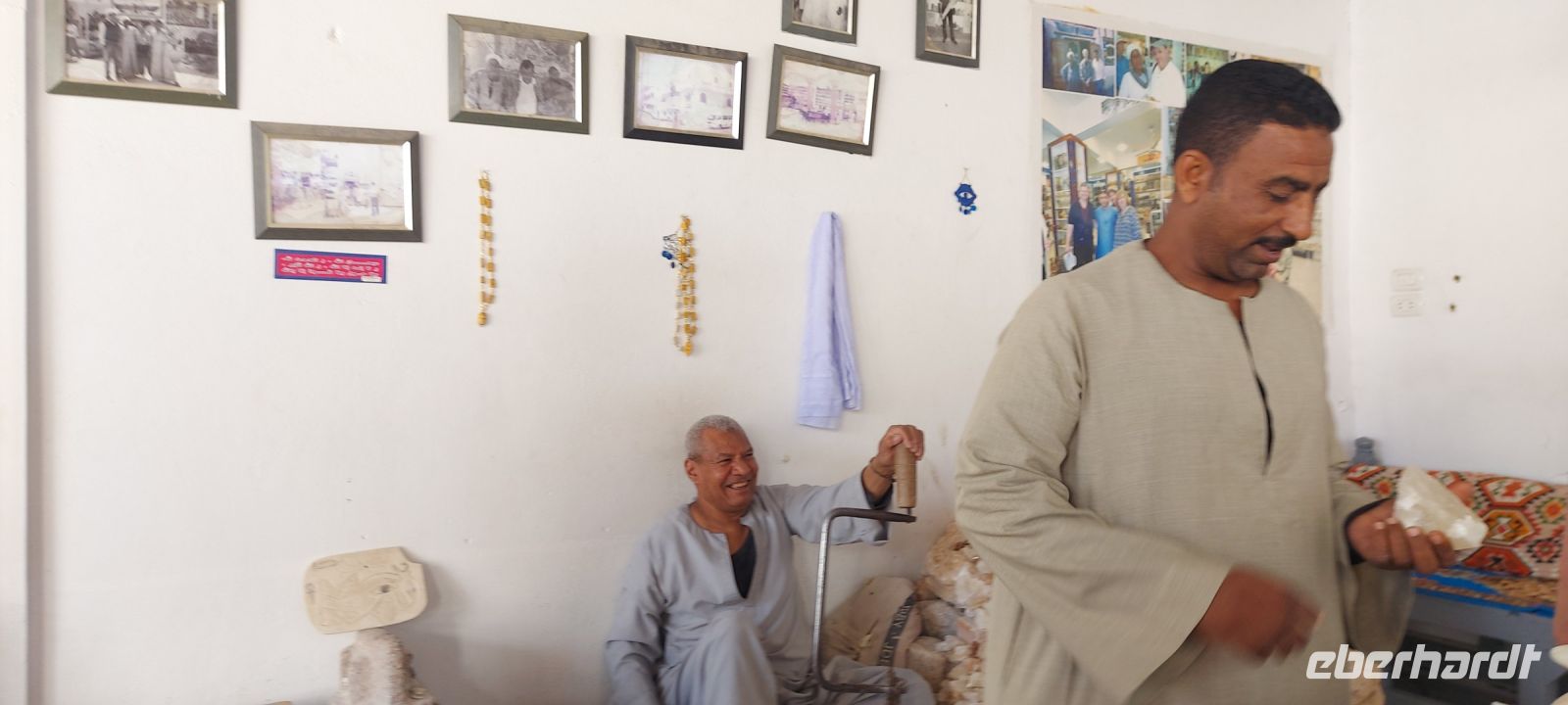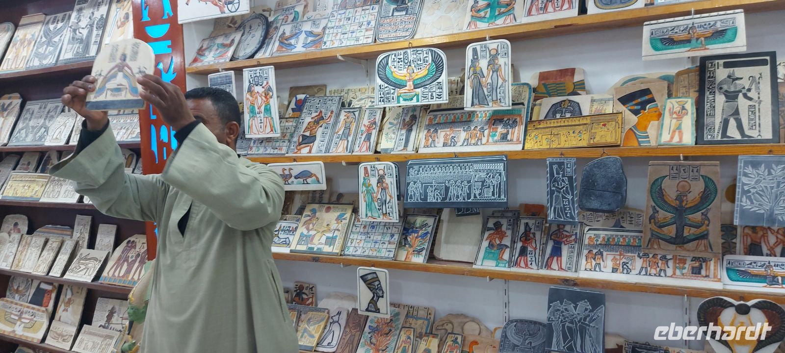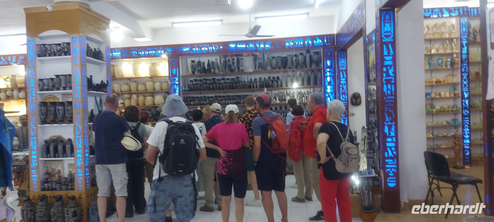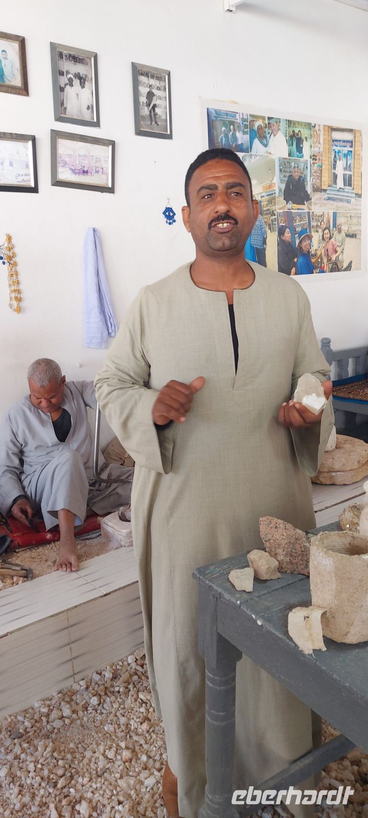 Im Süden Ägyptens bei Luxor werden Vasen, Schalen und Dekorationsfiguren aus Alabaster hergestellt. Wir besuchen eine Fabrik, zwei aus unserer Gruppe dürfen sogar selbst Hand anlegen, bevor wir dann weiter zum Tempel der altägyptischen Pharaonin Hatschepsut auf der anderen Seite der Felsen des Tals der Könige fahren. Ihr Tempel liegt auf mehreren Terrassen und gräbt sich in den Felsen hinein. Eine imposante Treppe führt hinauf. Unser örtlicher Reiseleiter klärt uns über die Herrscherin und ihre Lebensgeschichte auf, bevor wir den Tempel im Alleingang besichtigen. Unsere letzte Etappe der Busfahrt sind die Memnonkolosse, bei denen es sich um zwei 18 Meter hohe sitzende Statuen handelt, die die Wächter des zerstörten Tempels von Amenophis III waren.