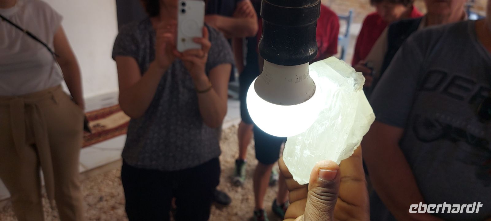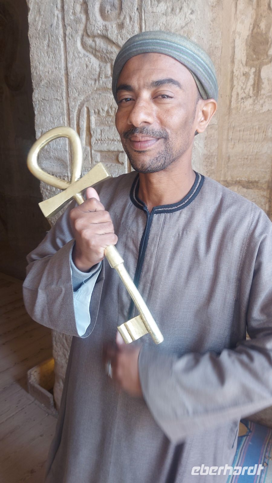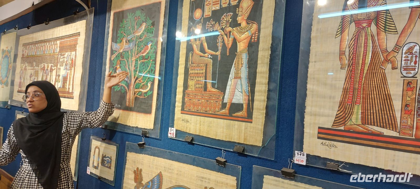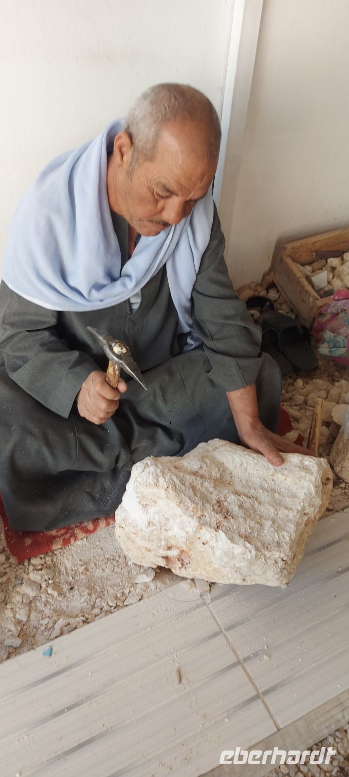 Im Süden Ägyptens bei Luxor werden Vasen, Schalen und Dekorationsfiguren aus Alabaster hergestellt. Wir besuchen eine Fabrik, zwei aus unserer Gruppe dürfen sogar selbst Hand anlegen, bevor wir dann weiter zum Tempel der altägyptischen Pharaonin Hatschepsut auf der anderen Seite der Felsen des Tals der Könige fahren. Ihr Tempel liegt auf mehreren Terrassen und gräbt sich in den Felsen hinein. Eine imposante Treppe führt hinauf. Unser örtlicher Reiseleiter klärt uns über die Herrscherin und ihre Lebensgeschichte auf, bevor wir den Tempel im Alleingang besichtigen. Unsere letzte Etappe der Busfahrt sind die Memnonkolosse, bei denen es sich um zwei 18 Meter hohe sitzende Statuen handelt, die die Wächter des zerstörten Tempels von Amenophis III waren.