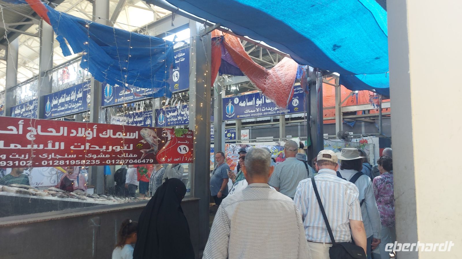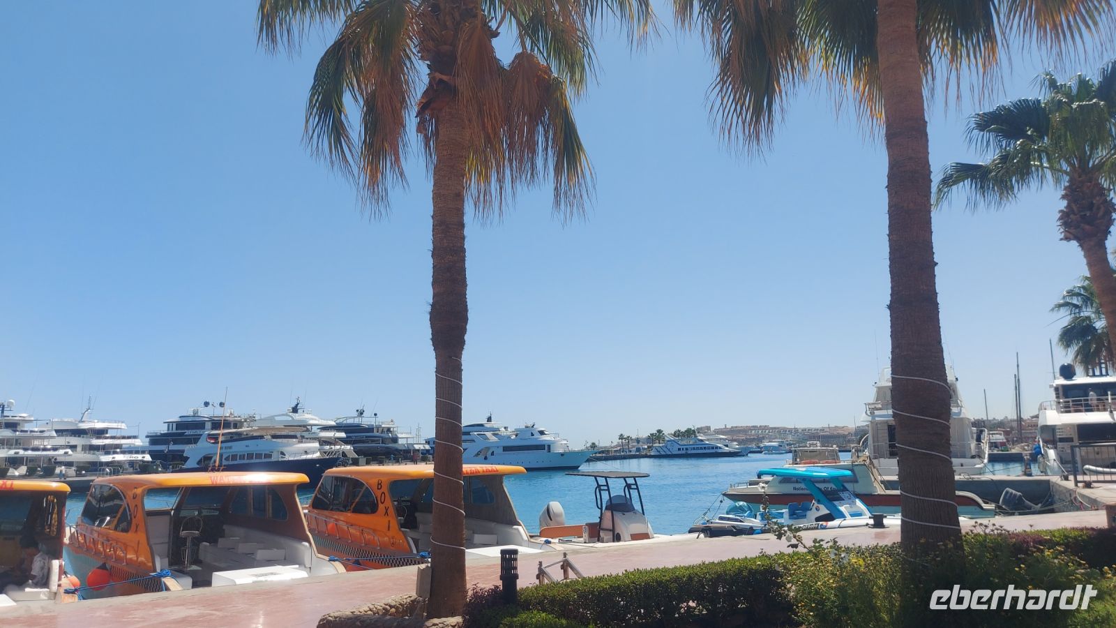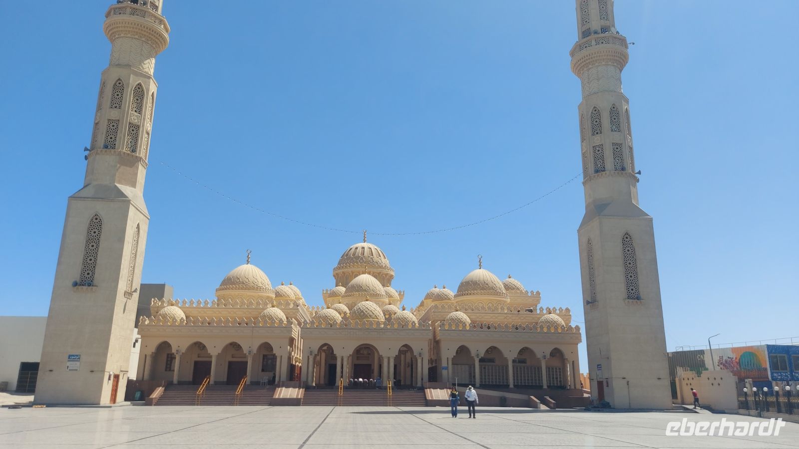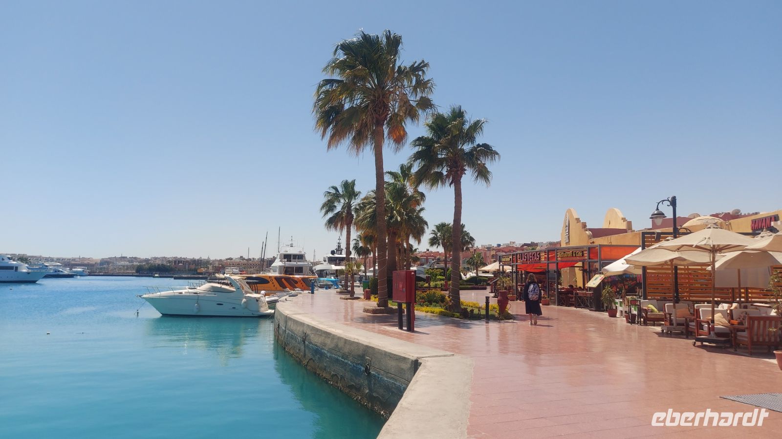 Nach dem Frühstück ist der Großteil der Gruppe daran interessiert, die Stadt Hurghada zu besichtigen, wie Essam angeboten hat. Essam erzählt, wie die Stadt sich in den 1980er Jahren zum Touristenort entwickelt hat. Rund 40 Kilometer Strand ziehen jedes Jahr viele deutsche Gäste an. In Hurghada besichtigen wir Fisch- und Gemüsemärkte, eine koptische Kirche, die Marina (Hafen) und die große Moschee, aus der gerade der Imam zum Mittagsgebet ruft. Das Mittagessen nehmen wir im Hotel ein. Der Nachmittag steht allen Gästen frei zur Verfügung. Wir sehen uns am Strand oder am Pool und sortieren im Kopf die vielen Erlebnisse auf dieser Reise. Beim Abendessen wird Live Cooking geboten. Neben den ägyptischen Speisen werden internationale Gerichte angeboten, eine umwerfende Auswahl. Wer möchte, sitzt am Abend noch zusammen an der Pool-Bar, die jeden Abend ein besonderes Show-Programm auf der Bühne bietet.