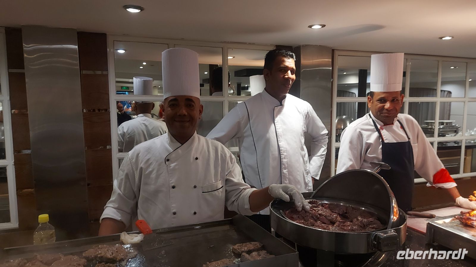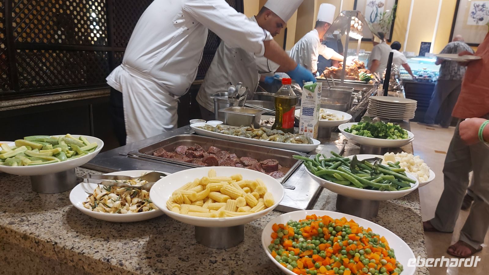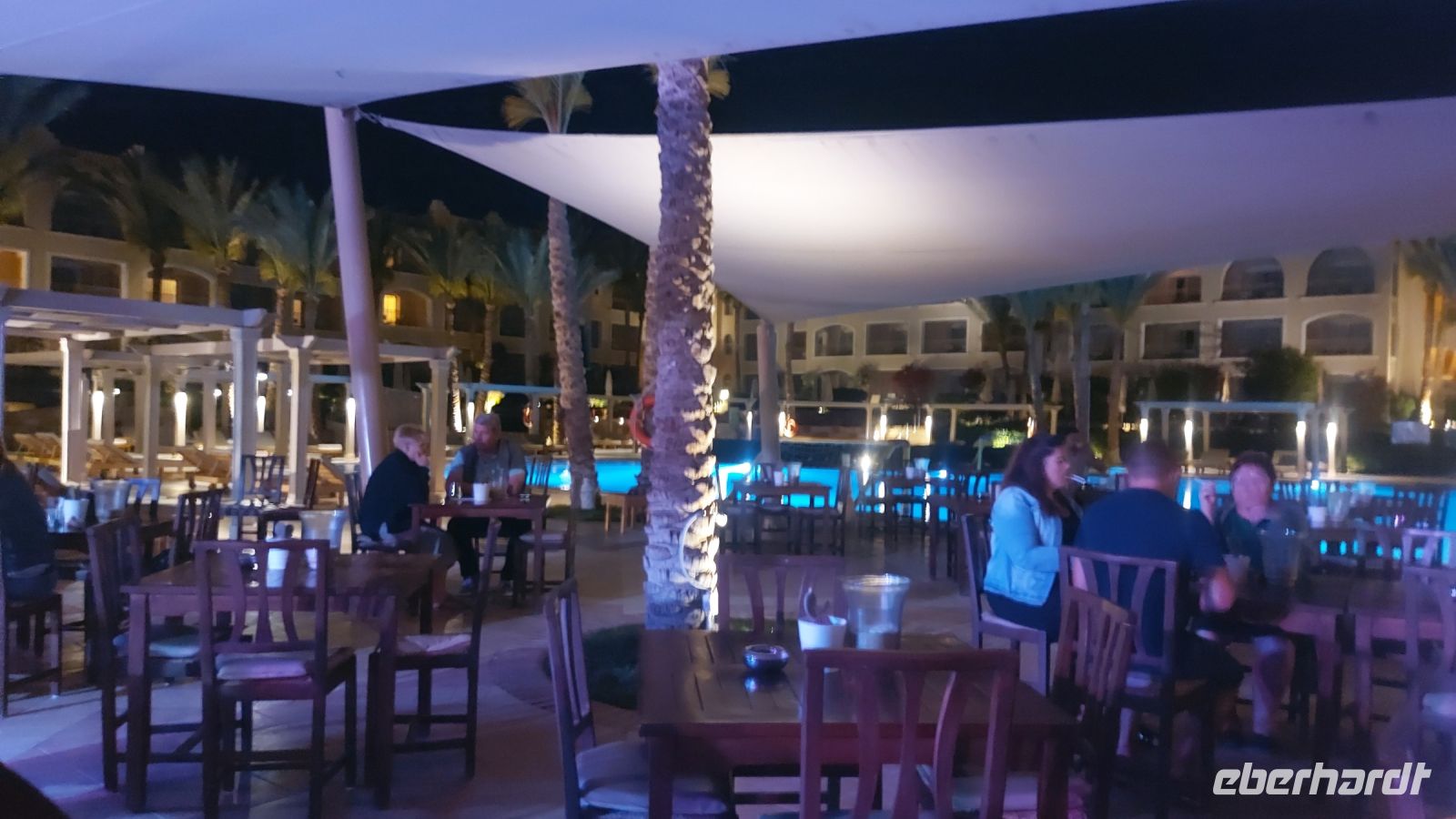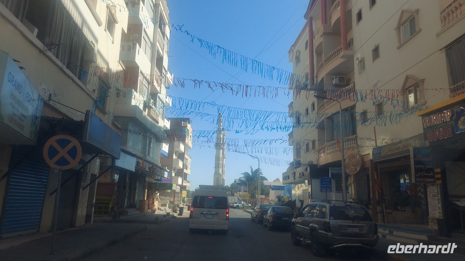 Nach dem Frühstück ist der Großteil der Gruppe daran interessiert, die Stadt Hurghada zu besichtigen, wie Essam angeboten hat. Essam erzählt, wie die Stadt sich in den 1980er Jahren zum Touristenort entwickelt hat. Rund 40 Kilometer Strand ziehen jedes Jahr viele deutsche Gäste an. In Hurghada besichtigen wir Fisch- und Gemüsemärkte, eine koptische Kirche, die Marina (Hafen) und die große Moschee, aus der gerade der Imam zum Mittagsgebet ruft. Das Mittagessen nehmen wir im Hotel ein. Der Nachmittag steht allen Gästen frei zur Verfügung. Wir sehen uns am Strand oder am Pool und sortieren im Kopf die vielen Erlebnisse auf dieser Reise. Beim Abendessen wird Live Cooking geboten. Neben den ägyptischen Speisen werden internationale Gerichte angeboten, eine umwerfende Auswahl. Wer möchte, sitzt am Abend noch zusammen an der Pool-Bar, die jeden Abend ein besonderes Show-Programm auf der Bühne bietet.