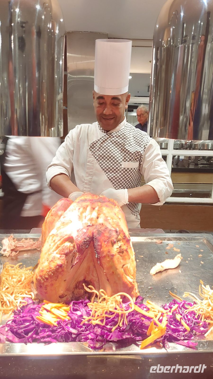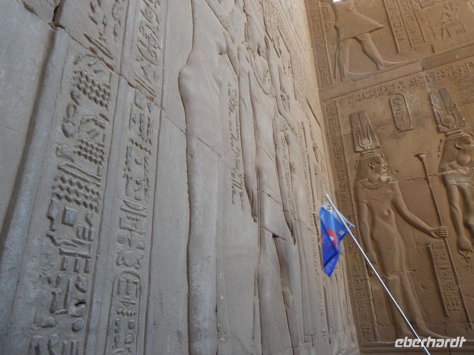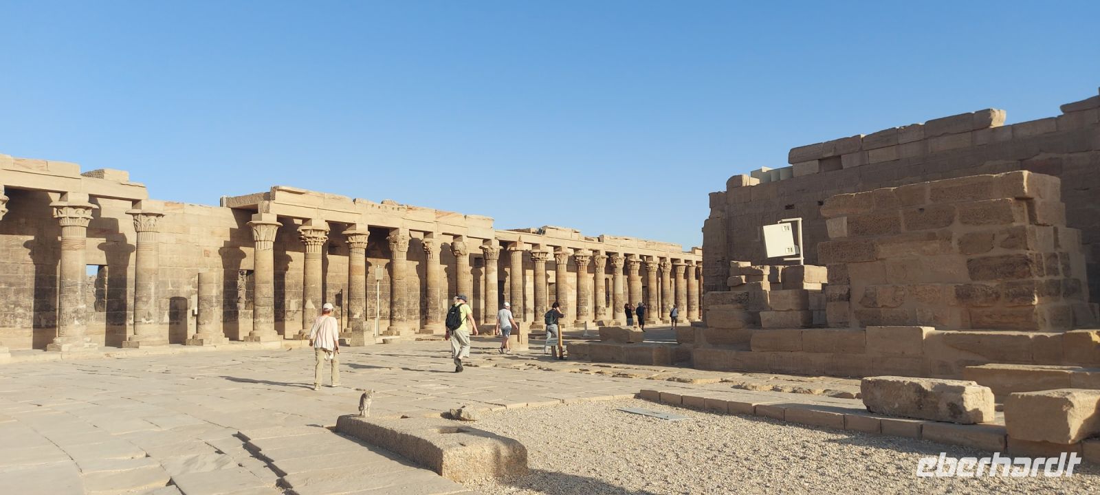 Heute heißt es wieder früh aufstehen, damit wir unter den Ersten sind, die in die Tempelanlage in Edfu gelangen. Vor dem Schiff warten bereits die Kutschen, mit denen wir zum imposanten Tempel gelangen. Mächtig erhebt sich der große Eingangspylon vor unseren Augen. Der ganze Vorhof ist mit großen Reliefs geschmückt. Durch den Säulensaal gelangen wir zum Haus Gottes, der Saal, der als Heiligtum gilt. Auch die Nebenräume sind mit bedeutungsvollen Hieroglyphen, den heiligen Schriftzeichen, geschmückt. Unser Reiseleiter erzählt uns die Geschichte des Tempels, der von den Griechen nach dem Einzug von Alexander dem Großen erbaut wurde. Die Griechen liessen im Auftrag die altägyptischen Tempel abreissen, um sich selbst dort als Herrscher zu erheben. Das Mittagessen nehmen wir auf dem Sonnendeck unseres Kreuzfahrtschiffes ein. Heute gibt es Barbecue mit Live Cooking. Wir genießen die Fahrt und freuen uns auf unser nächstes Ziel: Kom Ombo.