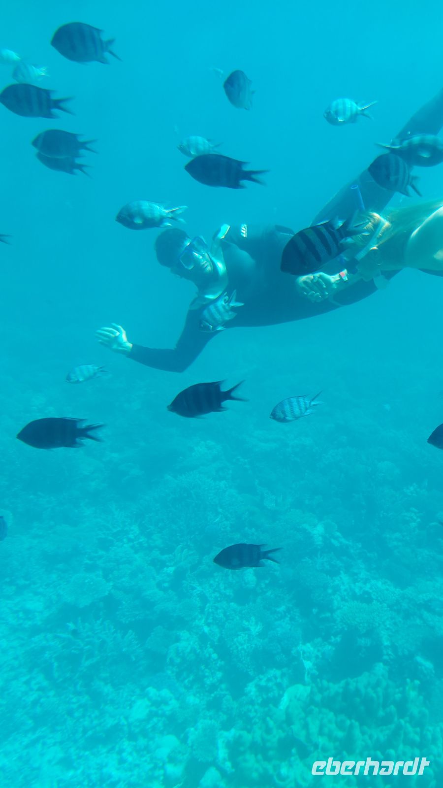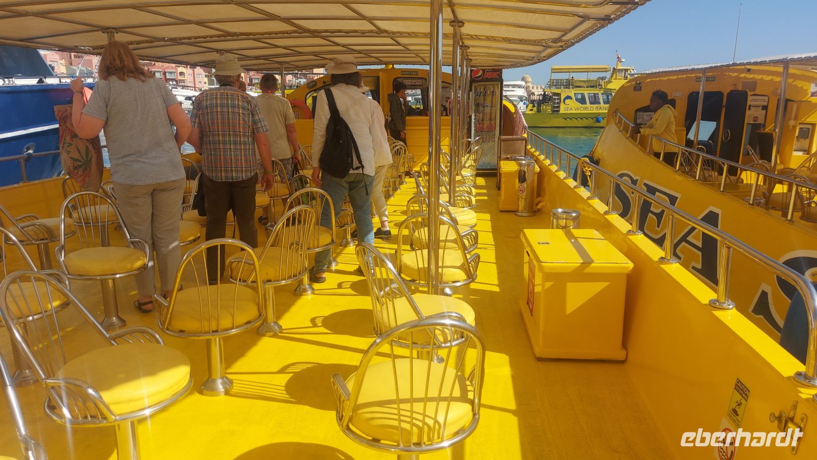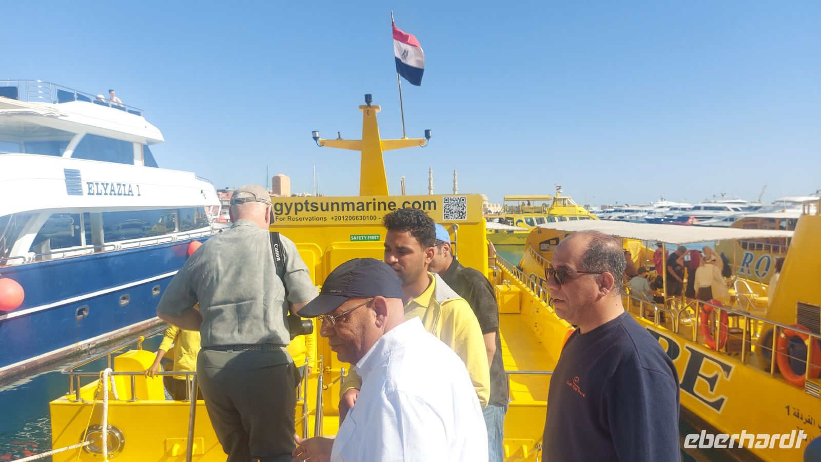 Nach dem Frühstück nehmen einige Gäste Essams Angebot wahr, an einer Bootsfahrt mit Glasfenstern teilzunehmen. Mit dem Bus fahren wir zum Hafen von Hurghada und steigen auf das Boot mit weiteren internationalen Gästen. Vom Bootsdeck aus haben wir einen herrlichen Blick auf die Küste von Hurghada. Nach einiger Zeit gehen wir nach unten und setzen uns vor die Panoramafenster um die Korallenriffs und die bunten Fische zu beobachten. Wer möchte, kann mit der Crew schnorcheln. Das Mittagessen nehmen wir wieder im Hotel ein und nutzen den Nachmittag für eine letzte Entspannung am Roten Meer oder am Pool, bevor es wieder Kofferpacken heißt, denn morgen treten wir die Rückreise an. Den Abend lassen wir in der Lounge Bar ausklingen, denn wir müssen uns langsam von unserem tollen Reiseleiter verabschieden.