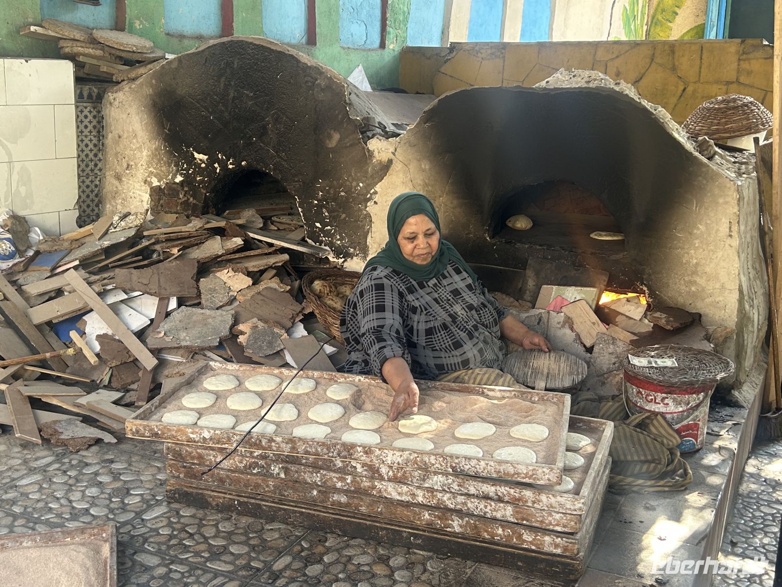 Das Mittagessen findet heute in einer kleinen Oase statt, wo wir lautstark von fröhlichen Musikern empfangen werden. Danach schauen wir einer Bäuerin beim Fladenbrot backen zu und bekommen gleich das warme Brot zum probieren. Das Essen kommt frisch auf den Tisch und mundet uns allen.