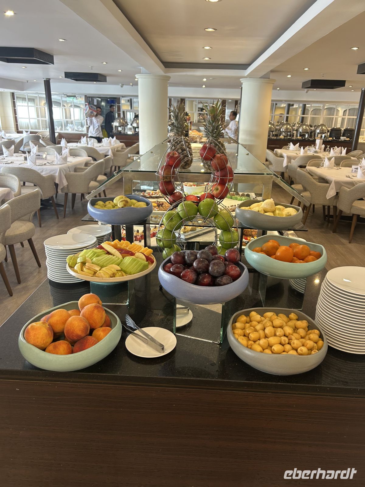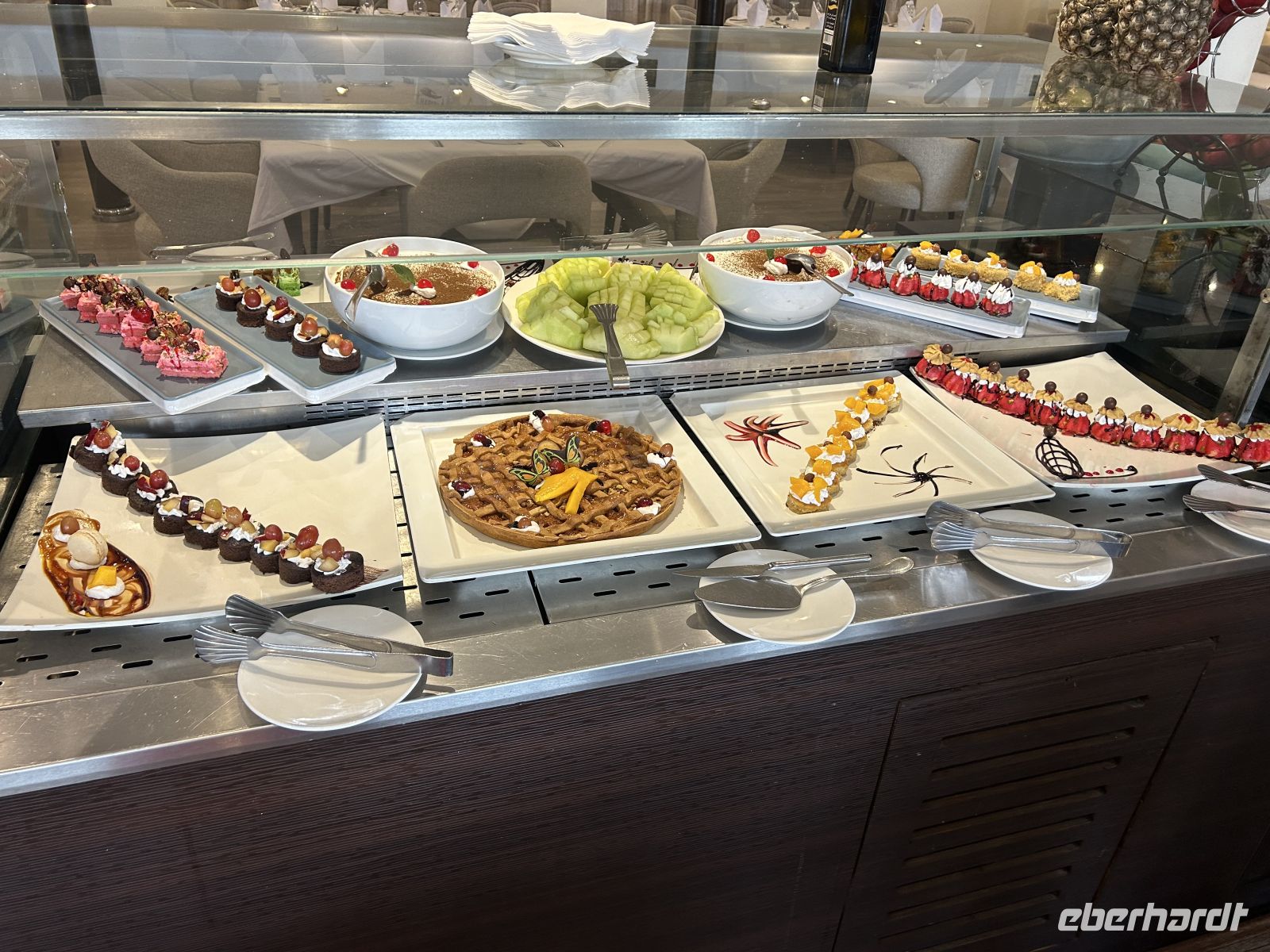 Mittags checken wir ein und bekommen auch gleich ein gutes Mittagessen. Alle Speisen werden als Buffet angeboten, das eine riesige Auswahl bietet. Wir haben die Wahl und müssen nur entscheiden, was wir essen wollen. Wir sind begeistert von der Kreativität der Zubereitung.