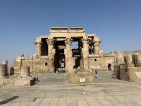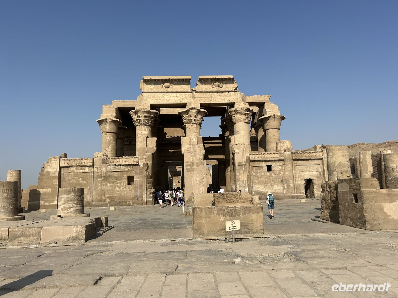 Nach einem stärkenden Mittagessen und etwas Erholung besichtigen wir dann den Tempel von Kom Ombo, wo uns unser Schiff inzwischen hingebracht hat. Gleich zwei tierköpfigen Göttern ist der Doppeltempel geweiht und weil sich die Gottheiten zwar das Gebäude teilen können, nicht aber die Rituale, führen jeweils 2 Türen in die Räumlichkeiten.