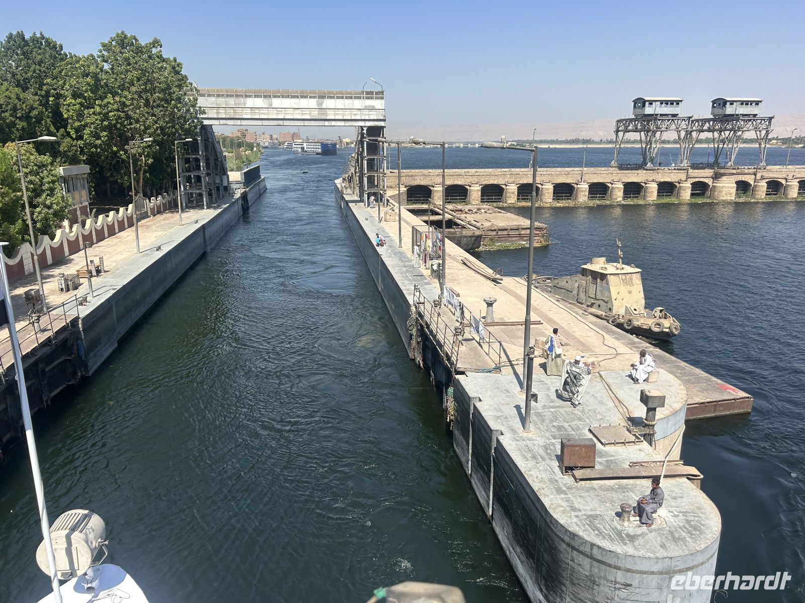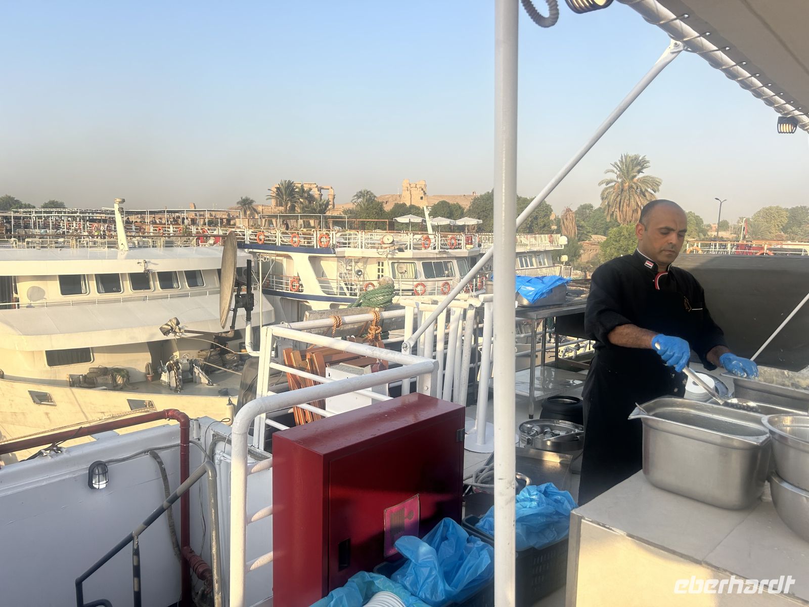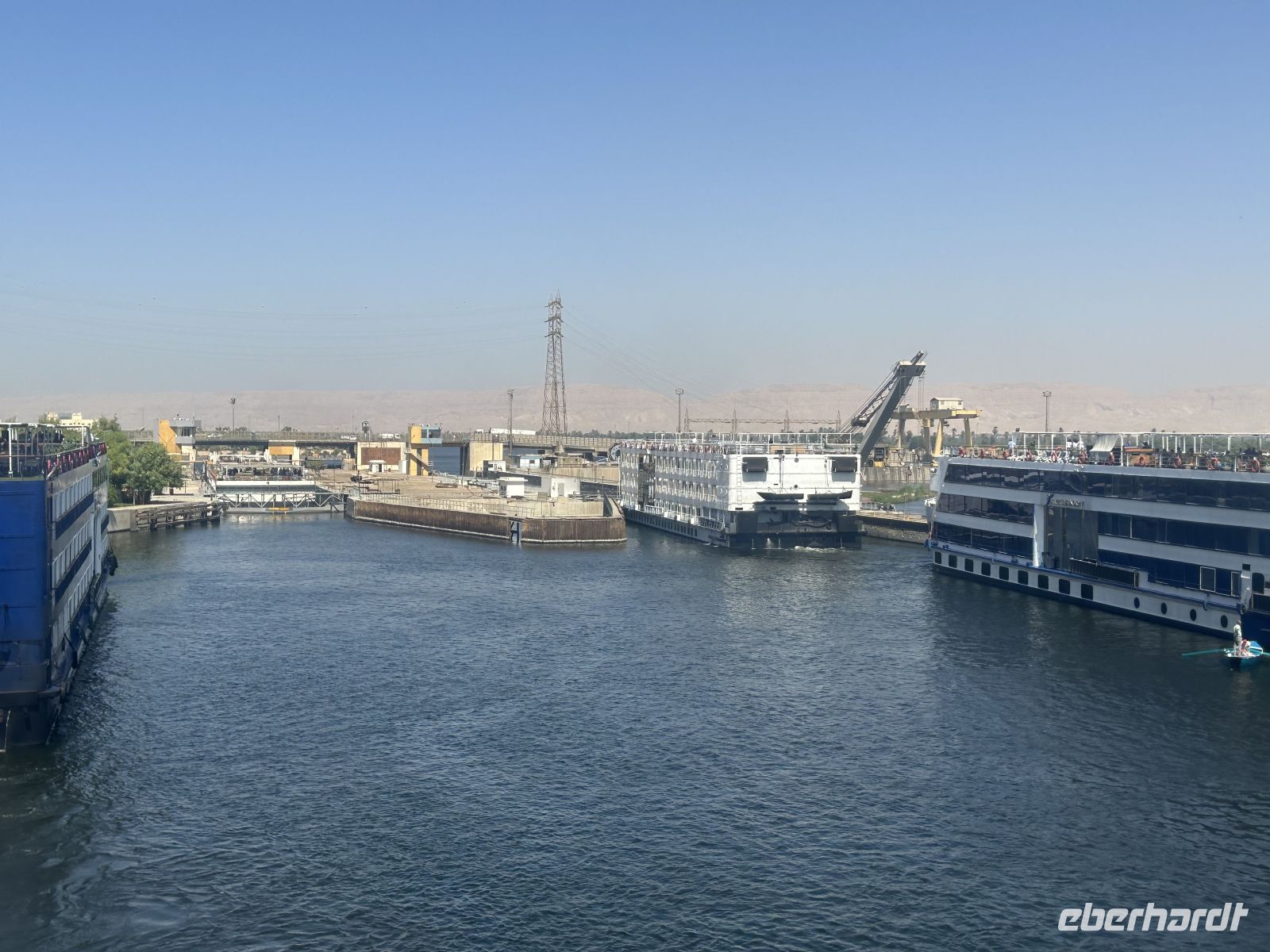 Das Essen ist wieder sehr vielfältig und schmeckt. Die kommende Nacht wird aufregend, weil wir gegen Mitternacht durch die Schleusen von Esna fahren und mit sehr vielen Schiffen eine Schlange bilden. Dann werden alle einzeln von Handarbeit durch die Schleuse geleitet, was sich einige Gäste nicht entgehen lassen.