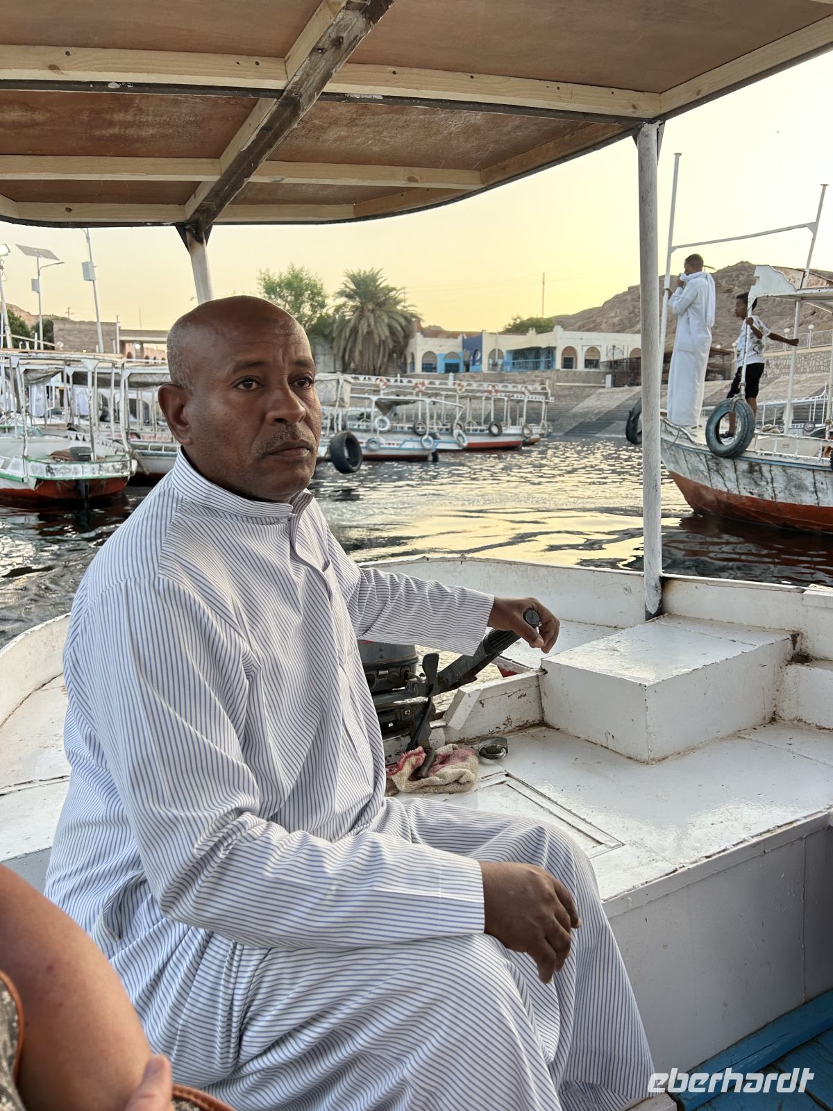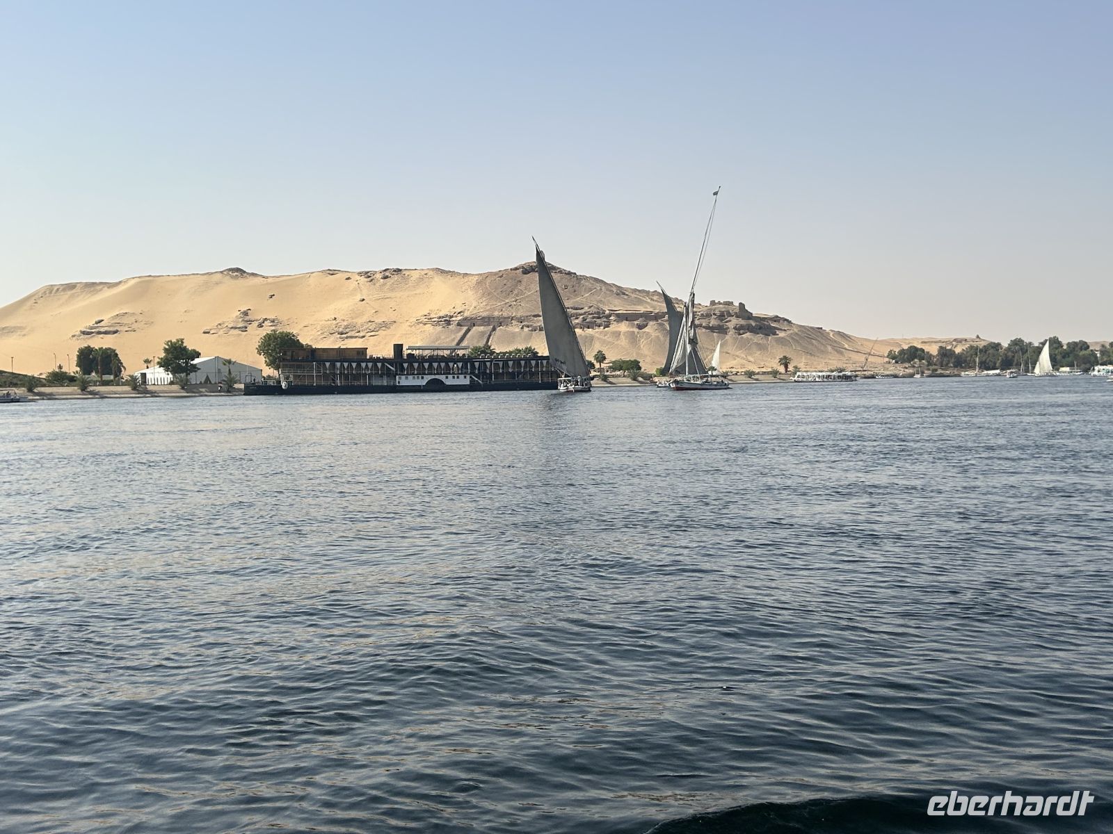 Nach dem Mittagessen kreuzen wir mit einer Felukke den Nil. Der Wind reicht nicht aus, sodass wir ab und zu von einem anderem Boot gezogen werden müssen. Das erfolgt komplikationslos durch Zuruf und dann mit einem Seil.