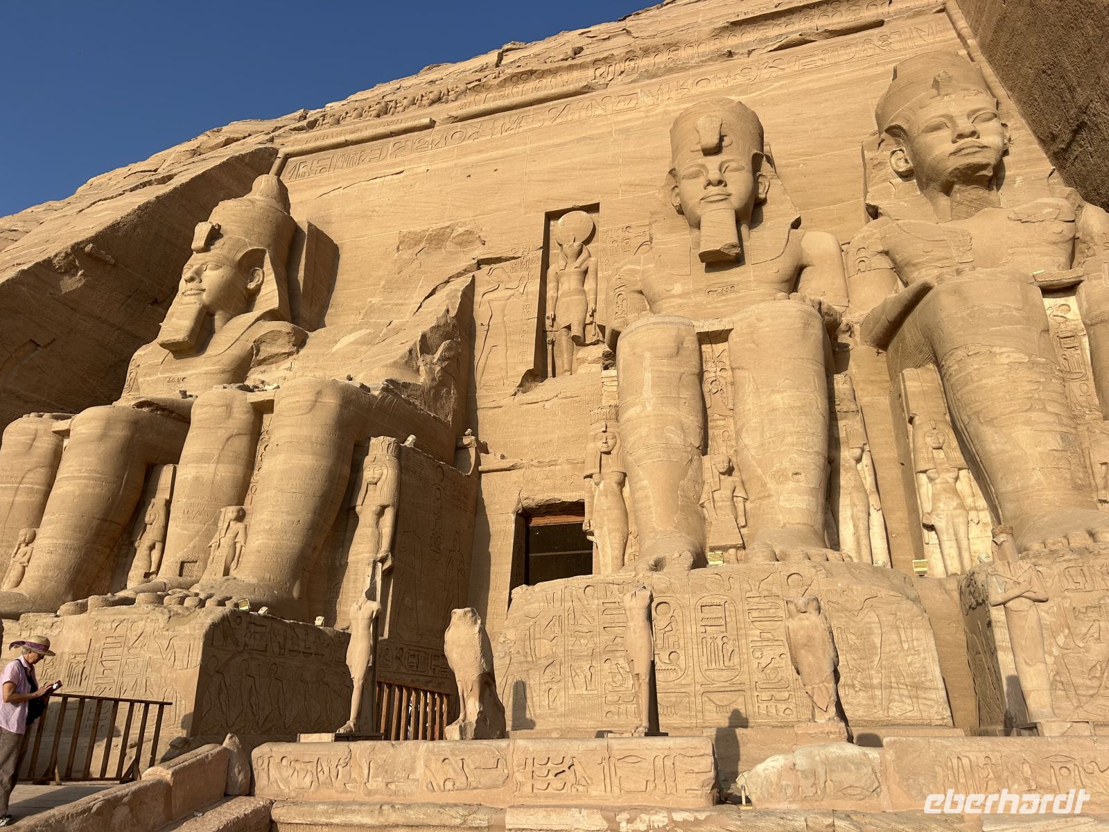 Der große und kleine Tempel von Abu Simbel gehören neben den Pyramiden zu den einzigartigen Glanzleistungen der ägyptischen Architektur. Imposanter kann Personenkult nicht sein. Gleich viermal ließ sich Ramses der ||. als Gott darstellen und zwar 20 m hoch und das im Sitzen!
