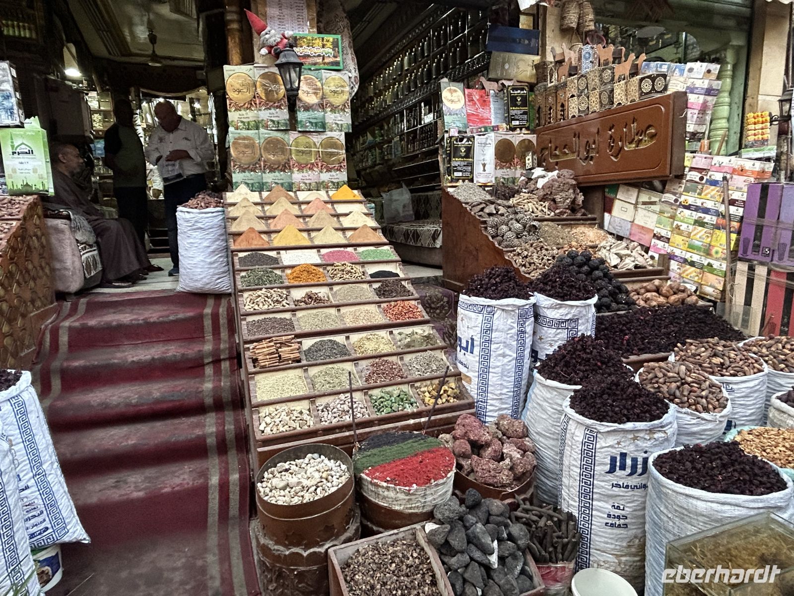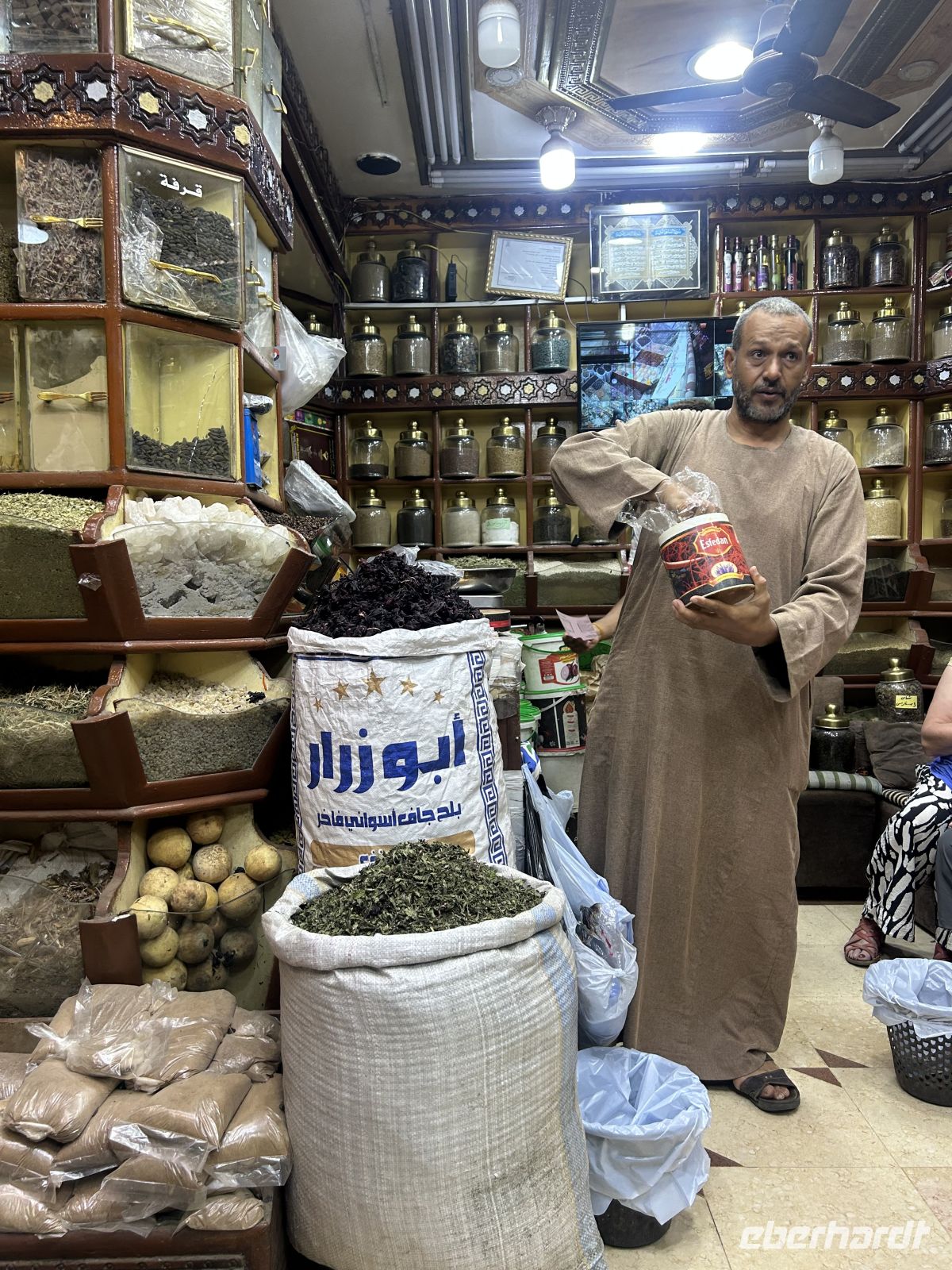 hatten, geht es am späten Nachmittag in die Stadt zu einem Laden, wo wir die Möglichkeit haben, ägyptische Gewürze zu kaufen. Zuerst lässt uns aber der aktive Verkäufer Verschiedenes riechen und probieren, was viele zum Kauf anregt.