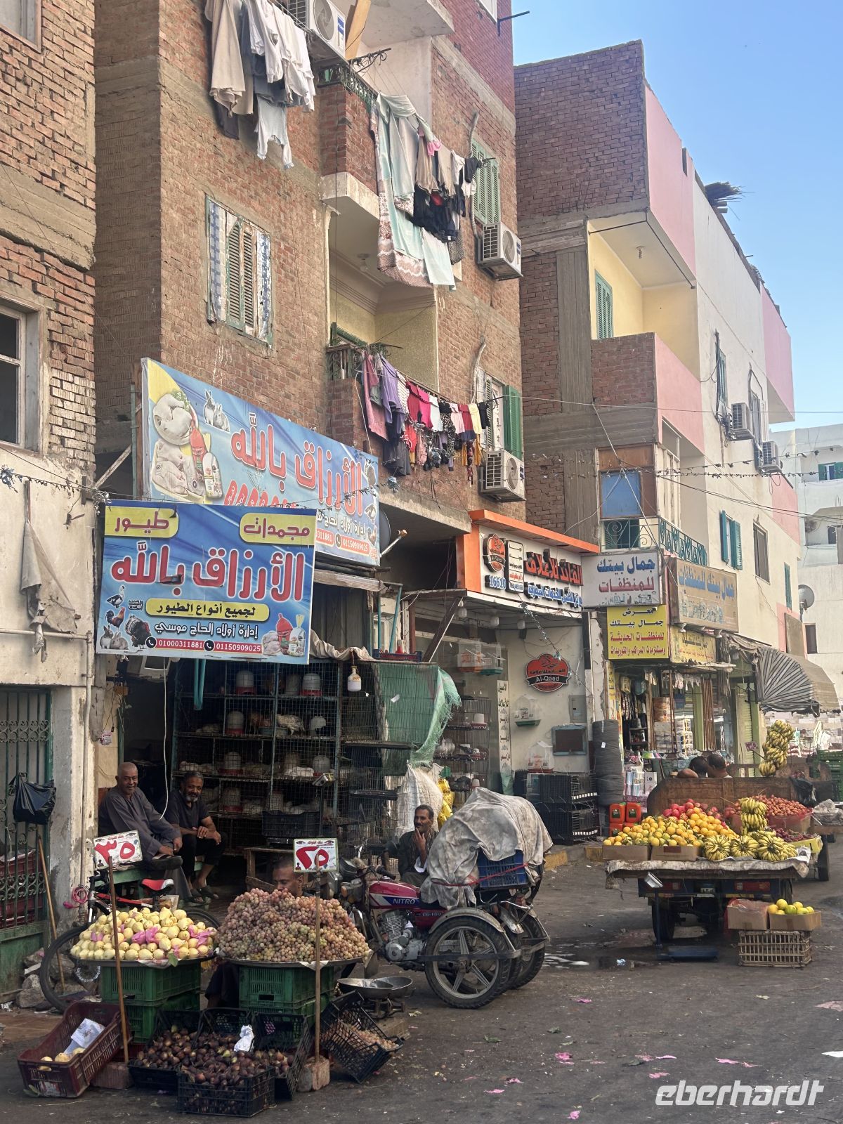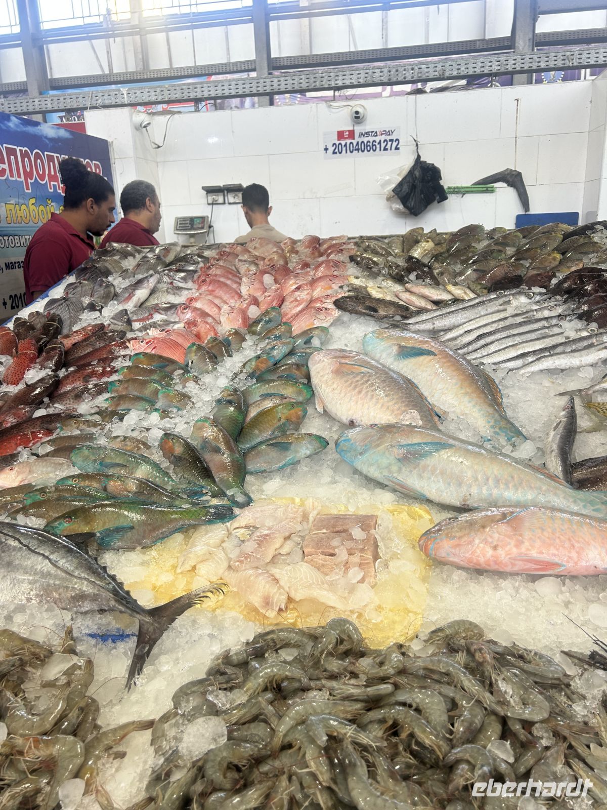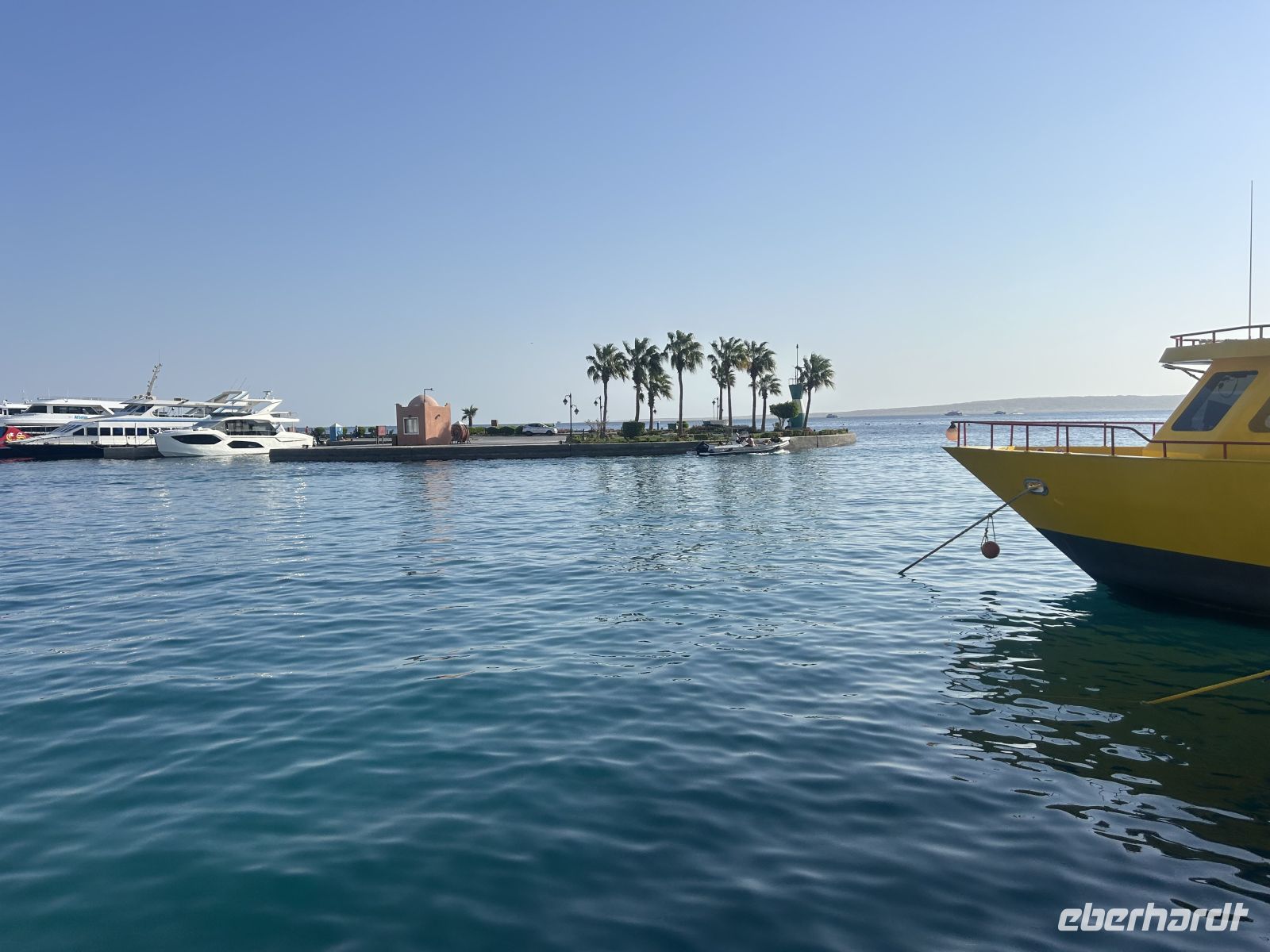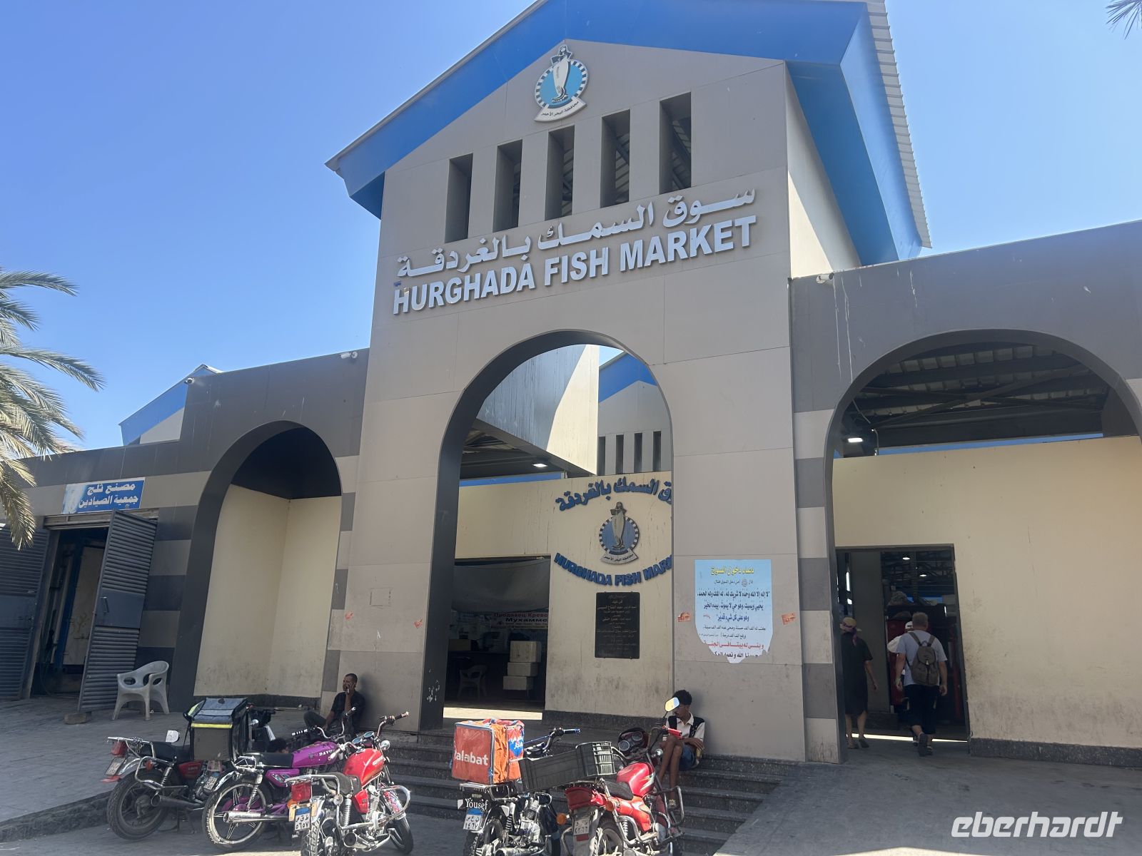 Heute Vormittag haben wir die Gelegenheit, und die Stadt Hurghada anzuschauen, die ca. 35 km von Safaga entfernt liegt. Essam mietet einen Kleinbus und wir unternehmen eine schöne Stadtrundfahrt. Zuerst besichtigen wir die Koptische Kirche, dann verschiedene Märkte für Lebensmittel. In der Altstadt gibt es noch sehr alte Verkaufsstände am Straßenrand, wo frisches Fleisch, Fisch und Hühner verkauft werden. Aber auch modernere Markthallen bieten eine reichhaltige Auswahl an allem an. Wir fahren noch zum Hafen und genießen eine Panorama Aussicht auf die Küste und die vorgelagerten Insel.