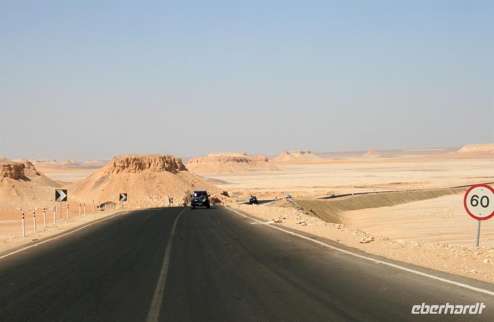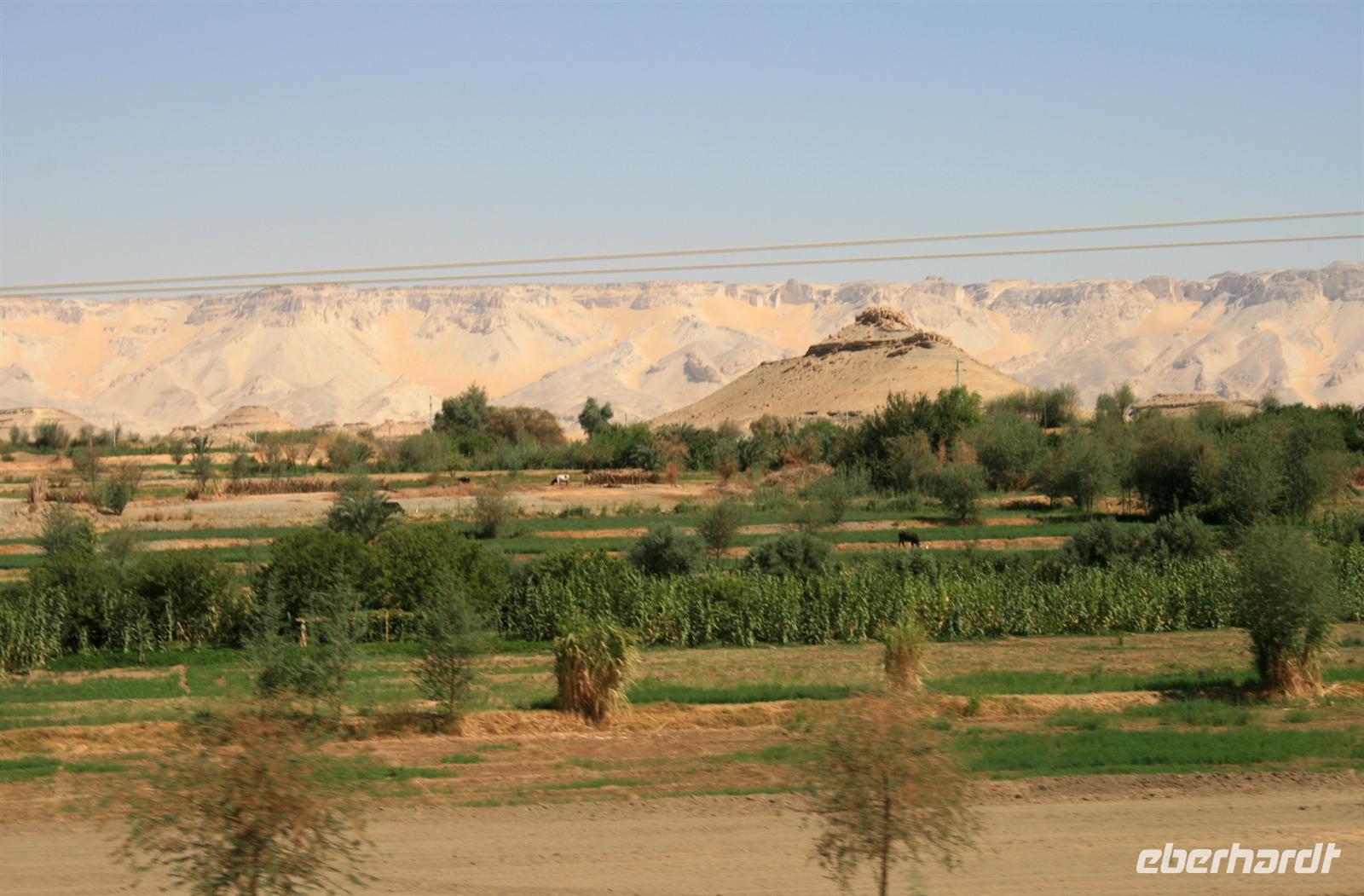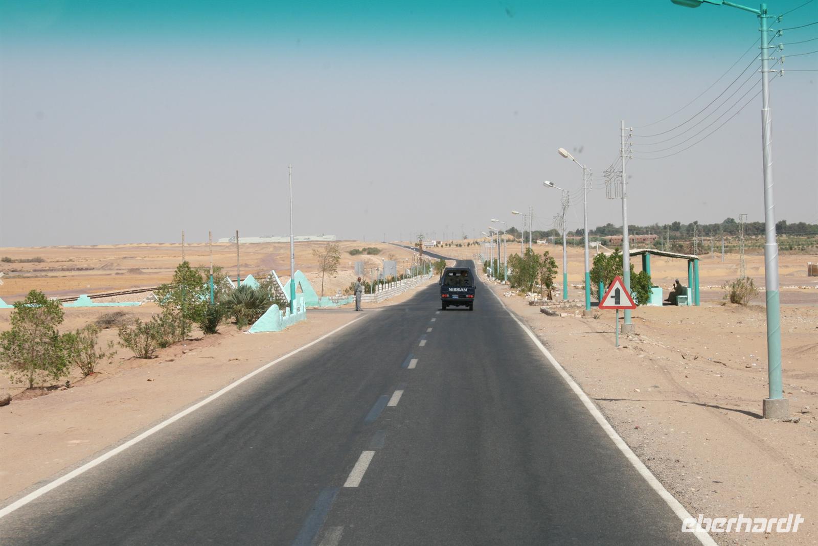 Nach dem Frühstück an Bord verlassen wir unser Kreuzfahrtschiff und steigen in unseren modernen Reisebus um. Jetzt geht es los in die ägyptische Wüste, die genauer gesagt Libysche Wüste heißt. Die Etappe bis zur ersten Oase namens Kharga reisen wir noch mit dem Bus, denn wir bewegen uns heute nur auf der asphaltierten Straße. Wir werden den ganzen Tag von einem Auto der Touristen-Polizei begleitet und passieren viele Kontrollstellen an der Wüstenstraße. Sicherheit wird hier von den ägyptischen Behörden wirklich groß geschrieben.